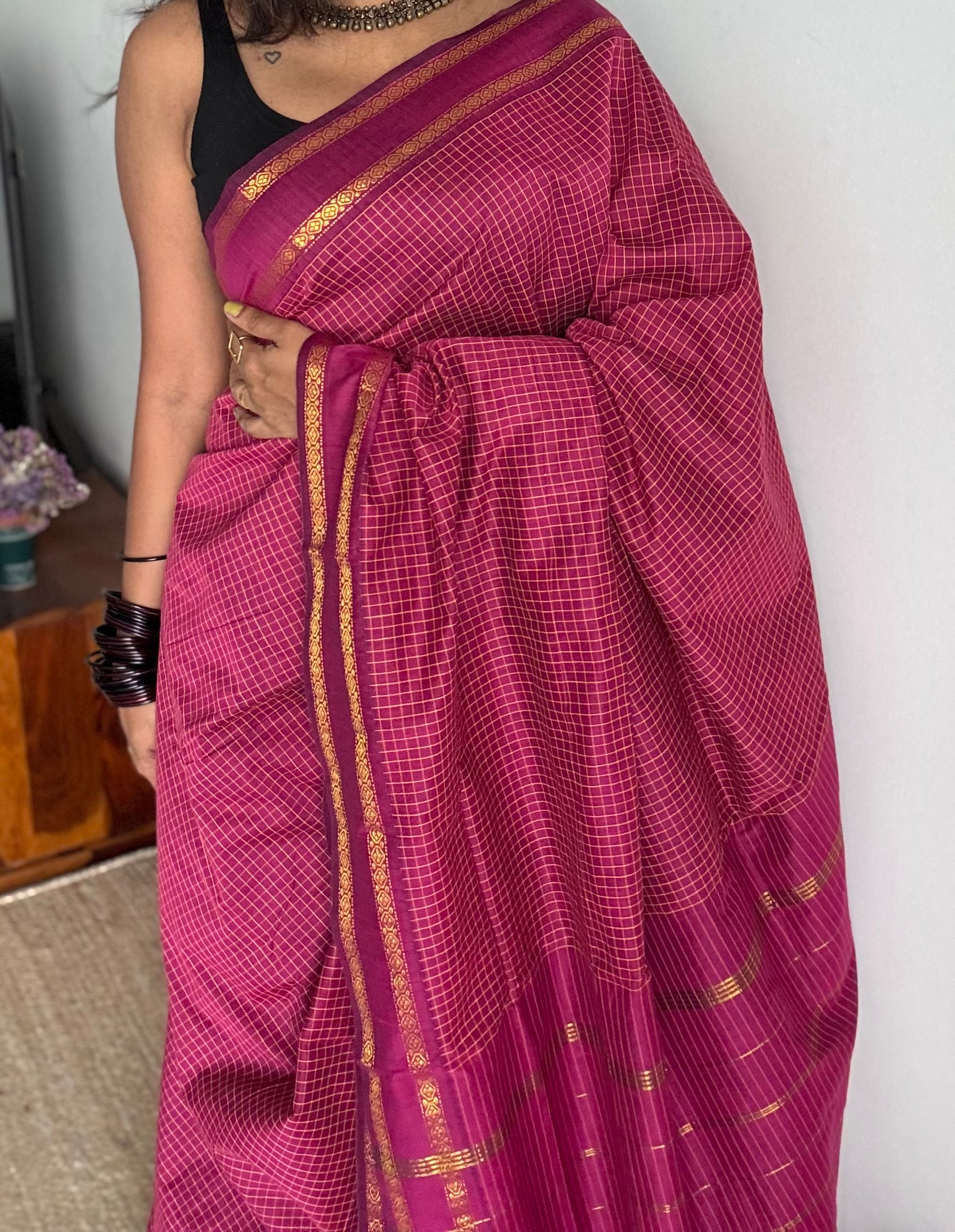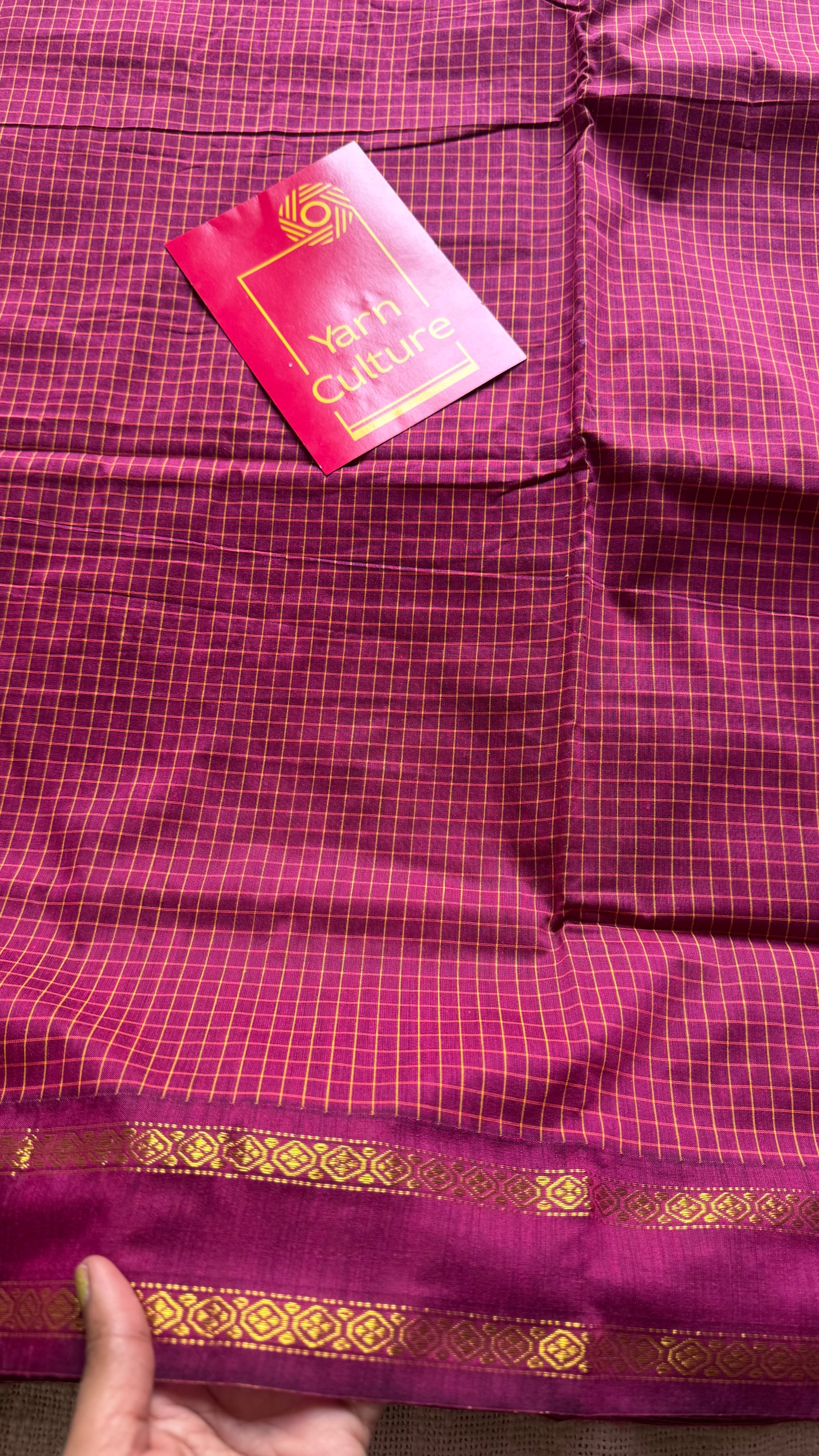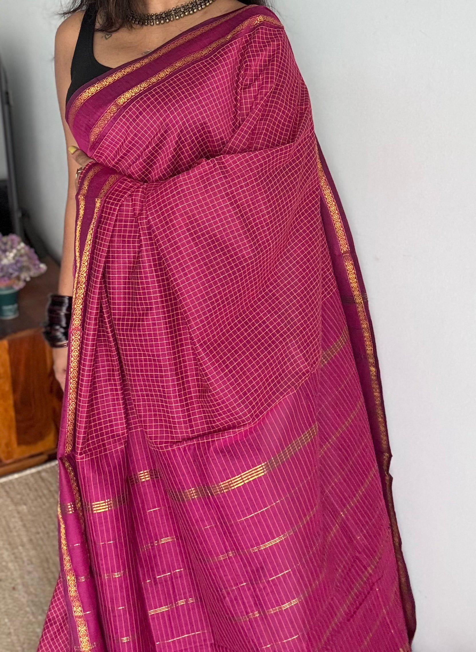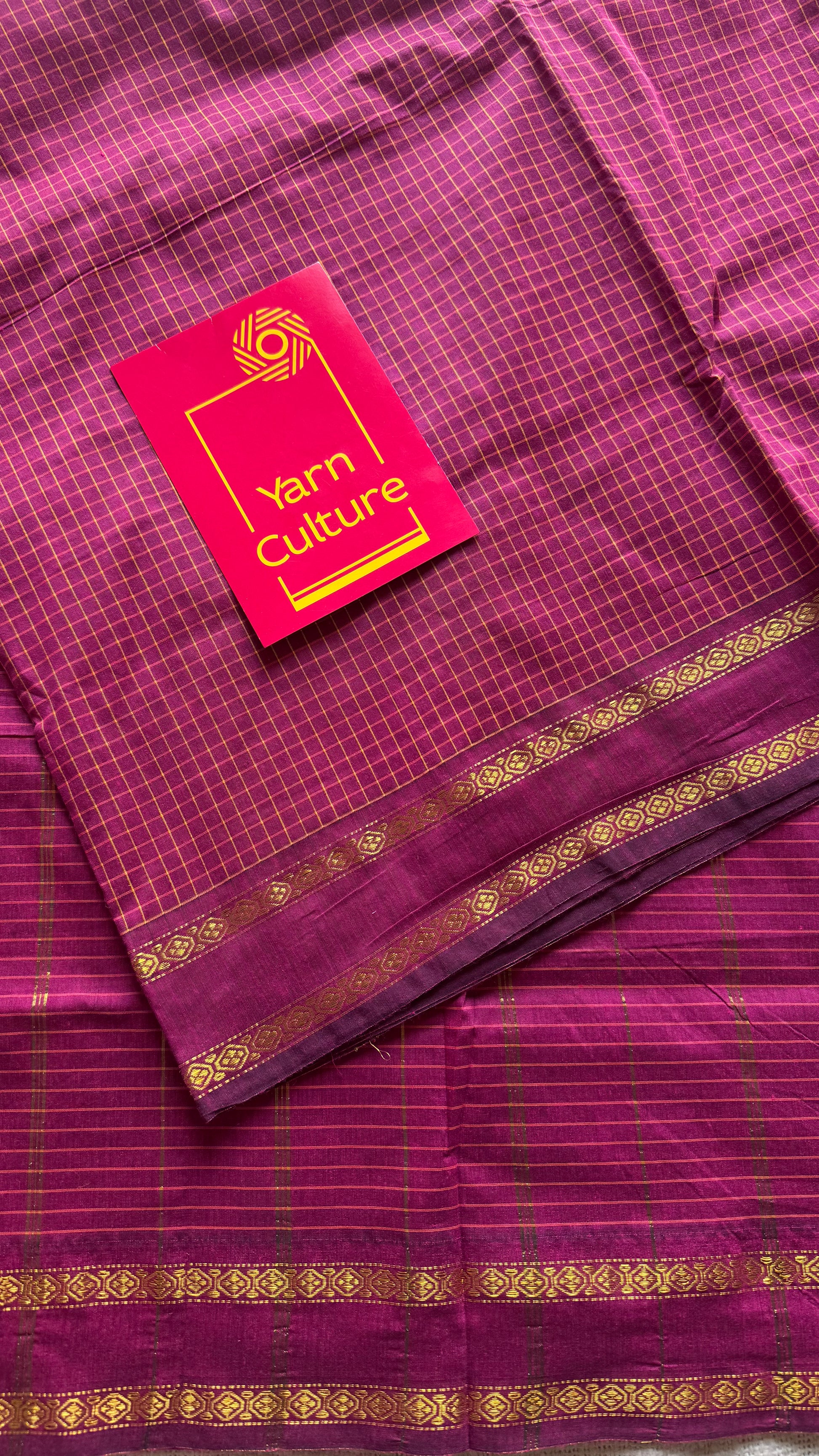 Dark berry pink (light burgundy), arani checks saree, cotton silk - YCCOTNARFE50