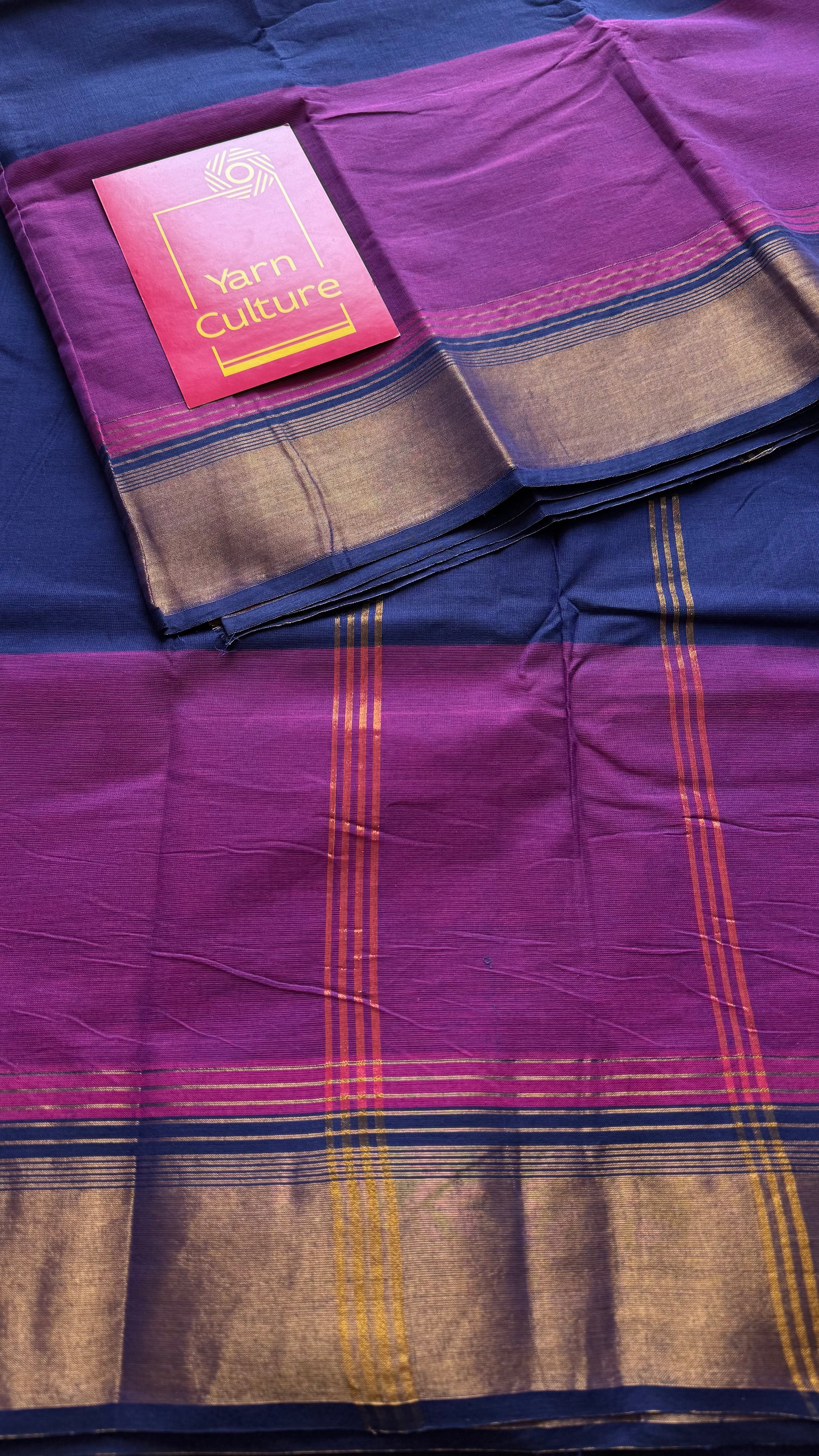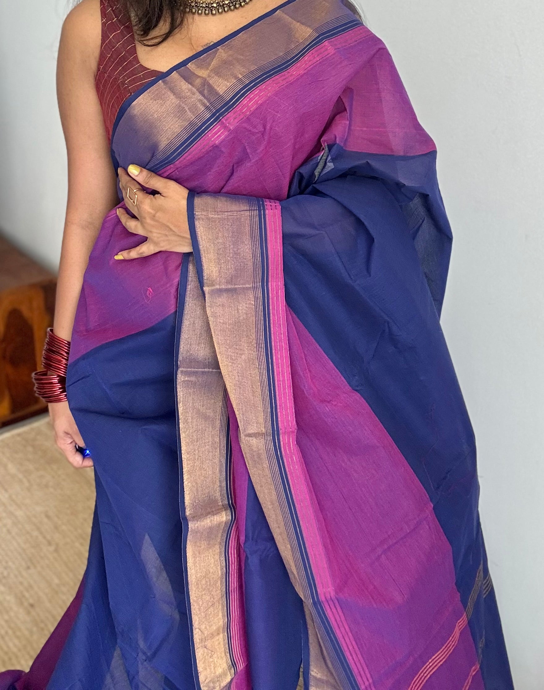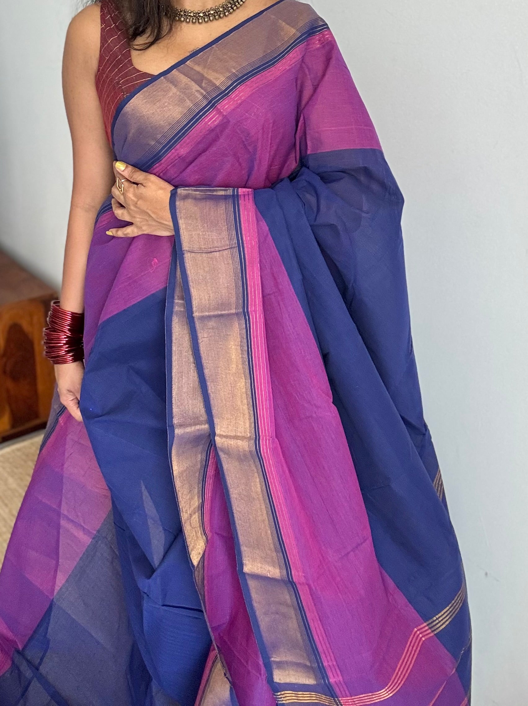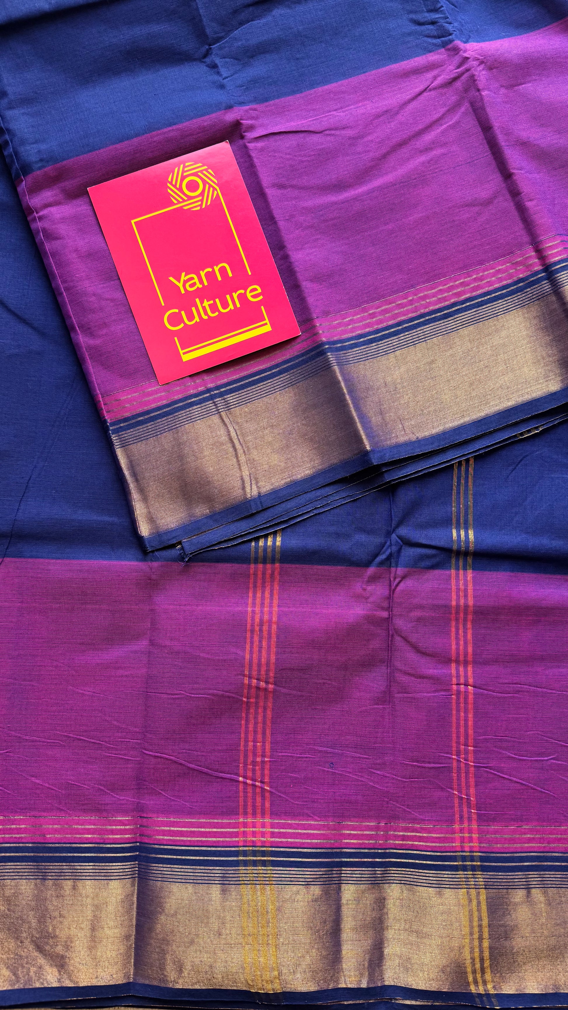 A dark blue and magenta Chettinad cotton saree finished with a subtle antique gold zari border. Lightweight, breathable, and easy to drape, it is perfect for summer wear, everyday elegance, and comfortable all-day use. No blouse.
