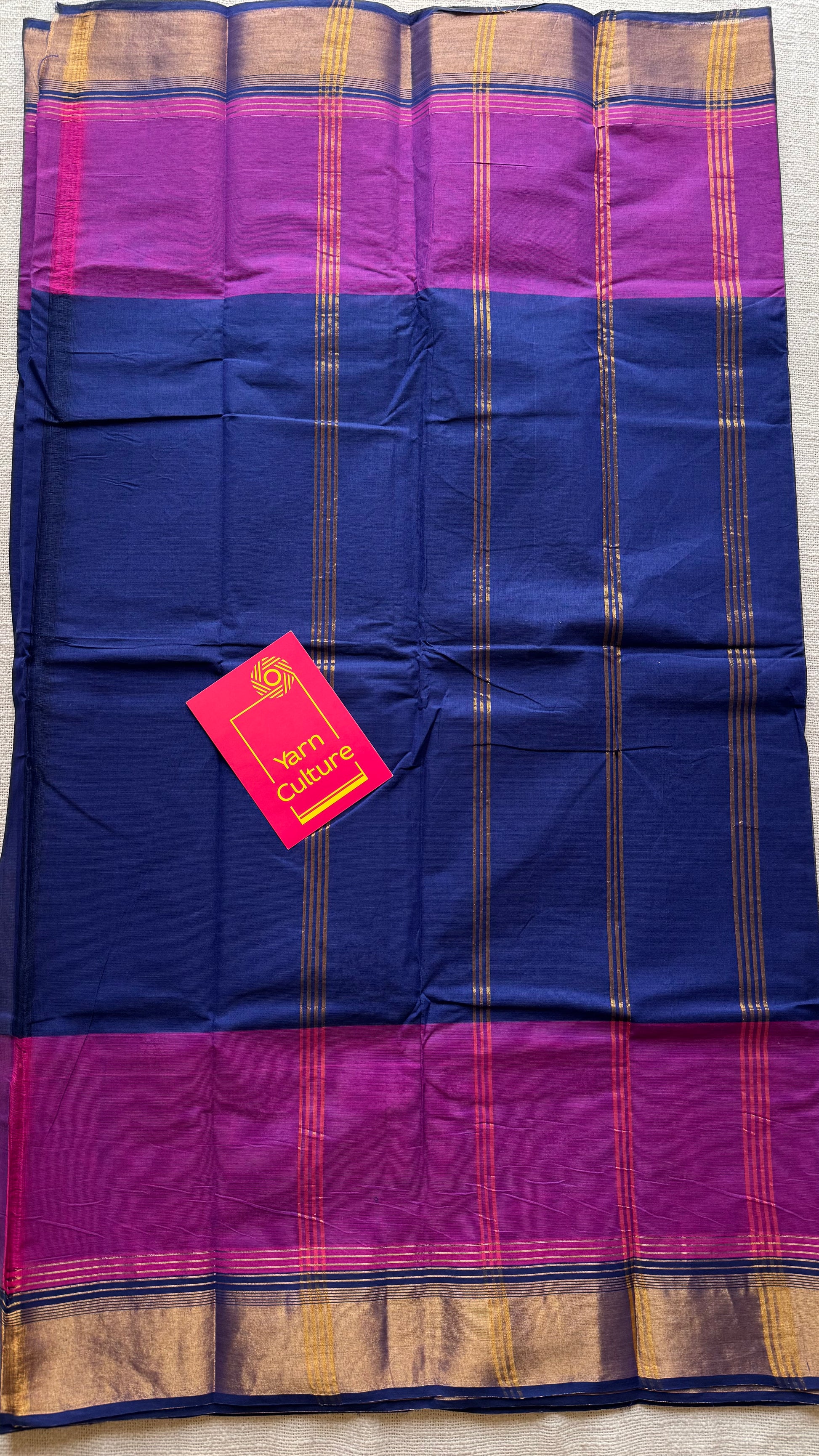 Dark blue and magenta Chettinad cotton saree with antique gold zari border - YCCOTNCCFE154
