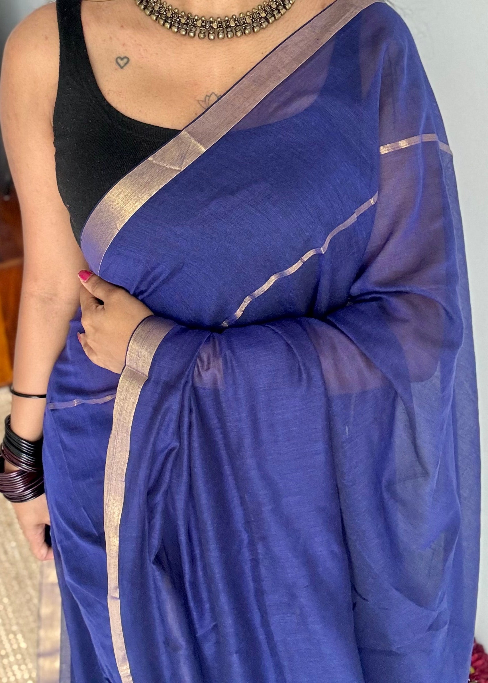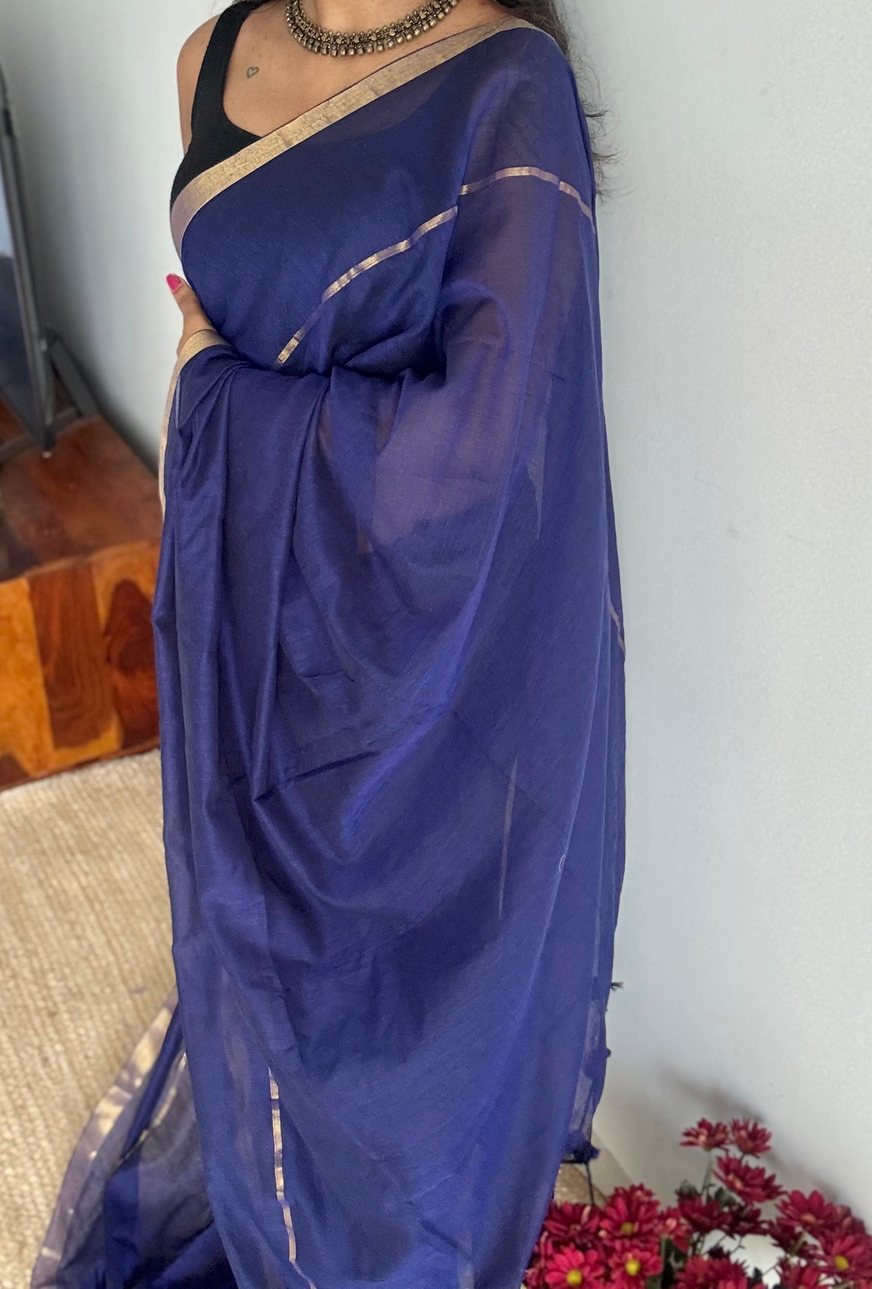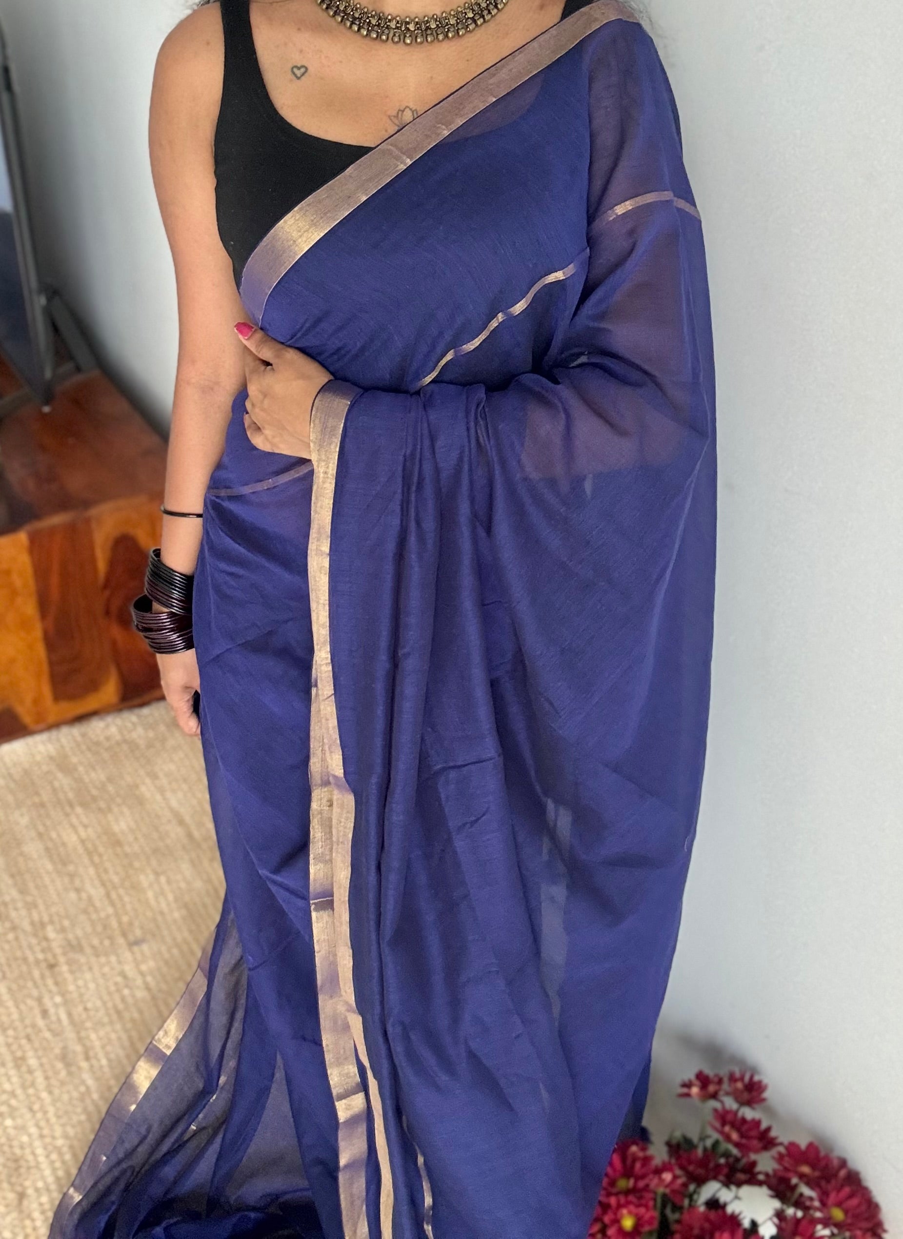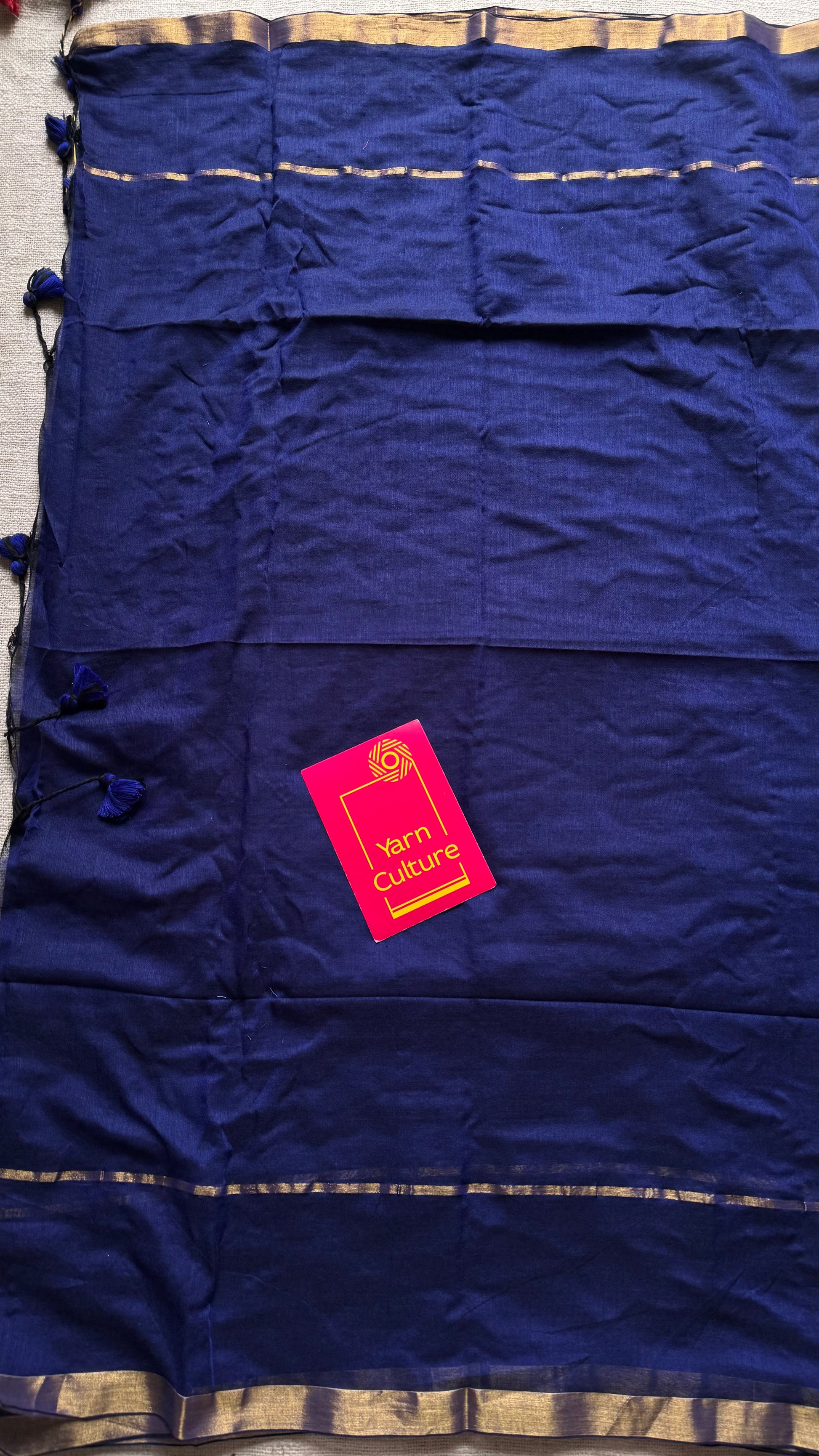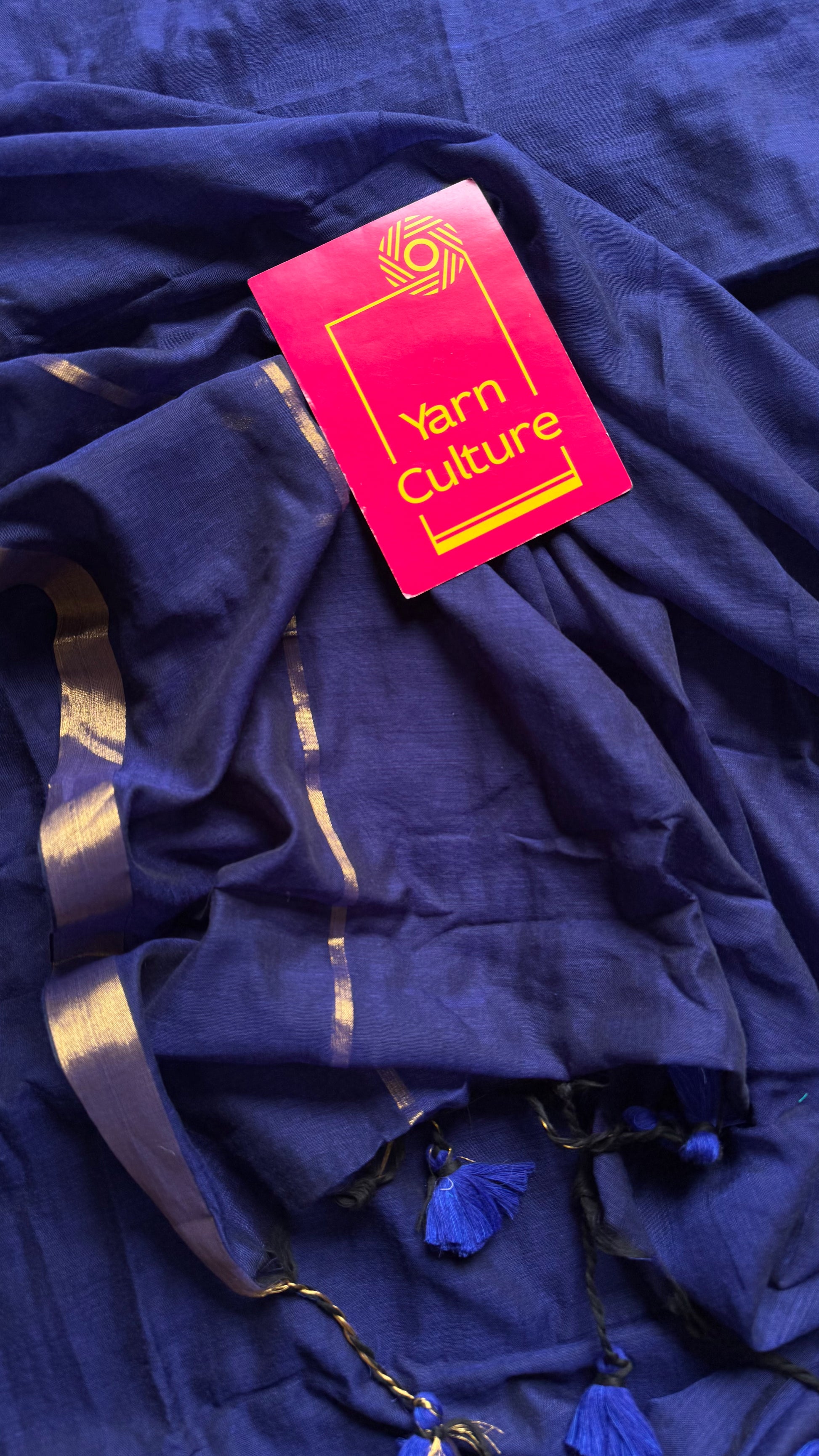 Everybody's favourite mul cotton in dark blue with antique gold zari in gap border pattern and with tassels.