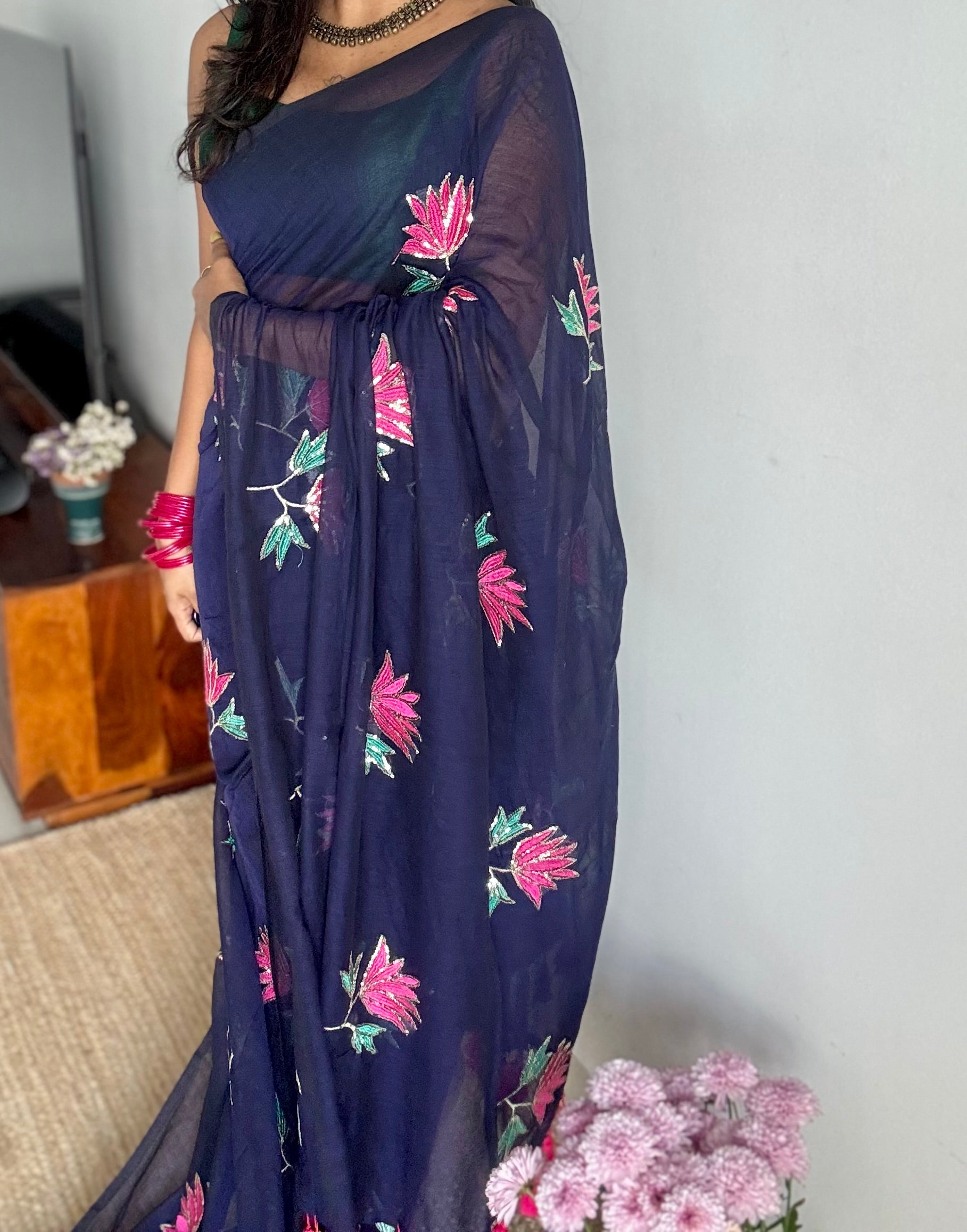 Dark blue mul with lotus sequin embroidery - YCBCMCNO66