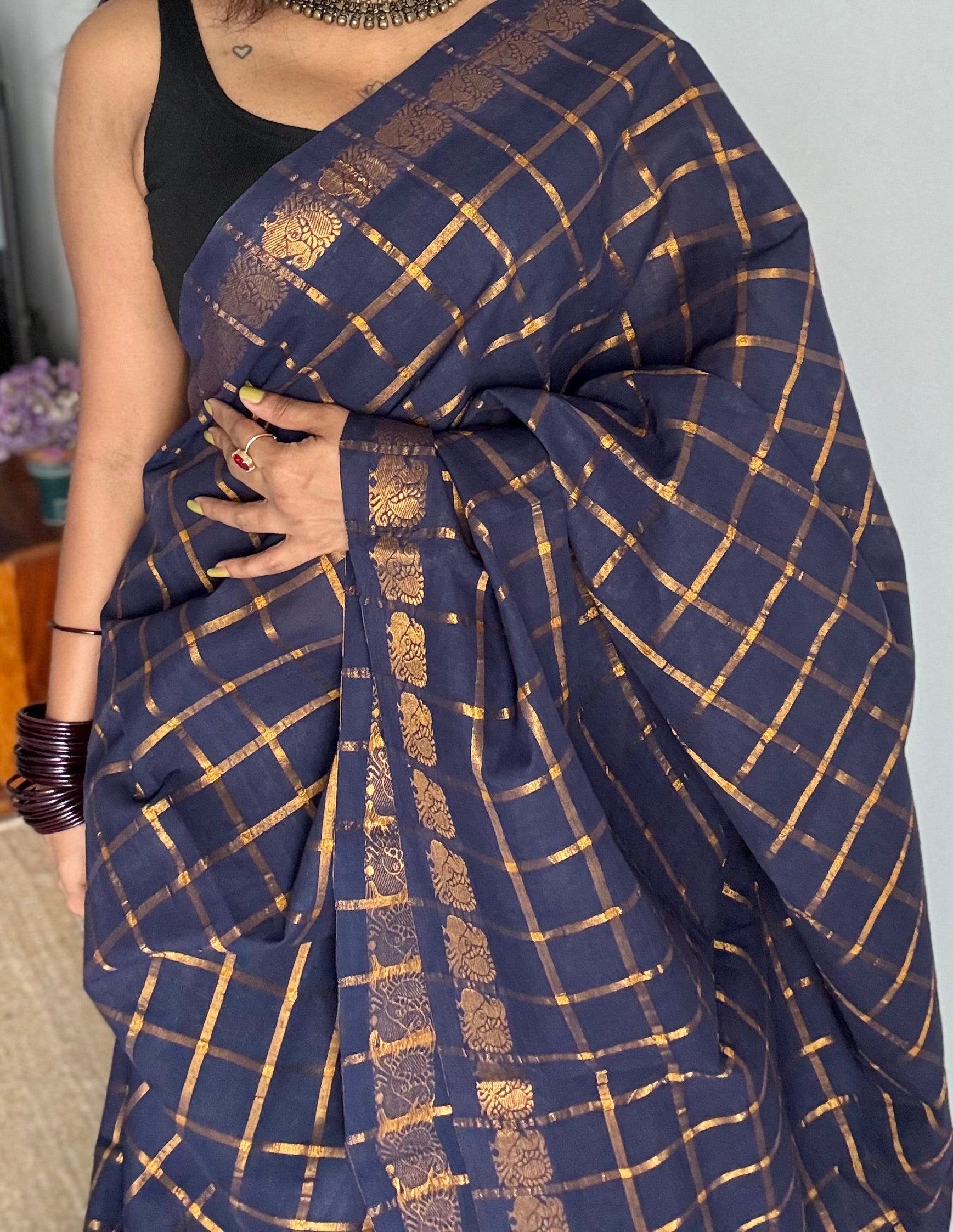 Dark blue Madurai cotton saree featuring pavithra kattam checks, dyed using the traditional Kattuchayam technique. Comes with blouse fabric. Colour of the blouse may vary as per availability.