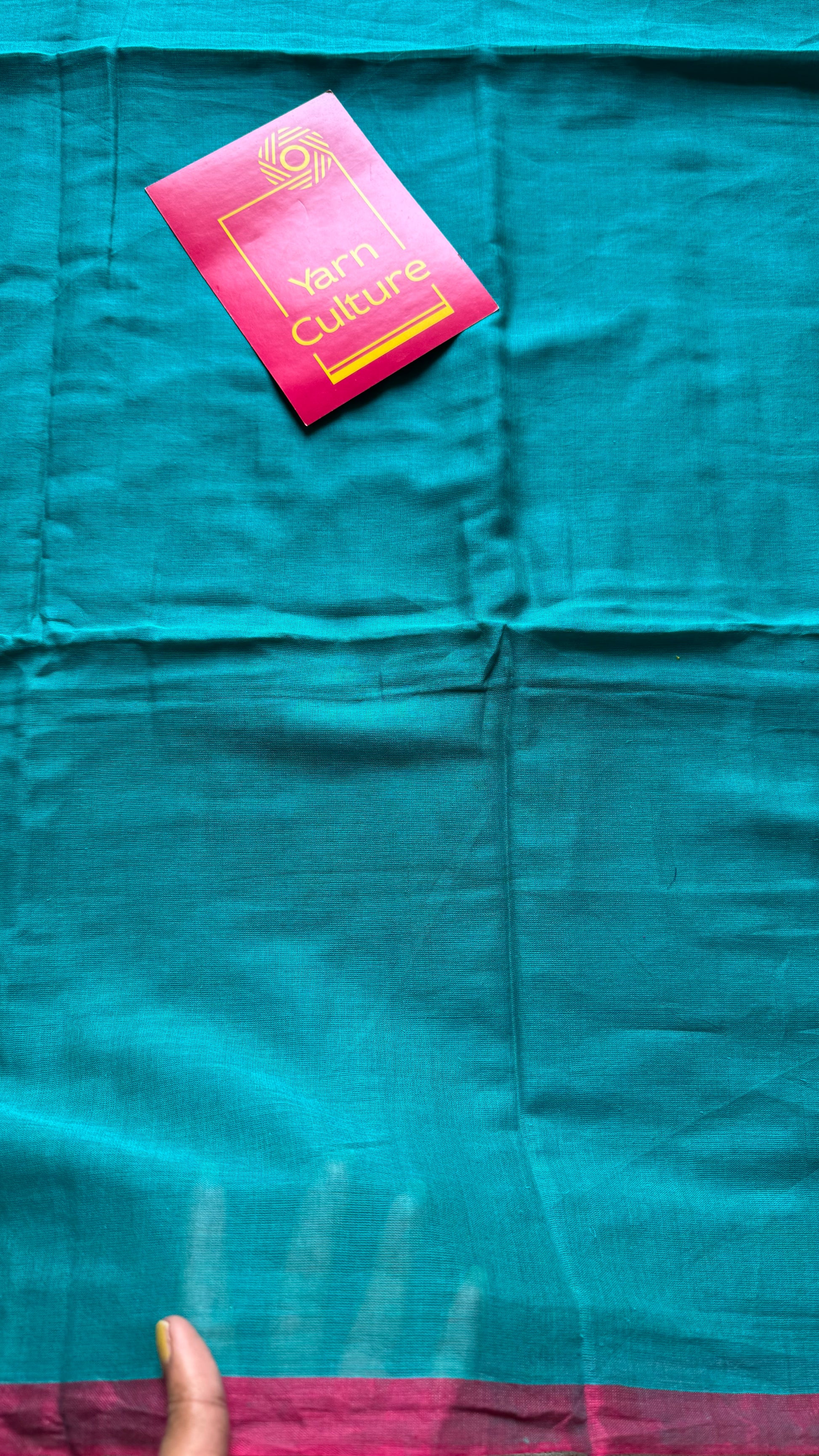 A striking dark cyan mul cotton saree paired with a rich ruby red border. Lightweight, breathable, and soft, it is perfect for summer wear, everyday styling, and effortless draping.