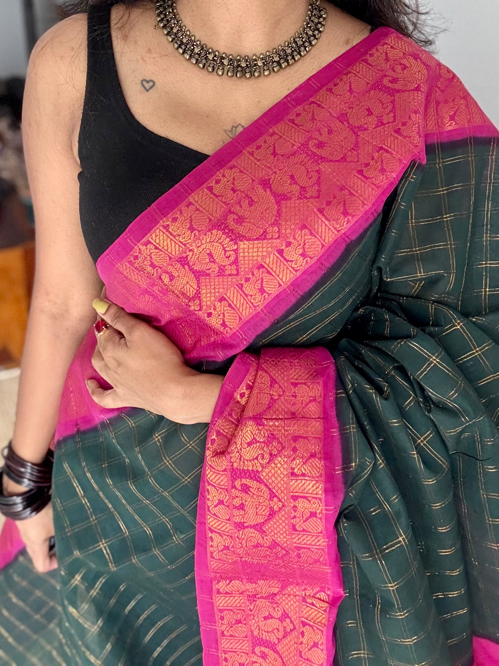 Dark green with magenta checks, kattuchayam dyed, madurai cotton, with contrast blouse fabric 💖