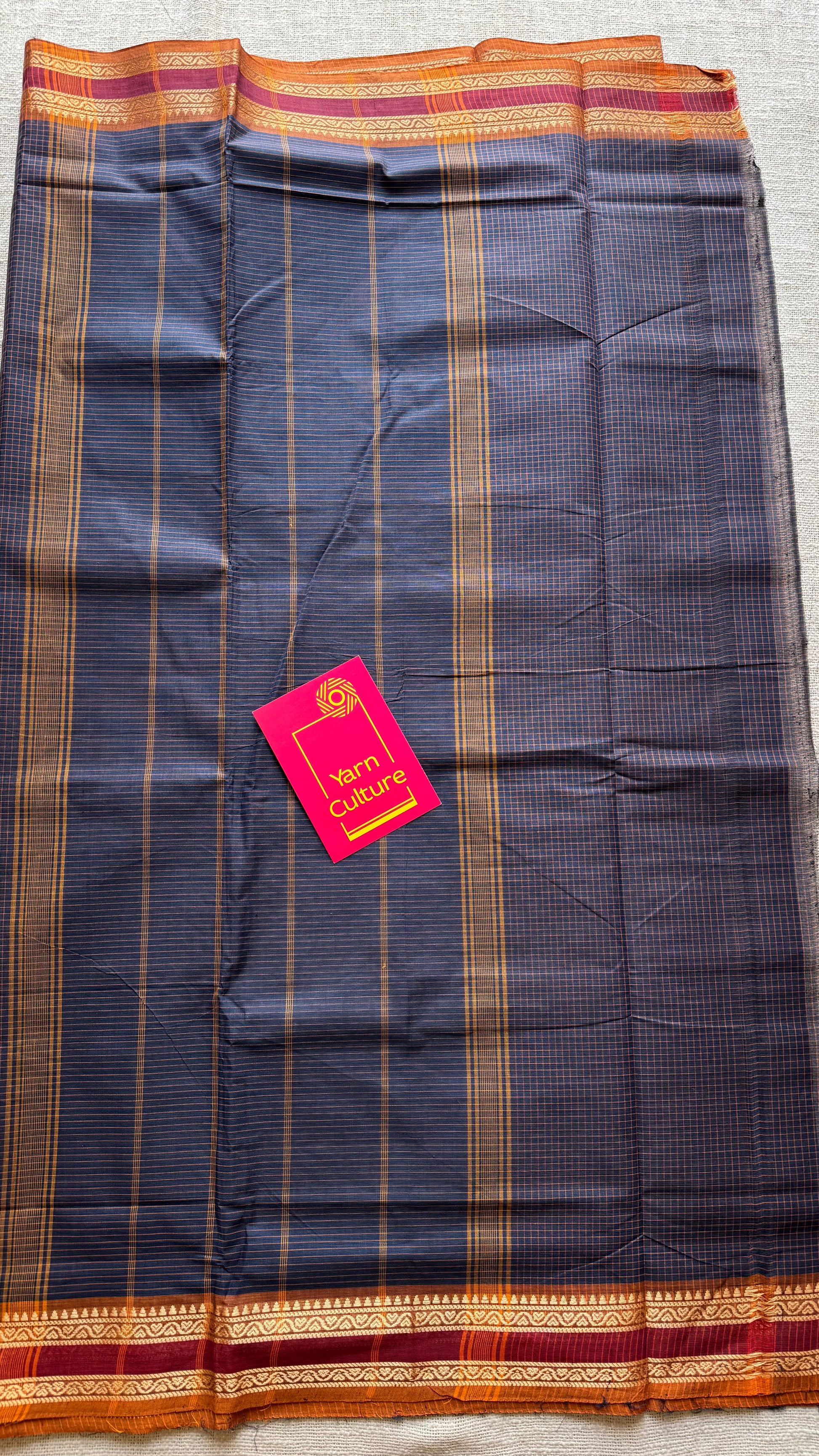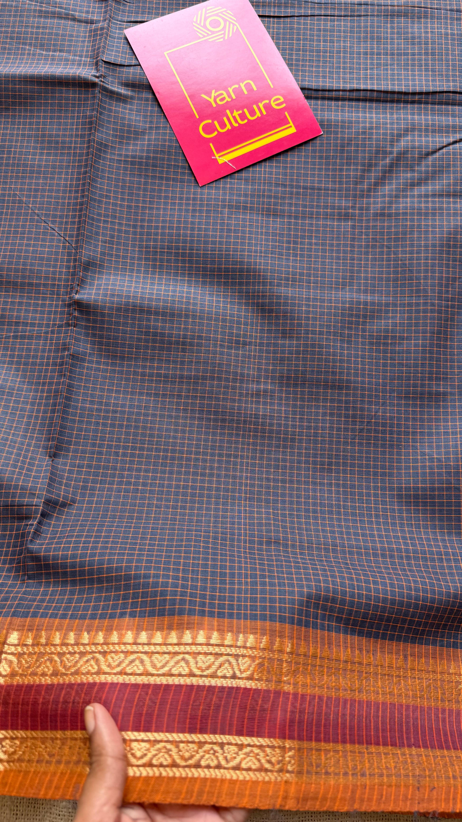 A classic dark grey Chettinad cotton saree woven with subtle yellow mini checks and a woven thread border of orange and red. Lightweight, breathable, and easy to drape, it is perfect for summer days, office wear, and everyday comfort. No blouse.