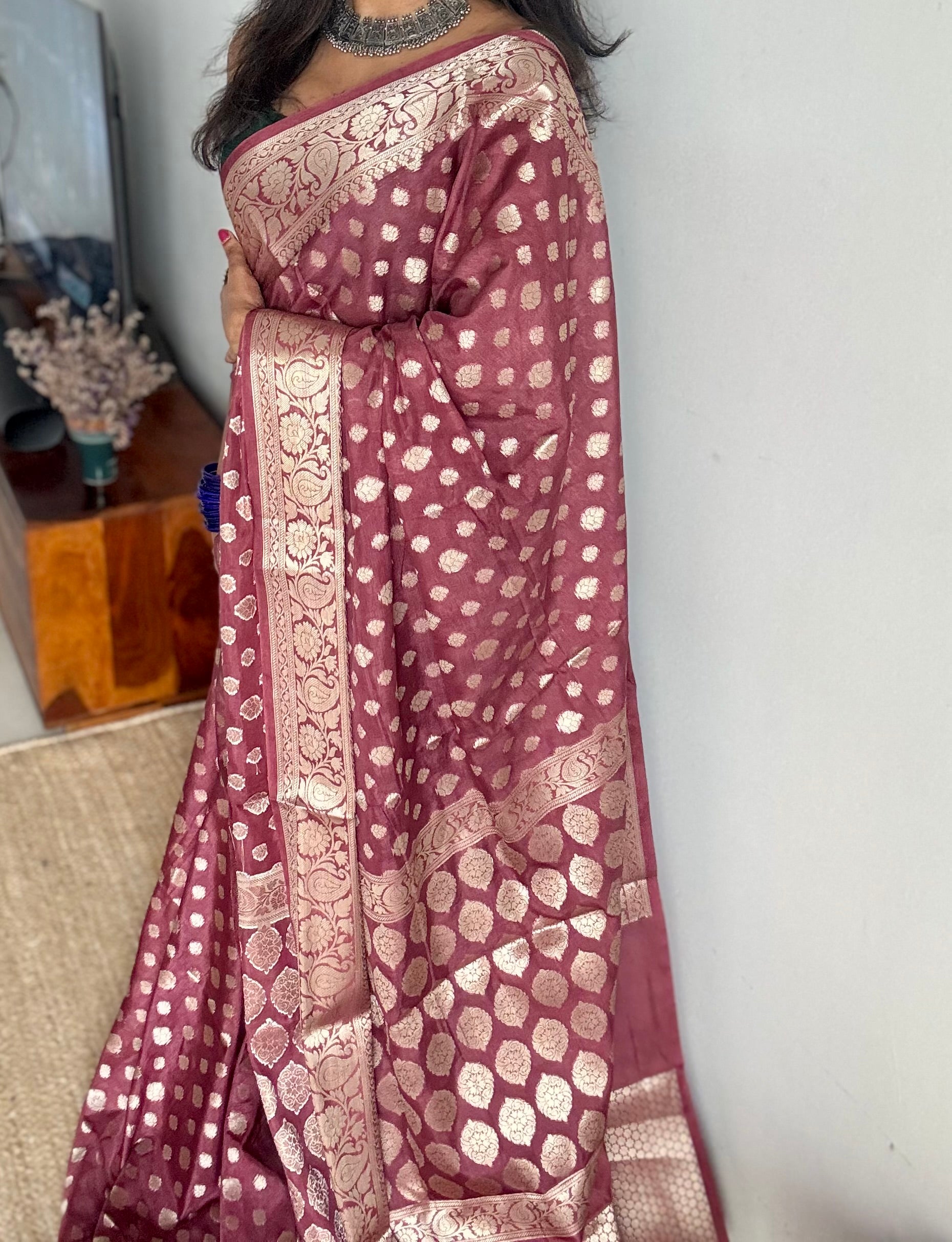 Dark mauve, silver buttas and zari, Banarasi semi-silk with georgette mix - festive, and perfect for Diwali or any occasion. Intricate pallu and blouse fabric. Effortless to drape, flowy, light to carry, and rich in look, this is a saree made to shine with you this season.