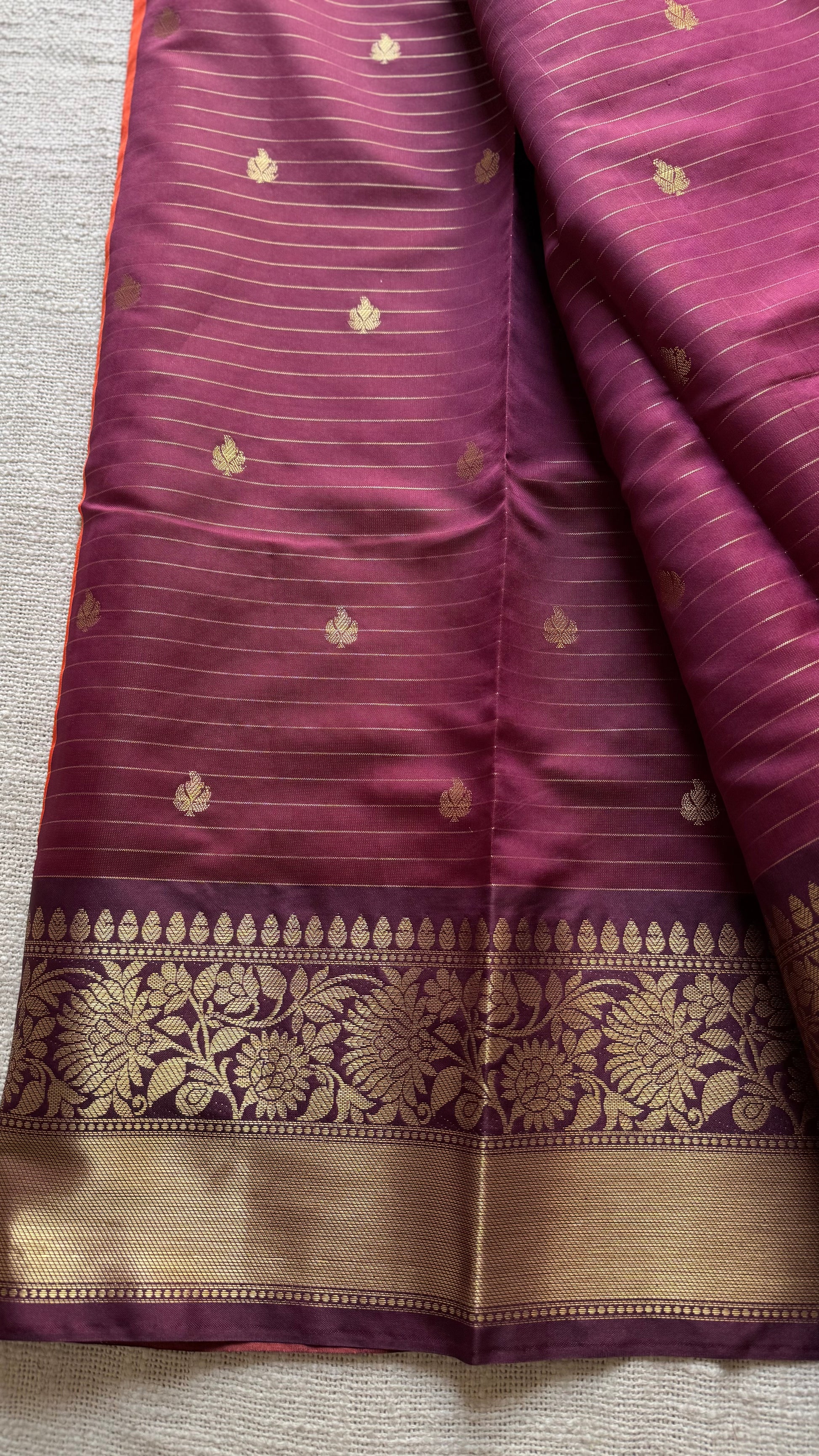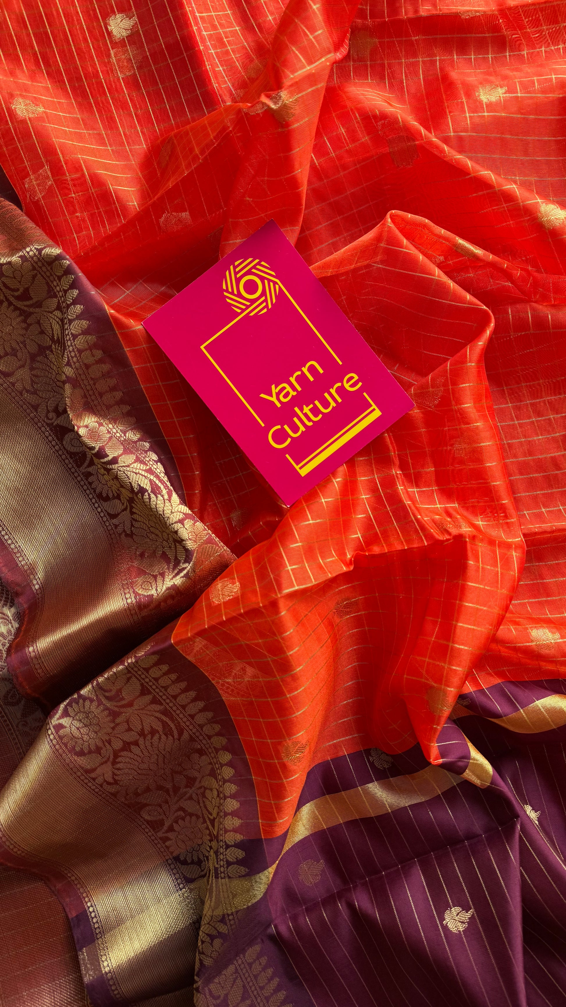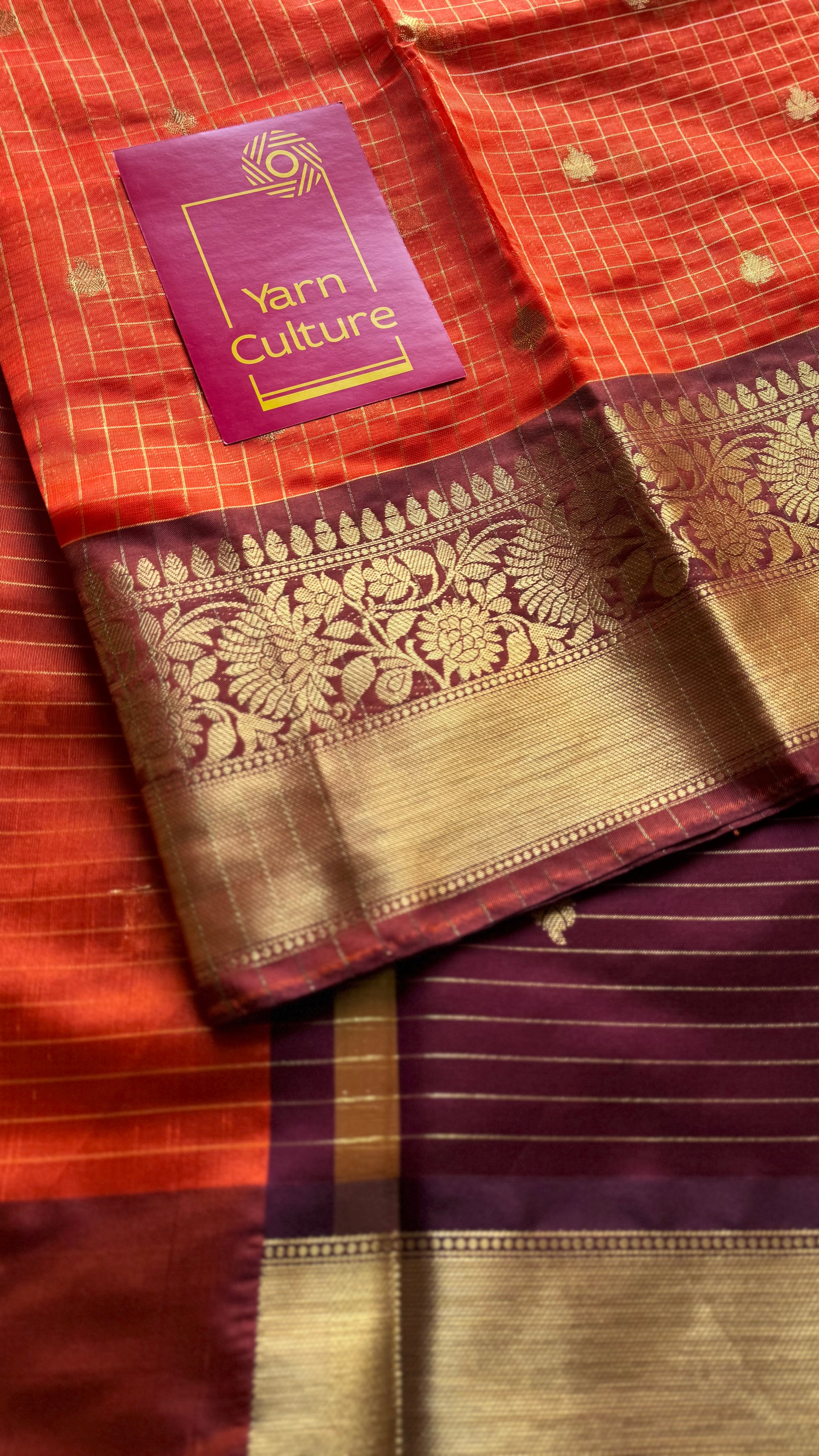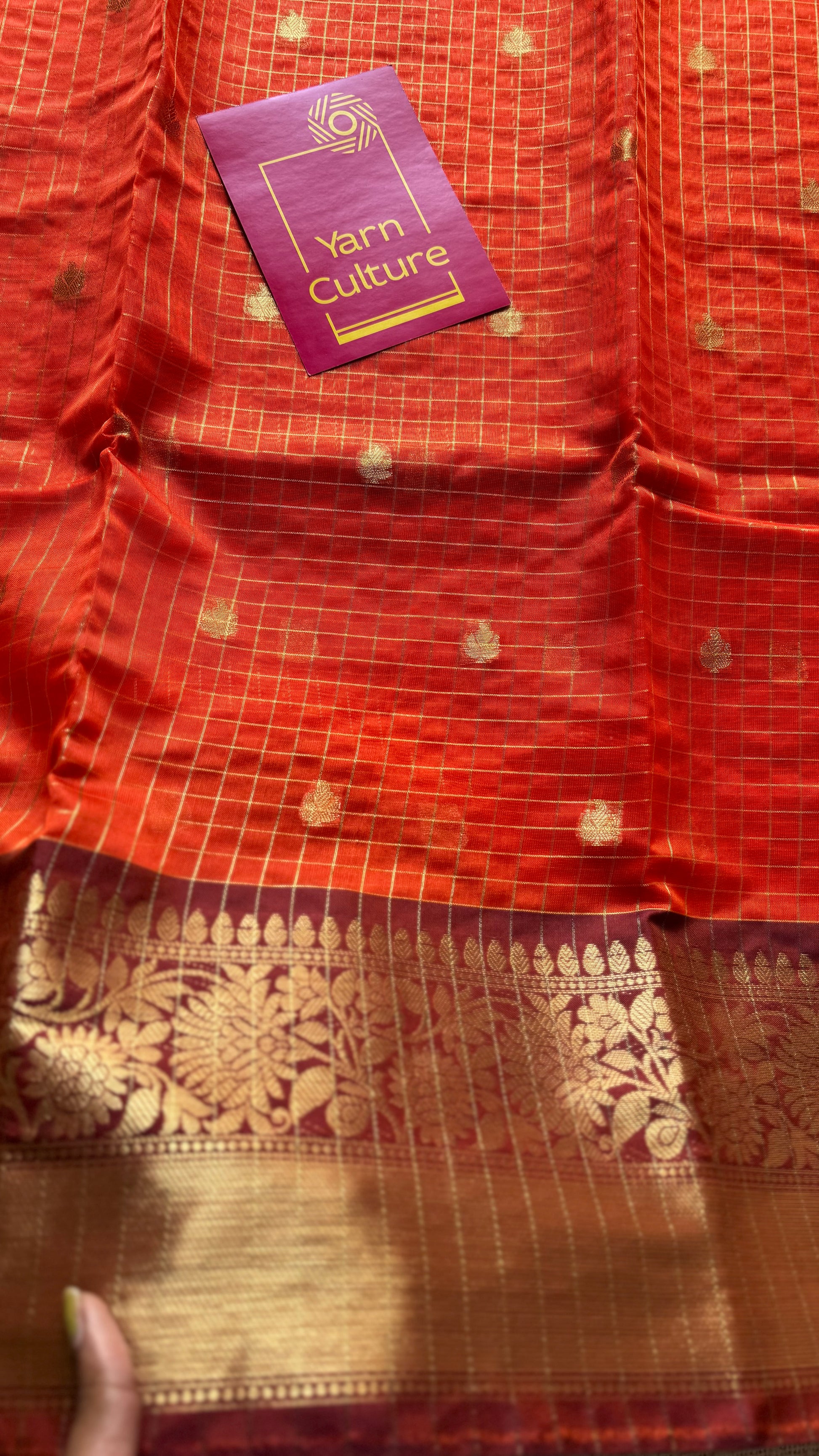 Dark orange with coffee brown, semi tissue silk, checkered body, gold zari buttas, contrast blouse and pallu. Effortless to drape, light to carry, and rich in look, this is a saree made to shine with you this season.