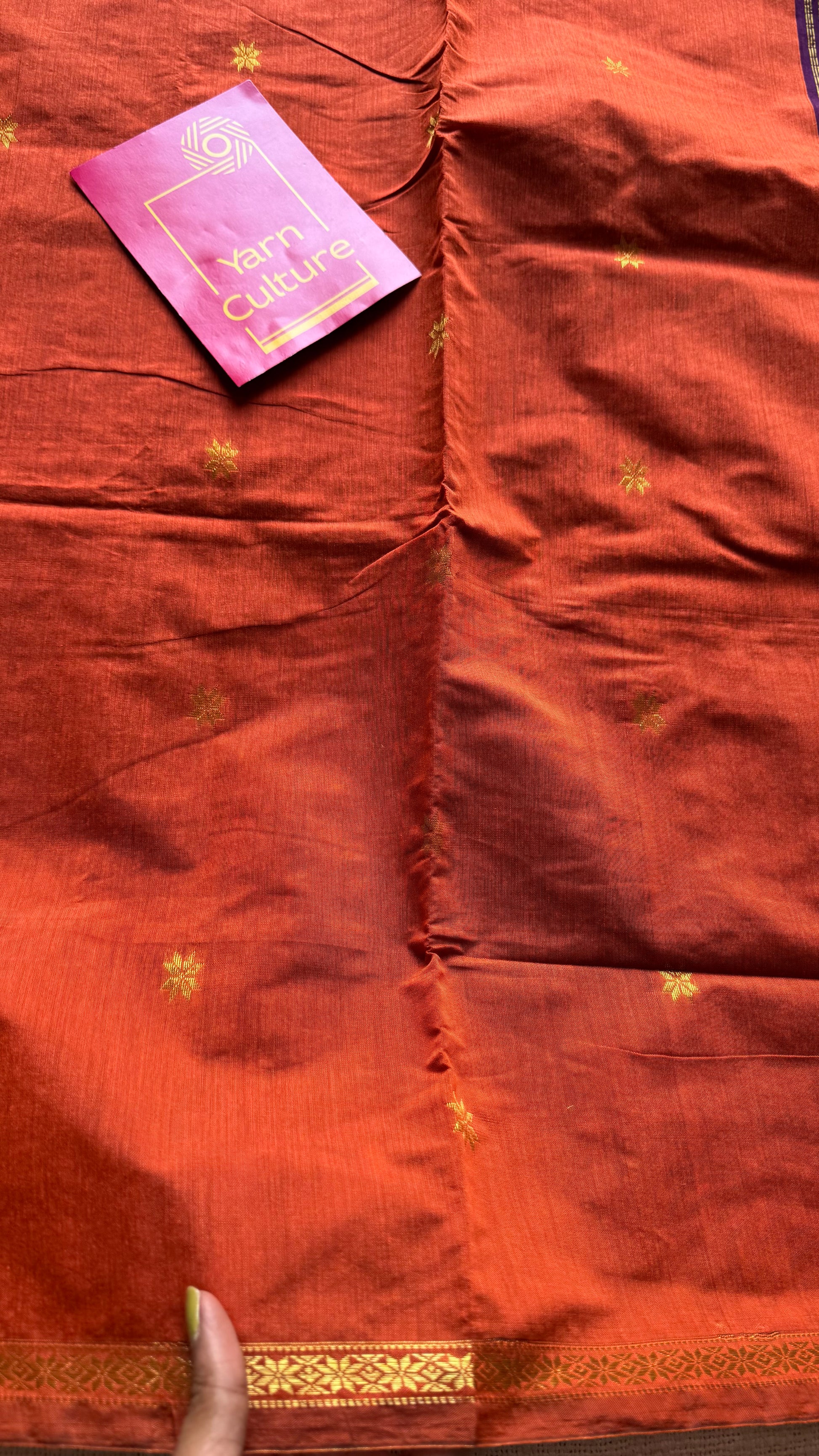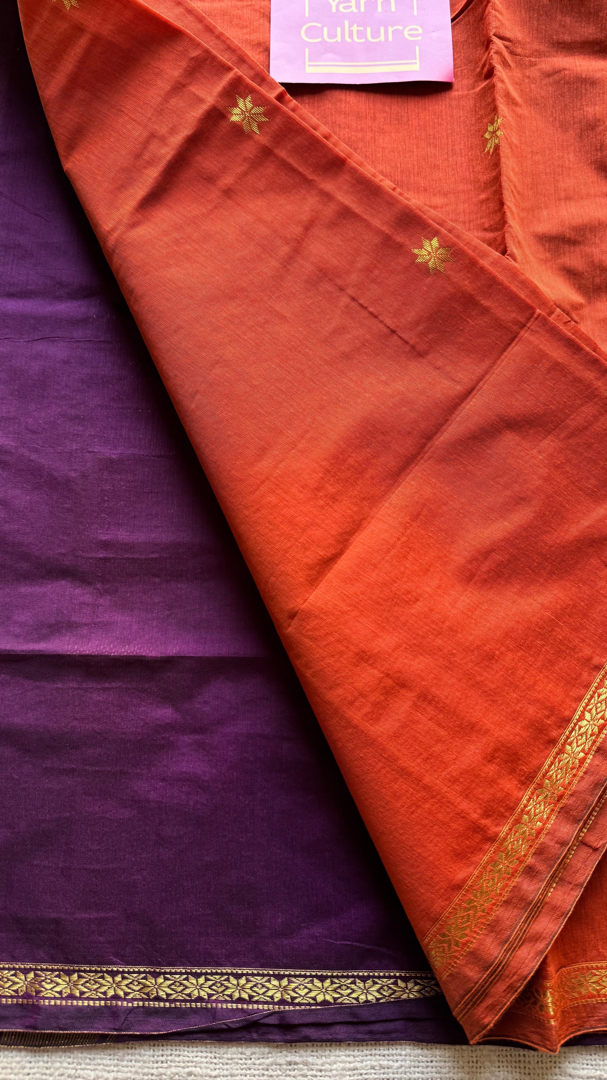Dark orange with purple wine, gold buttas, semi maheshwari cotton silk - YCCOTNCSDE91