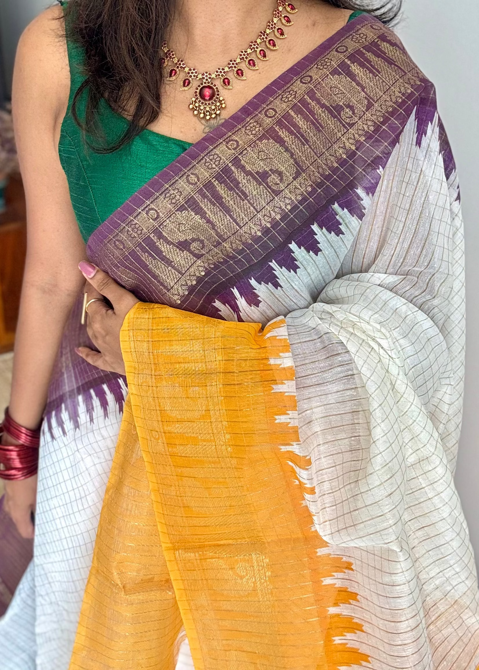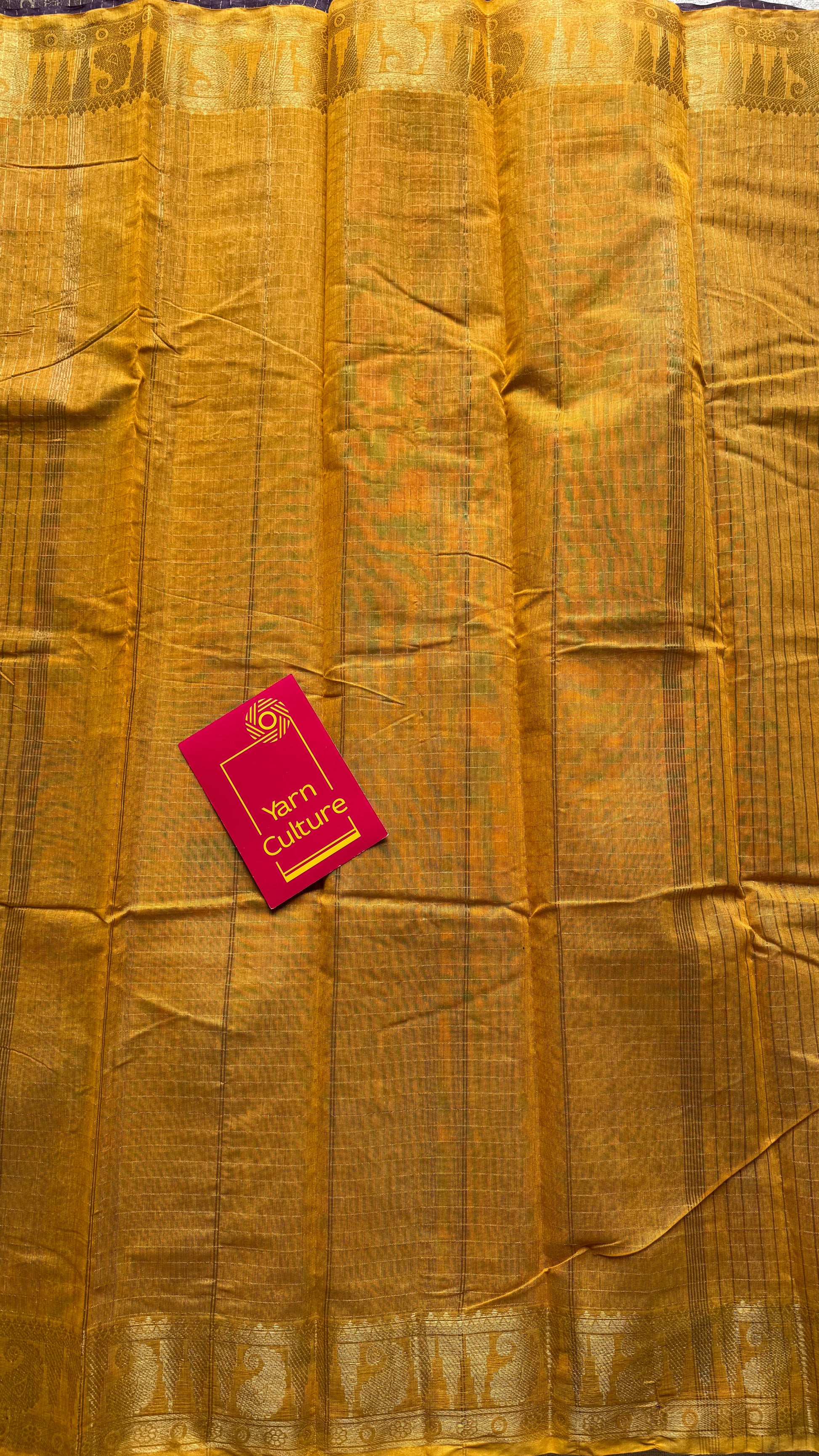 Soft Madurai Sungudi cotton with classic kattam checks and a unique dual border - deep violet on one side and golden yellow on the other. You can drape it either way, choosing which side becomes the pallu and which becomes the blouse.