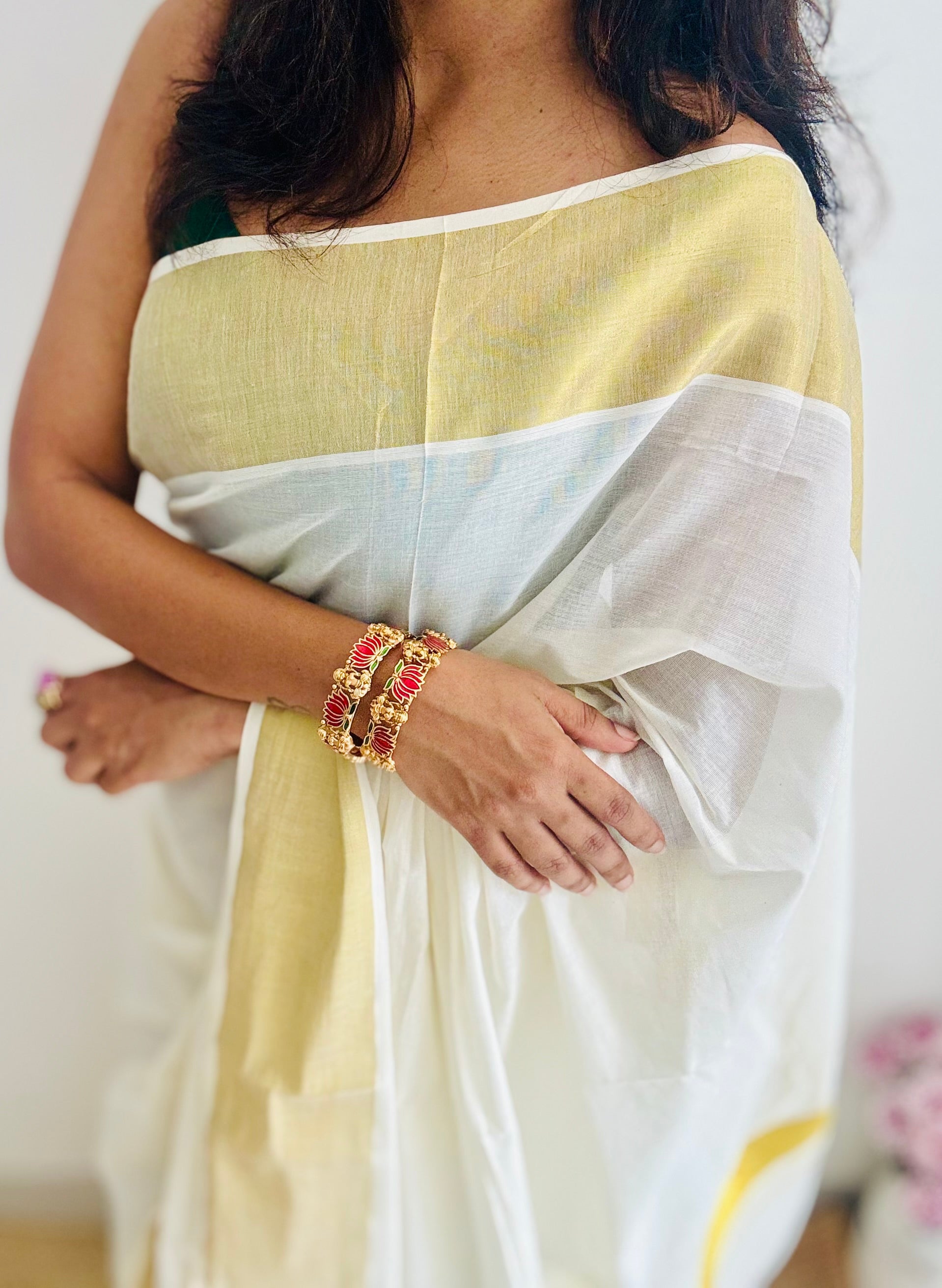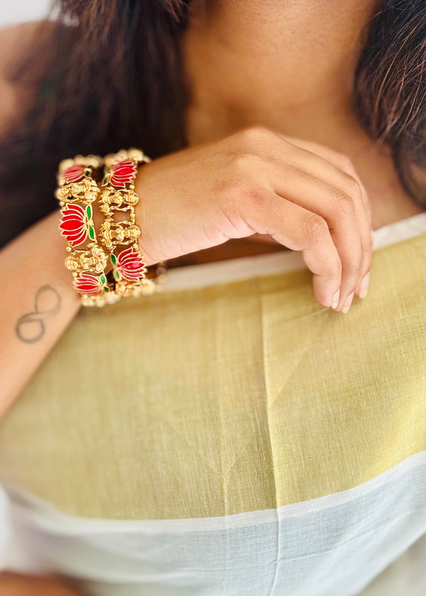 These temple design-inspired antique gold lotus bangles are perfect for that traditional attire.