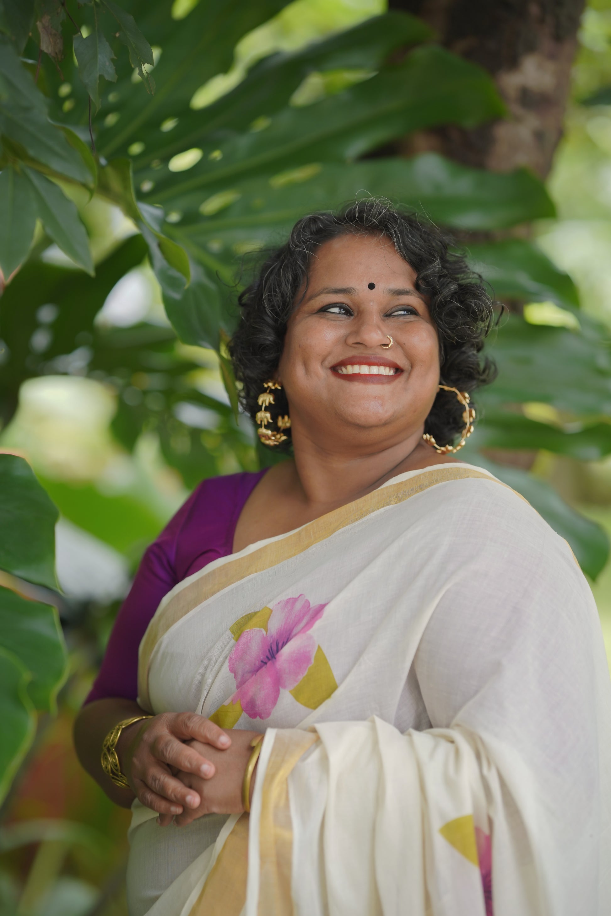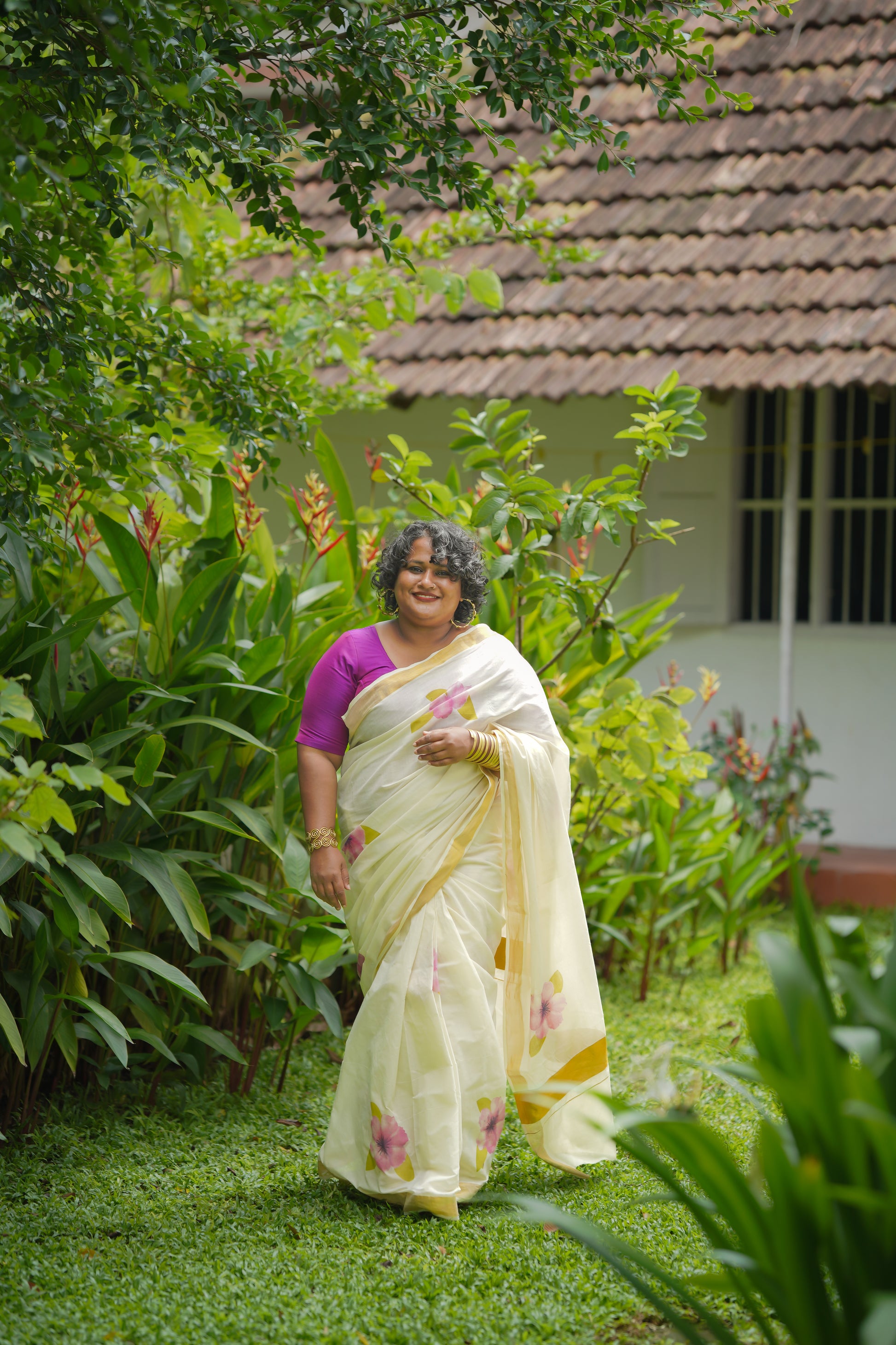 Deepa: A soft ivory saree painted with purple hibiscus blooms - minimal yet striking. It’s cheerful, vibrant, and full of life, just like Deepa. She brings her own kind of energy to this drape, making it feel perfect for Onam and beyond.