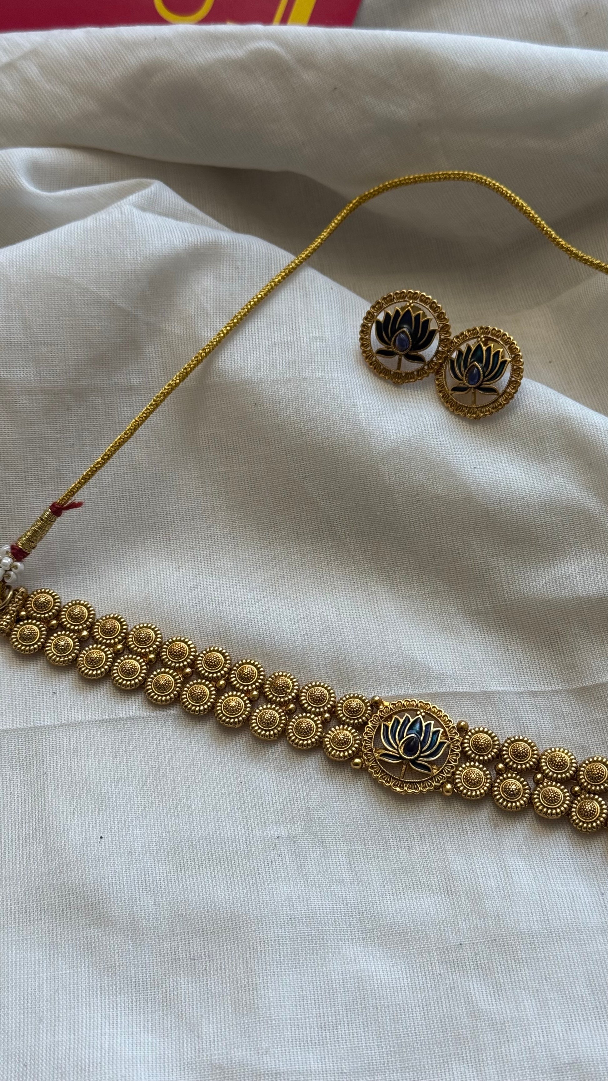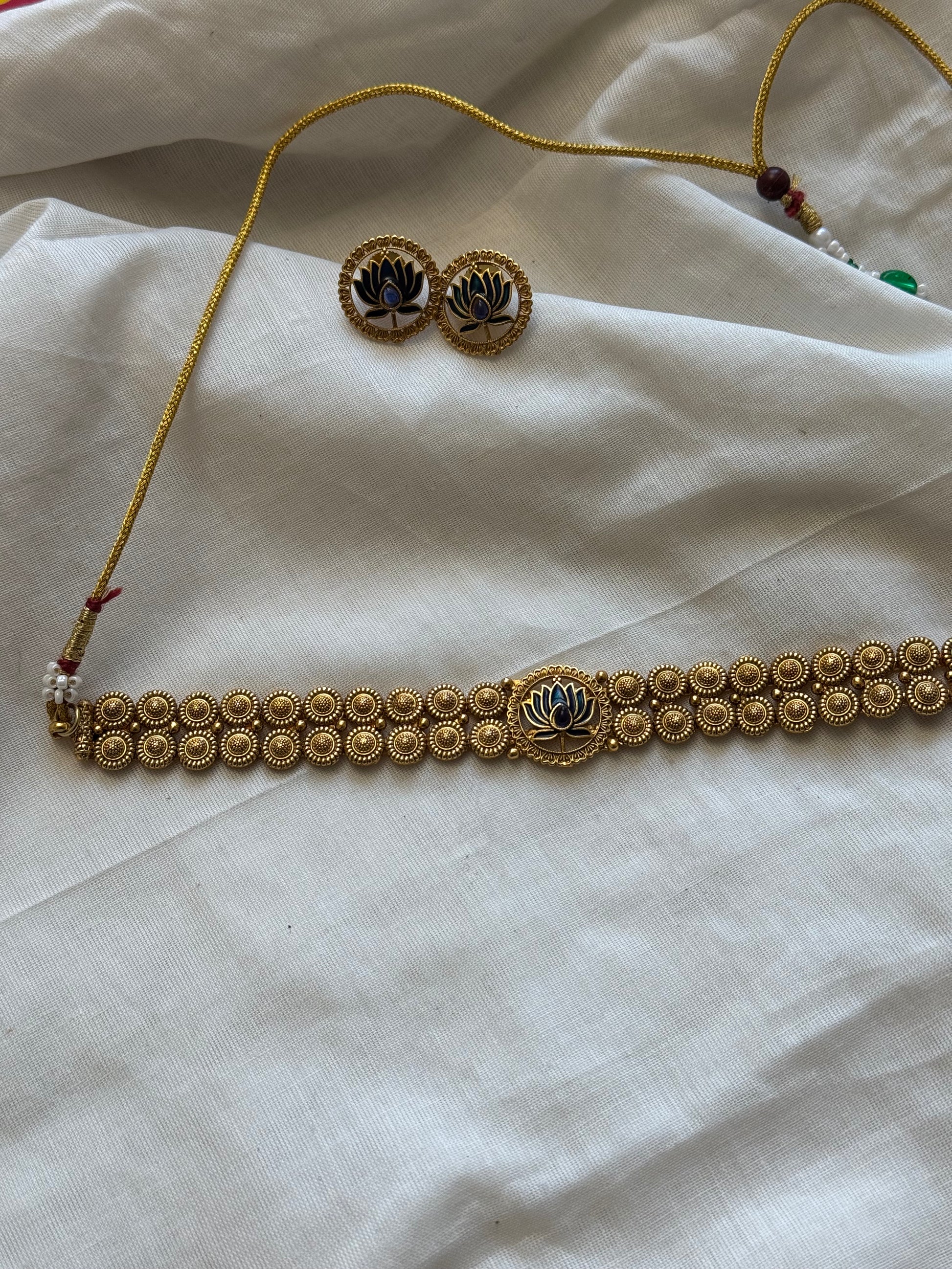 Double layered coin neckpiece with blue lotus pendant, with earrings.