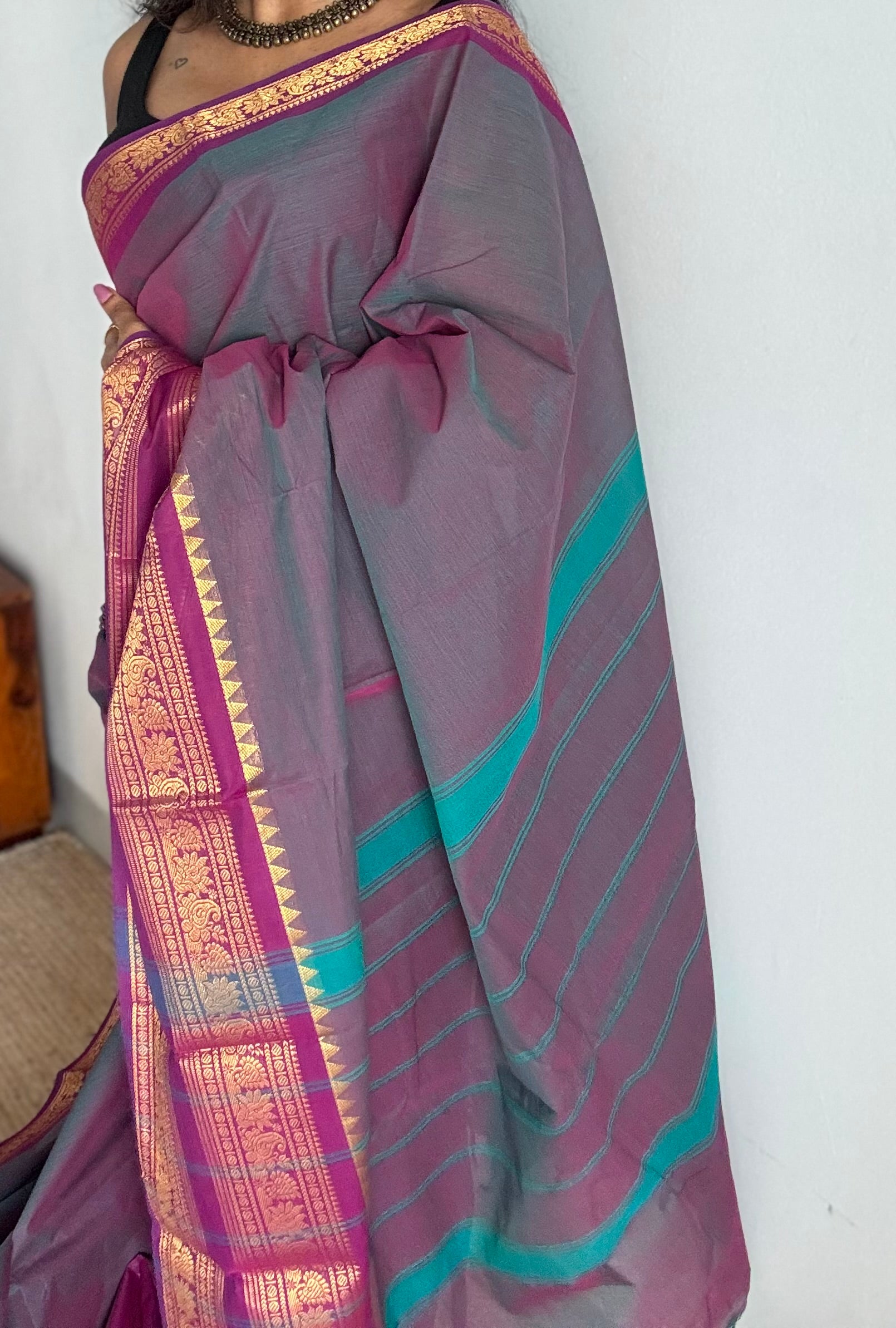 A rare and pretty combination of dual tone grey with magenta kanchi cotton with an elaborate intricate border.
