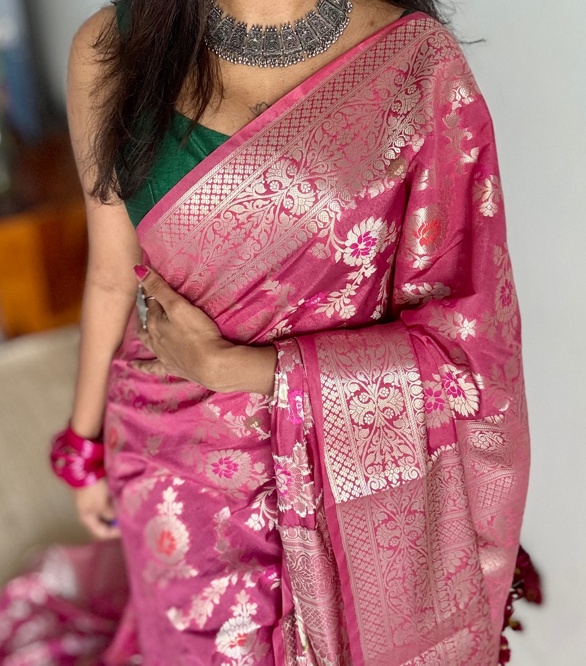Dusty pink Banarasi katan dupion silk with floral meenakari pattern in silver zari - festive, timeless, and perfect for Diwali. Intricate pallu and blouse fabric. Effortless to drape, light to carry, and rich in look, this is a saree made to shine with you this season.
