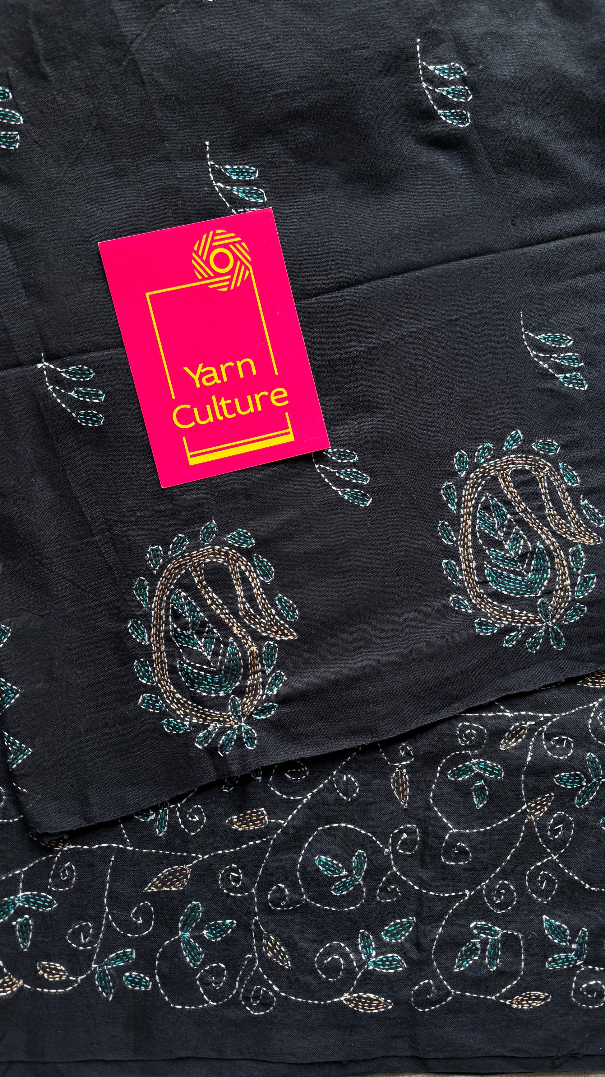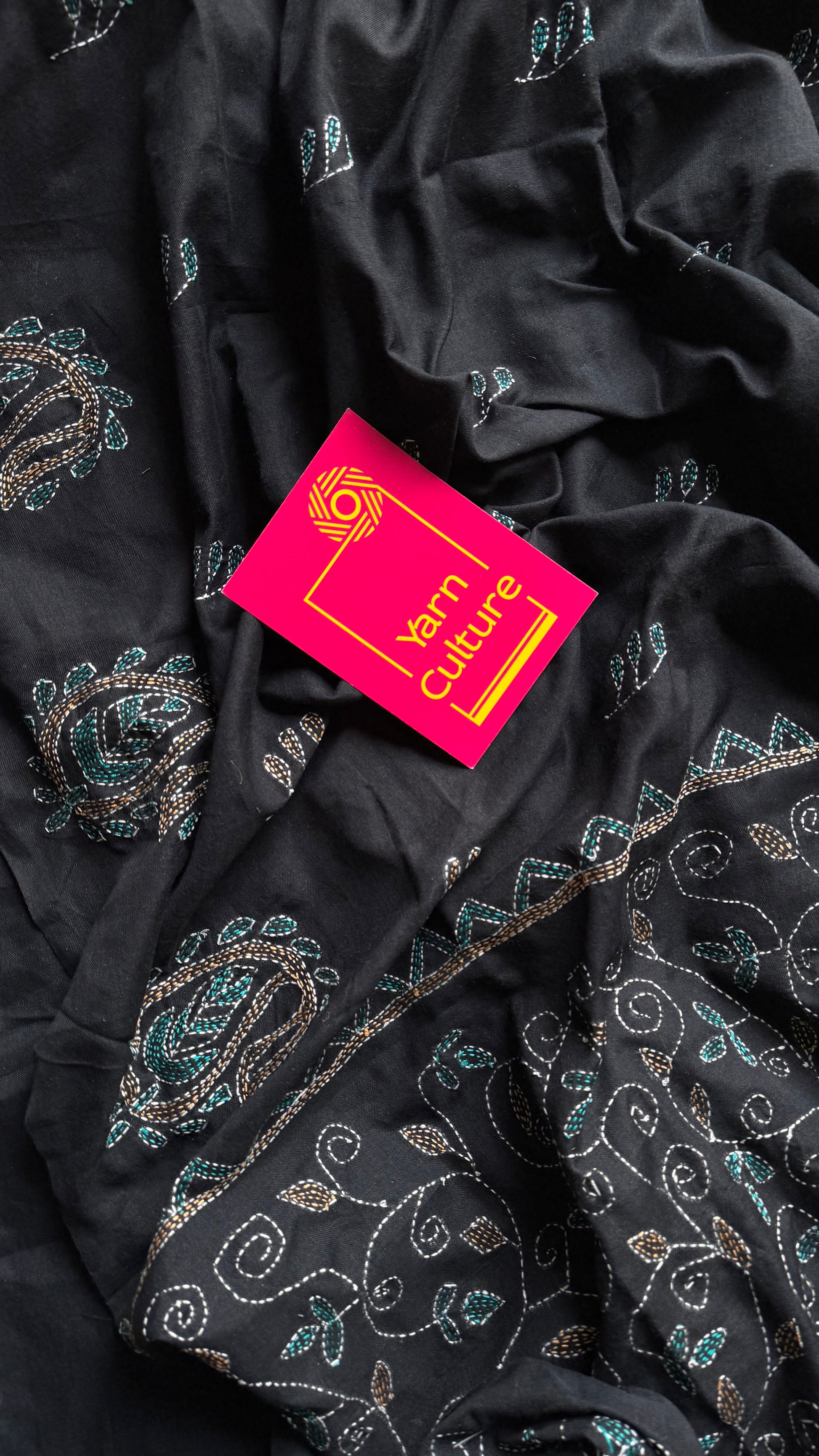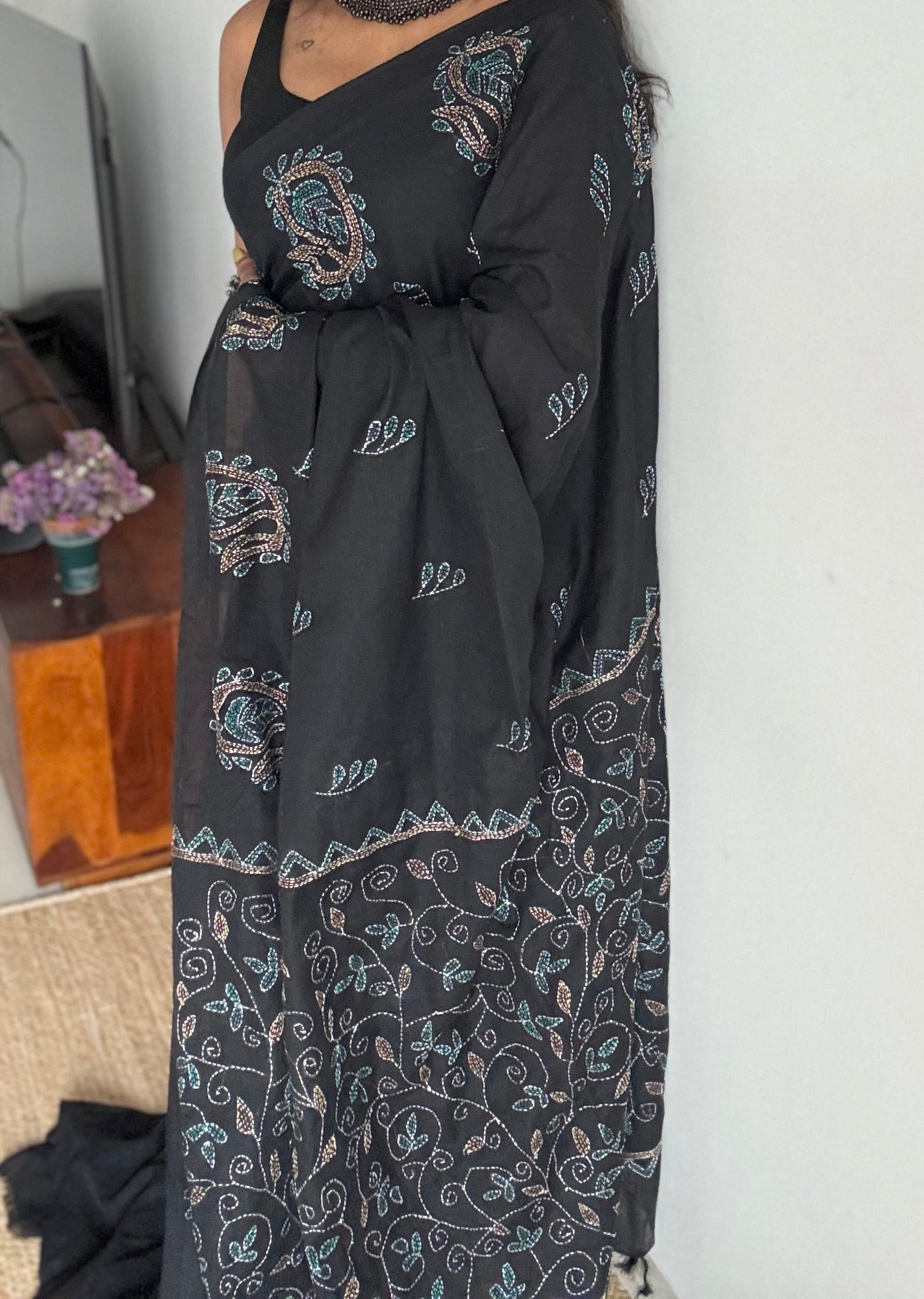 Bold in its stillness, detailed in its weave - this black Kantha saree is elegance etched in thread.