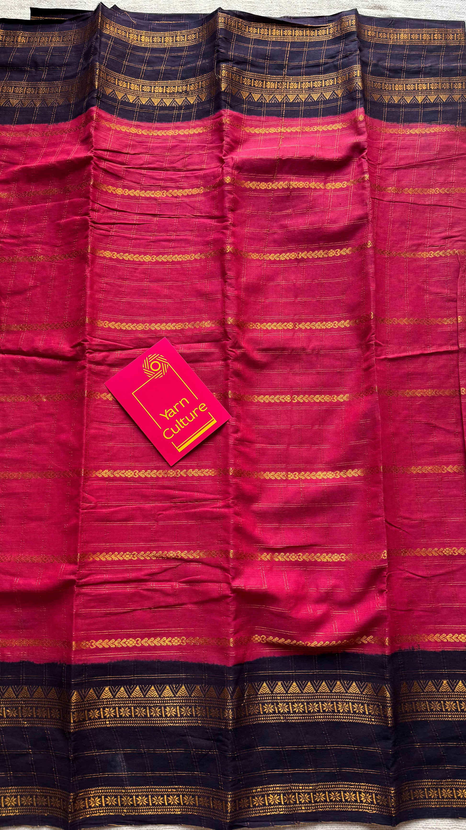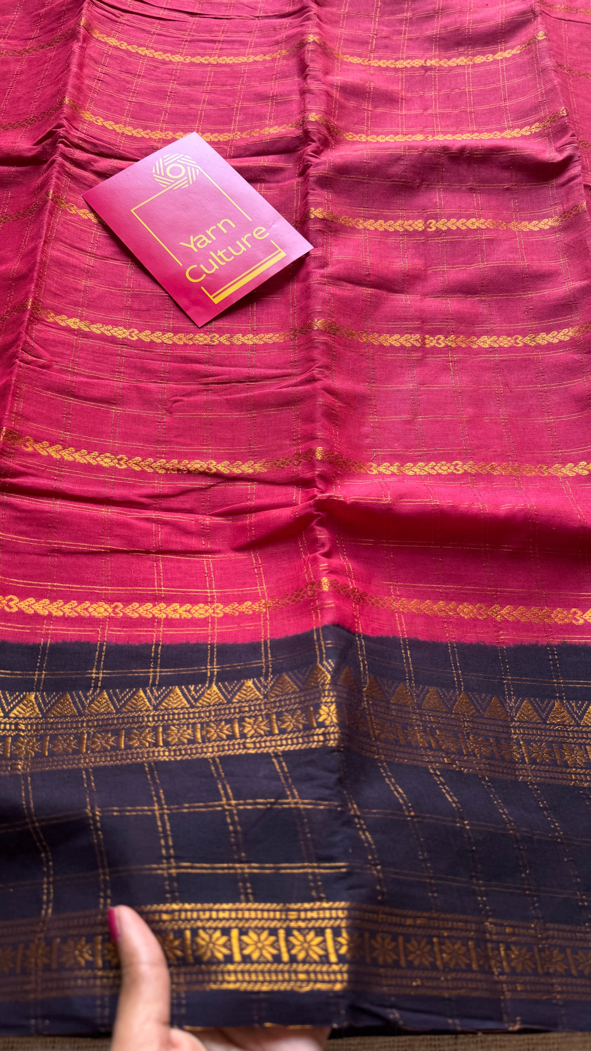 Pinkish red with dark blue contrast, exclusive Adayar checks with velthaari pattern, madurai cotton with contrast blouse fabric 💖