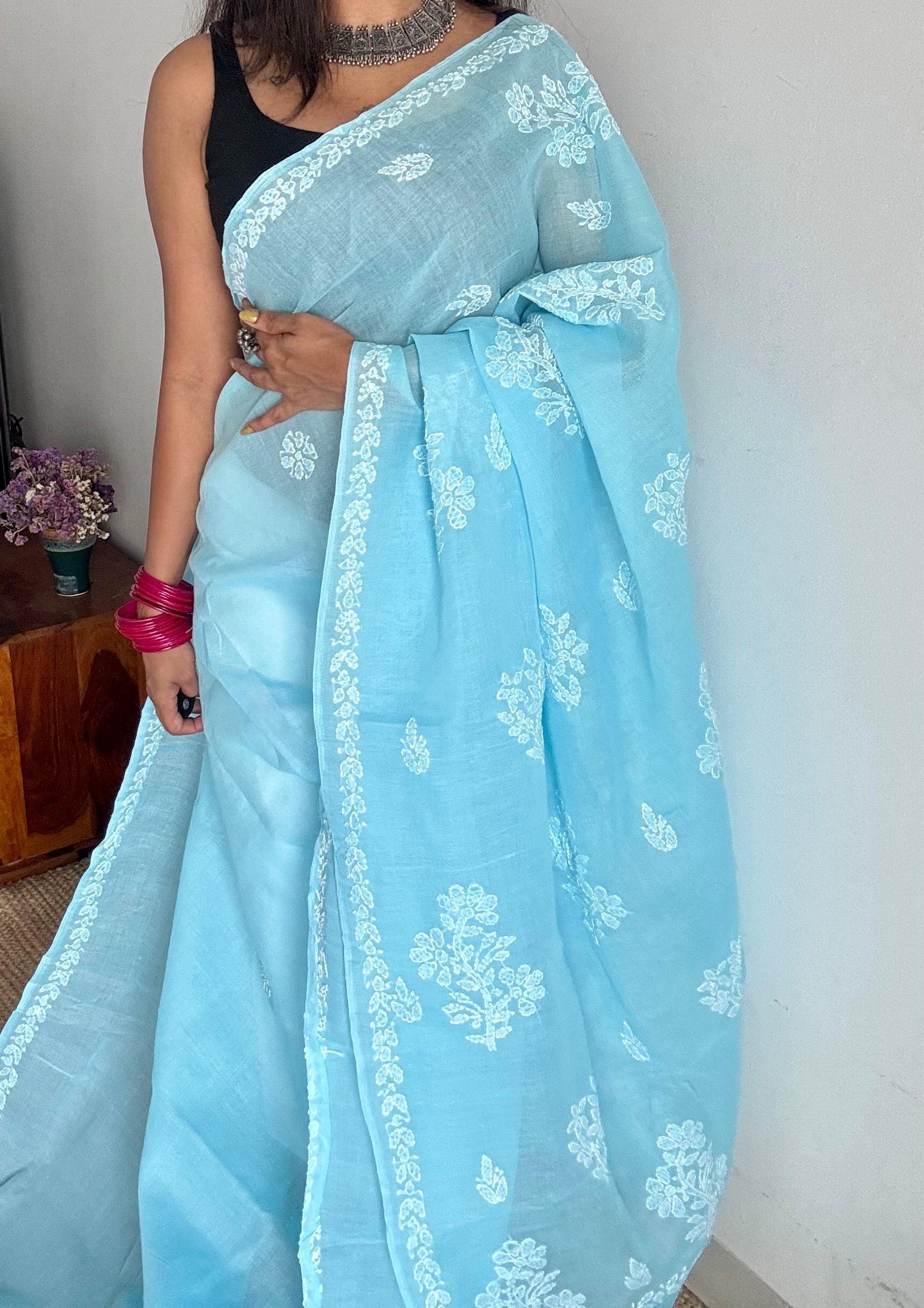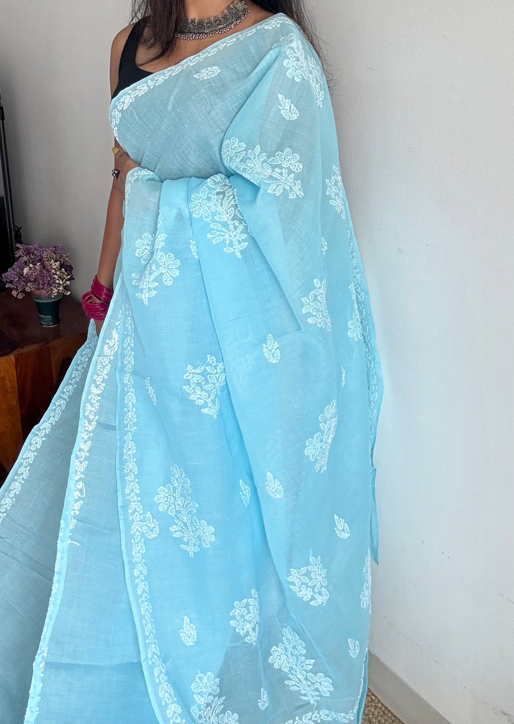 Falak - the sky, vast, calm, and endless. Falak is a sky blue chikankari saree, hand-embroidered on breathable cotton.