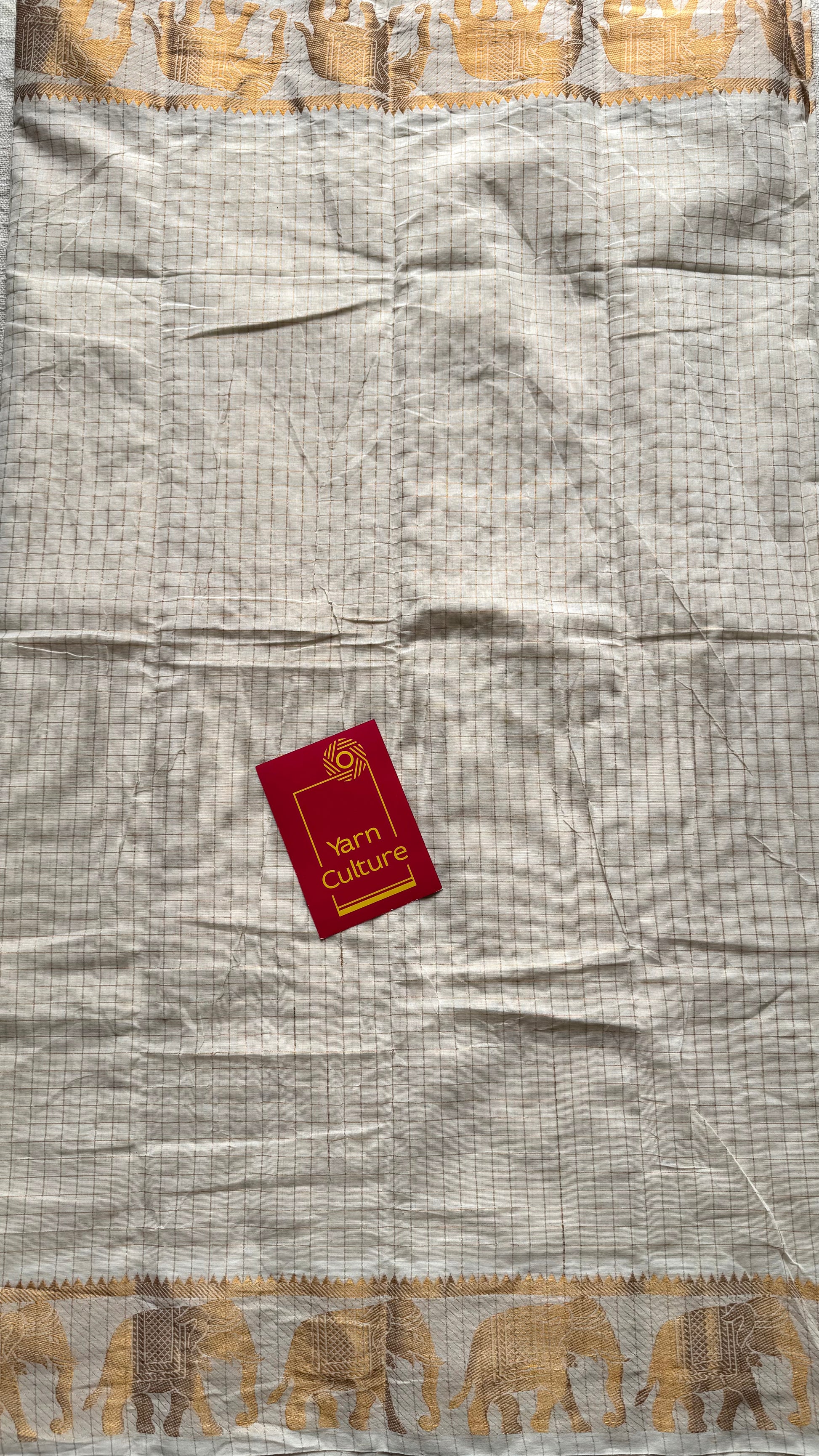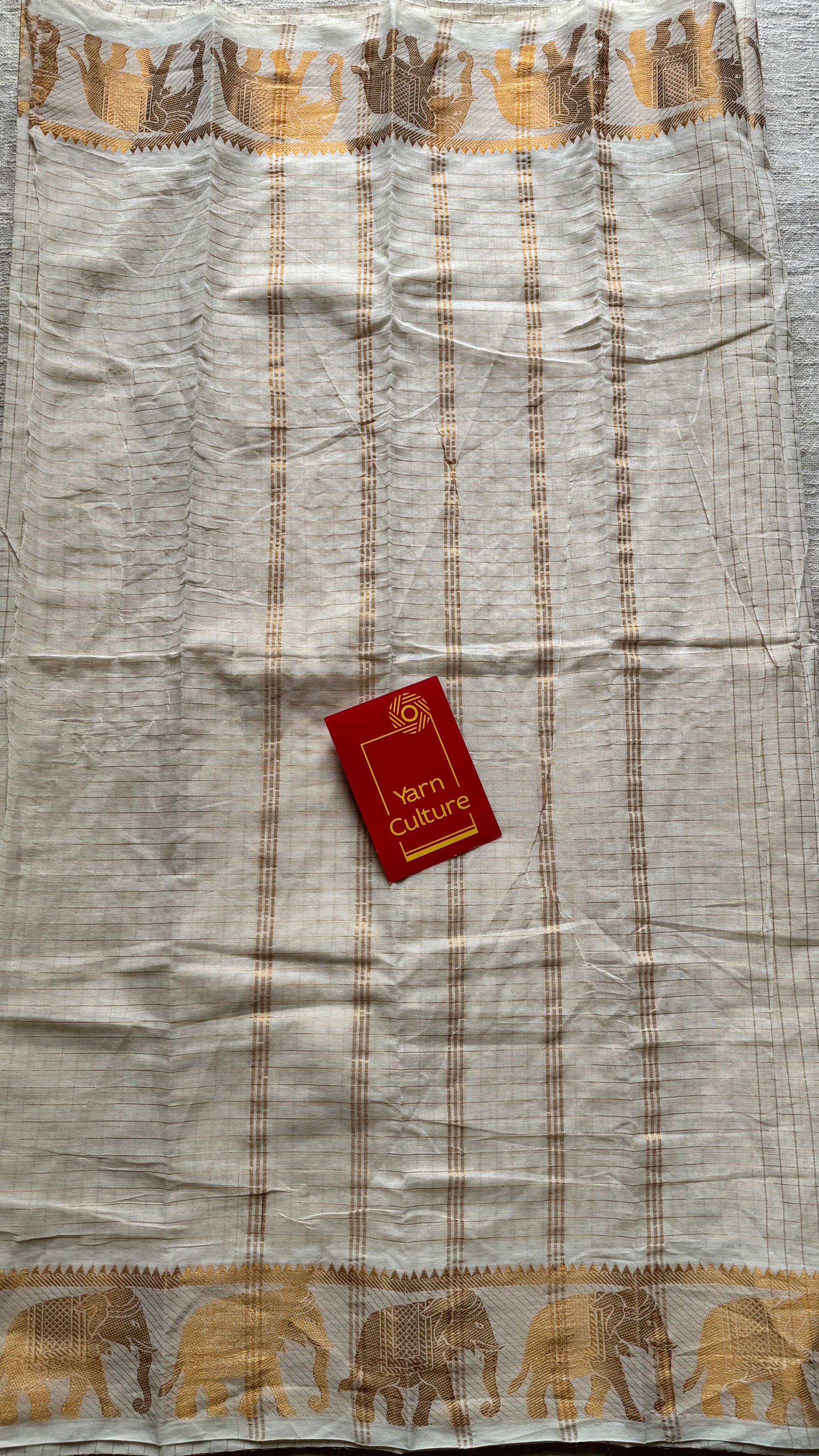 Gaja Rekha - small kattam checks,elephant motif, ivory & gold, soft cotton - YCON25COTN102