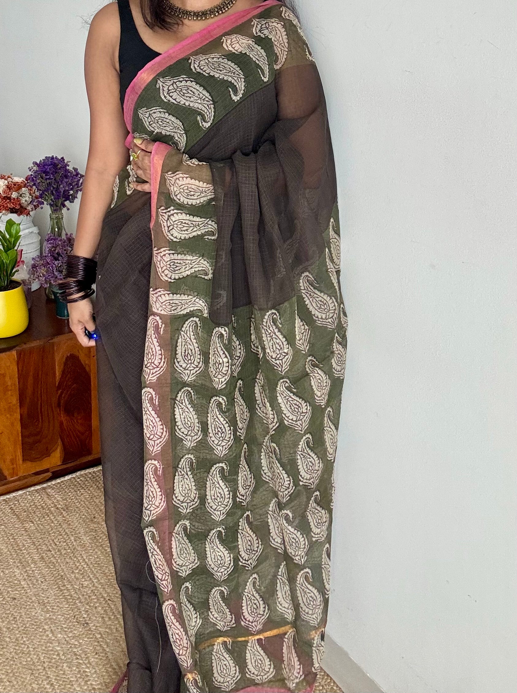 The kind of black that doesn’t feel heavy. Balanced with green, off white paisleys and gold border with a playful touch of pink. Easy drape, no-fuss summer days.