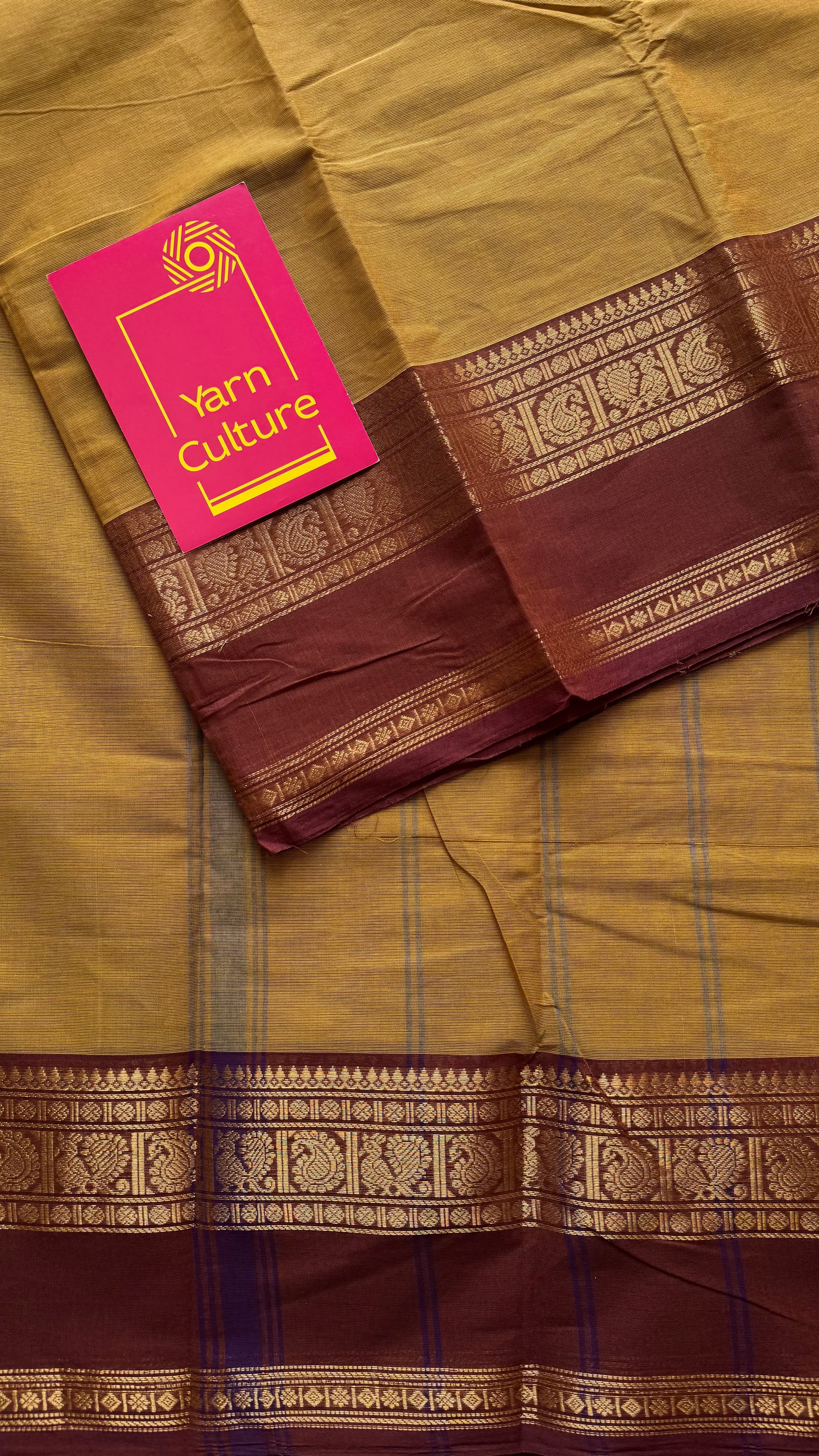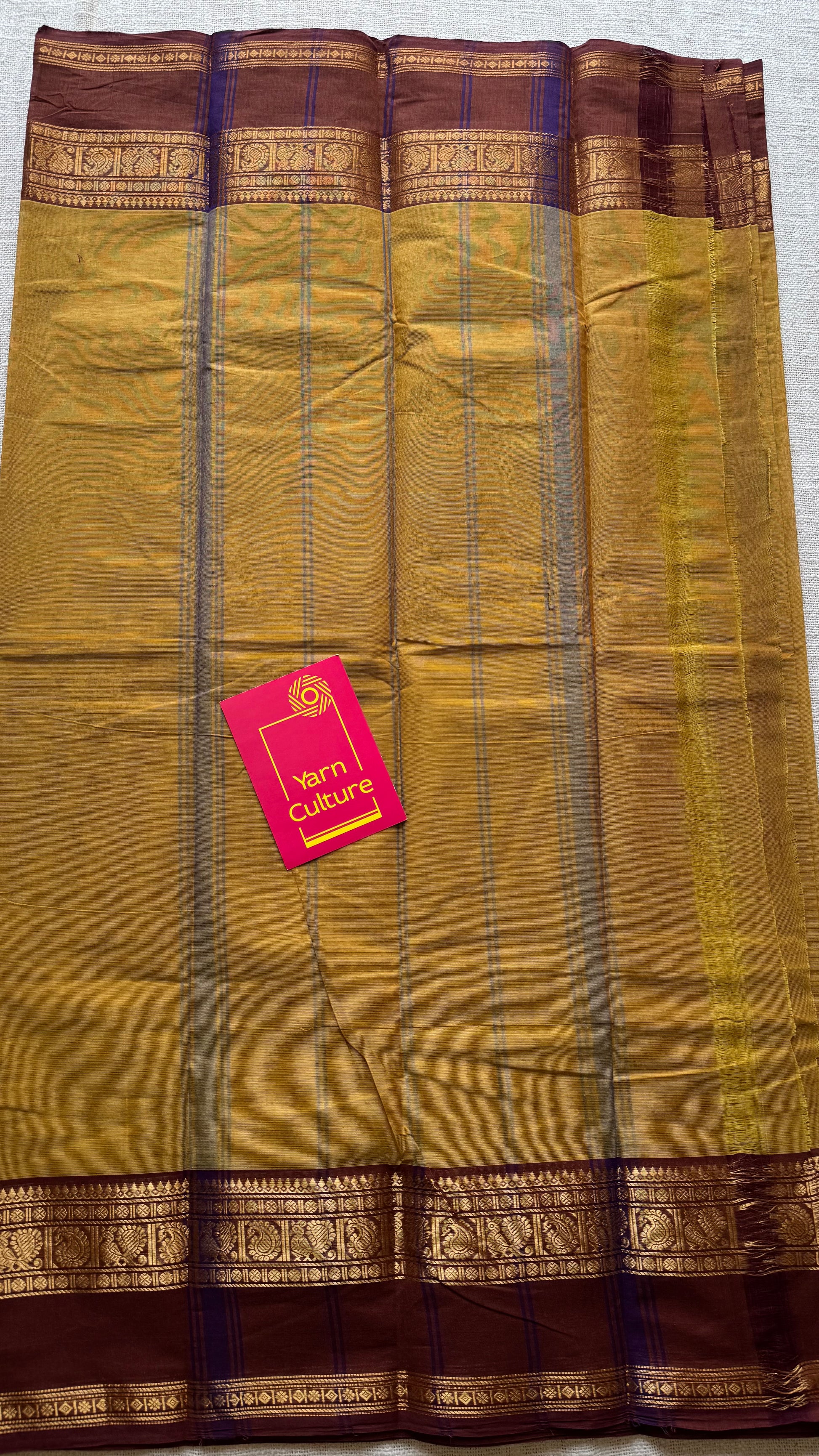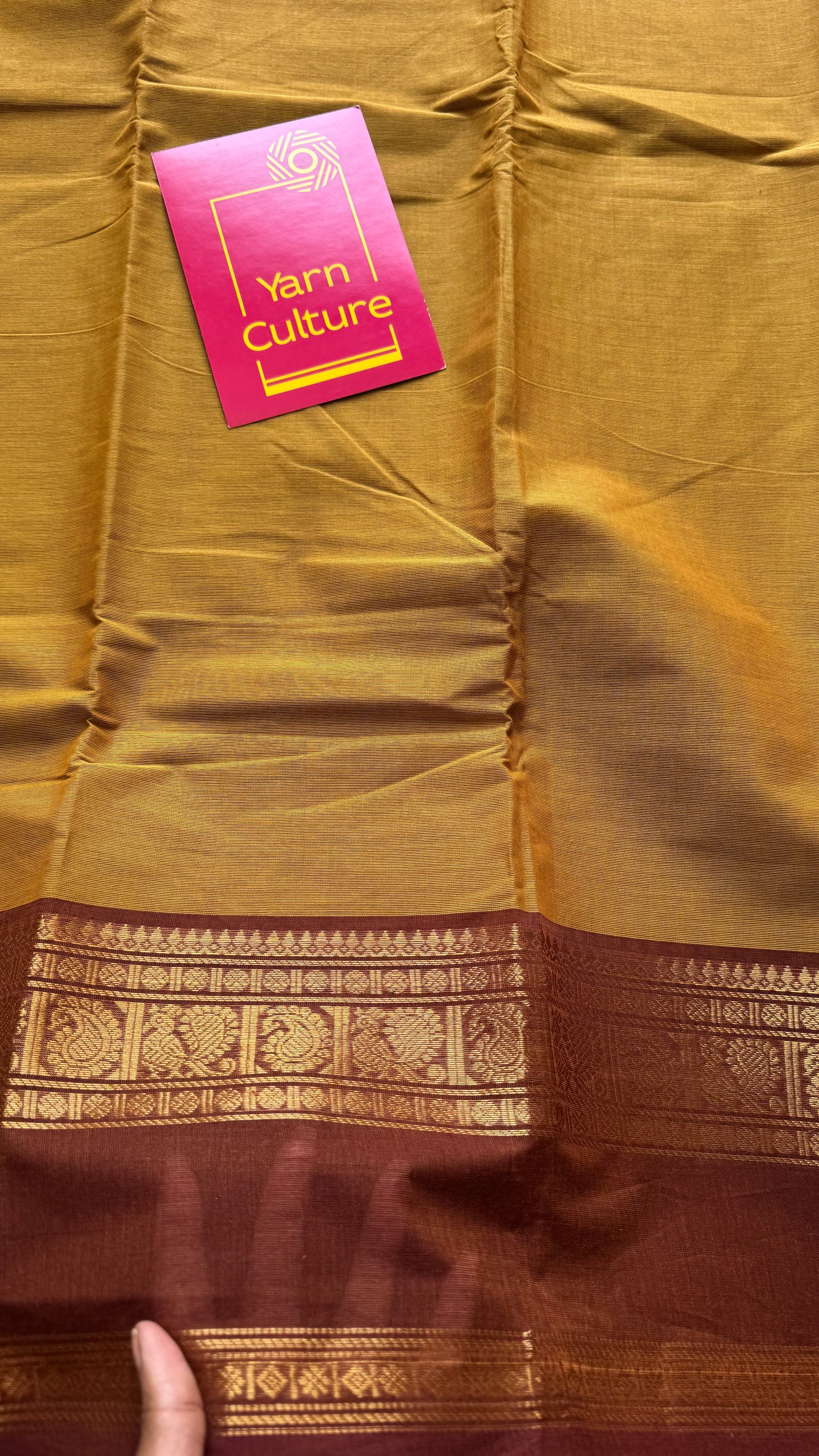 Ginger yellow with brown Chettinad cotton saree with rettaipettu peacock border - YCCOTNCCFE158