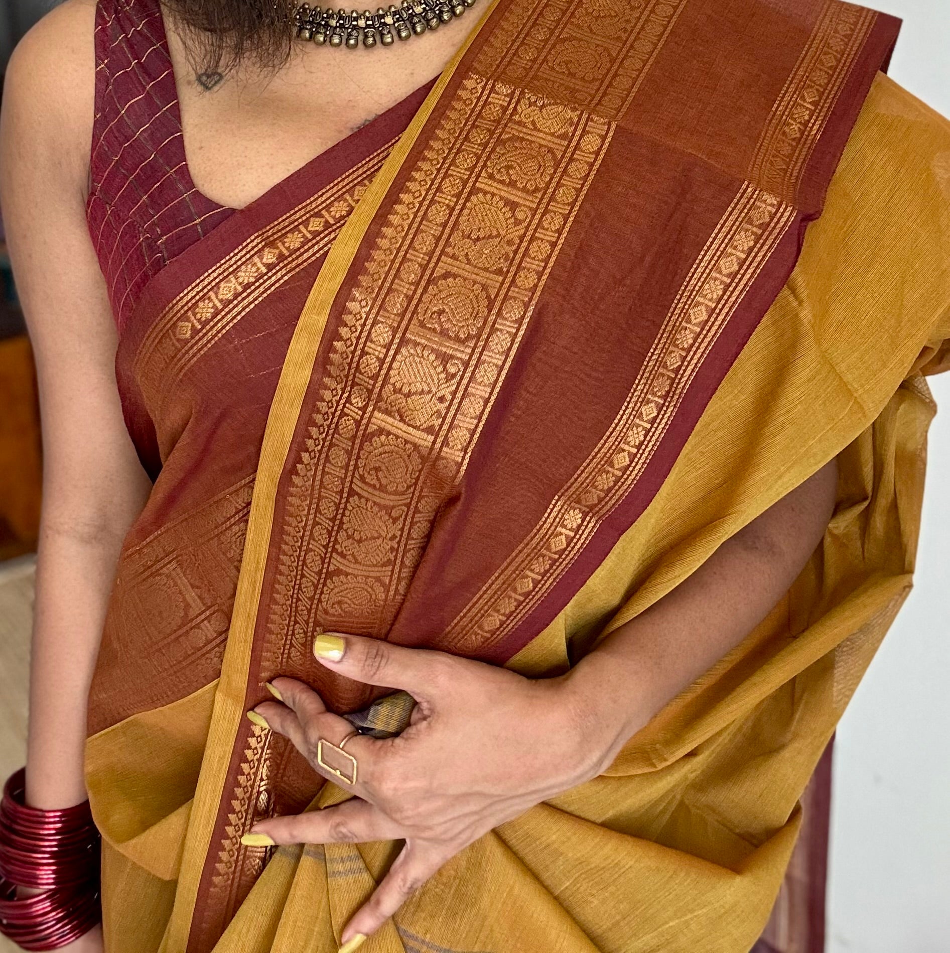 A rare combination of ginger yellow with brown Chettinad cotton saree finished with the trending rettaipettu double border with peacock motifs. Lightweight, breathable, and easy to drape, it is perfect for summer wear, everyday elegance, and comfortable all-day use. No blouse.