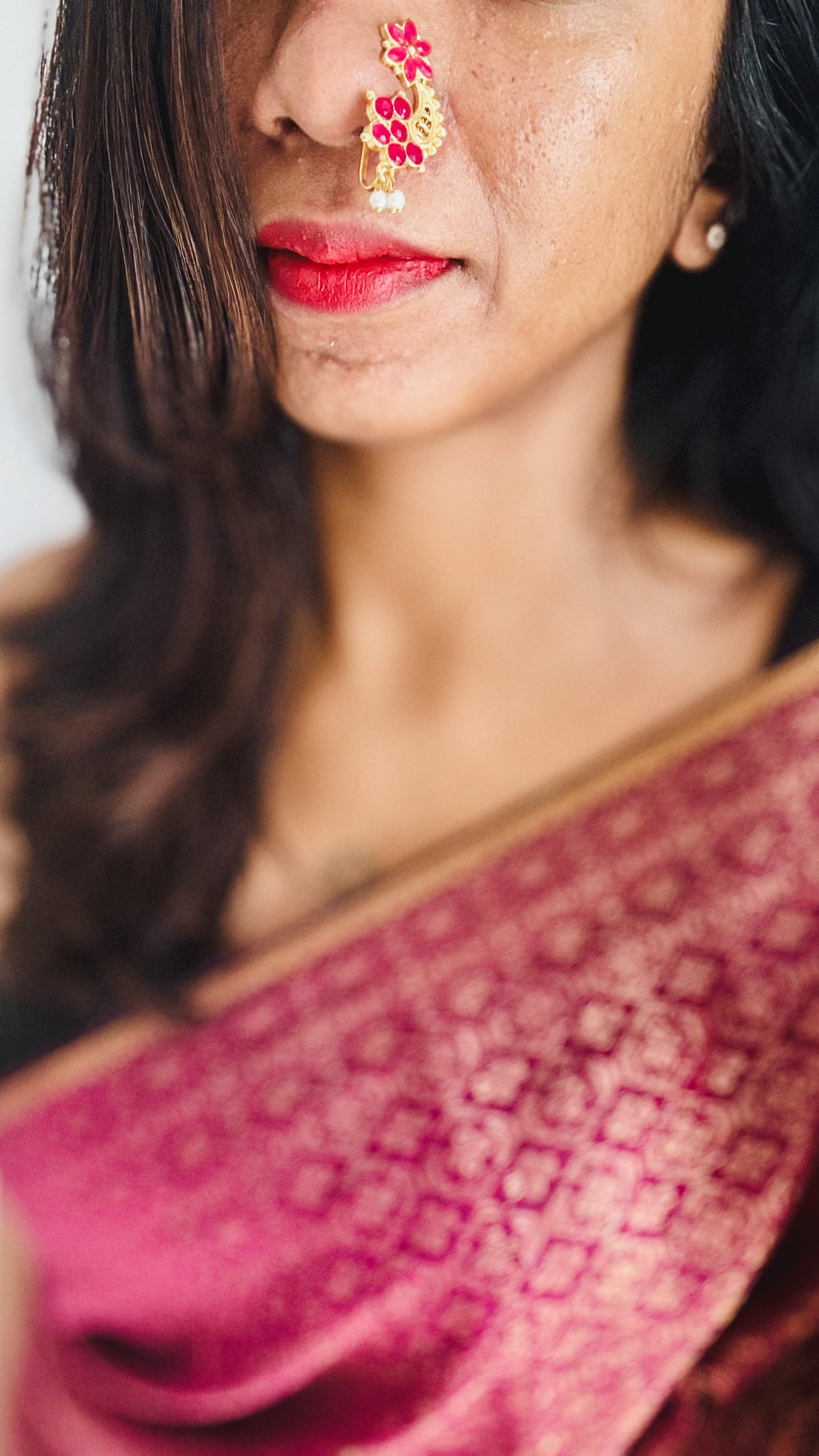 This is a clip-on Maharashtrian nath, designed for the left nostril. Simply place the stud on your left nostril, gently press the back to secure it, and it will comfortably hook in place. No piercing required, just clip, press, and flaunt.