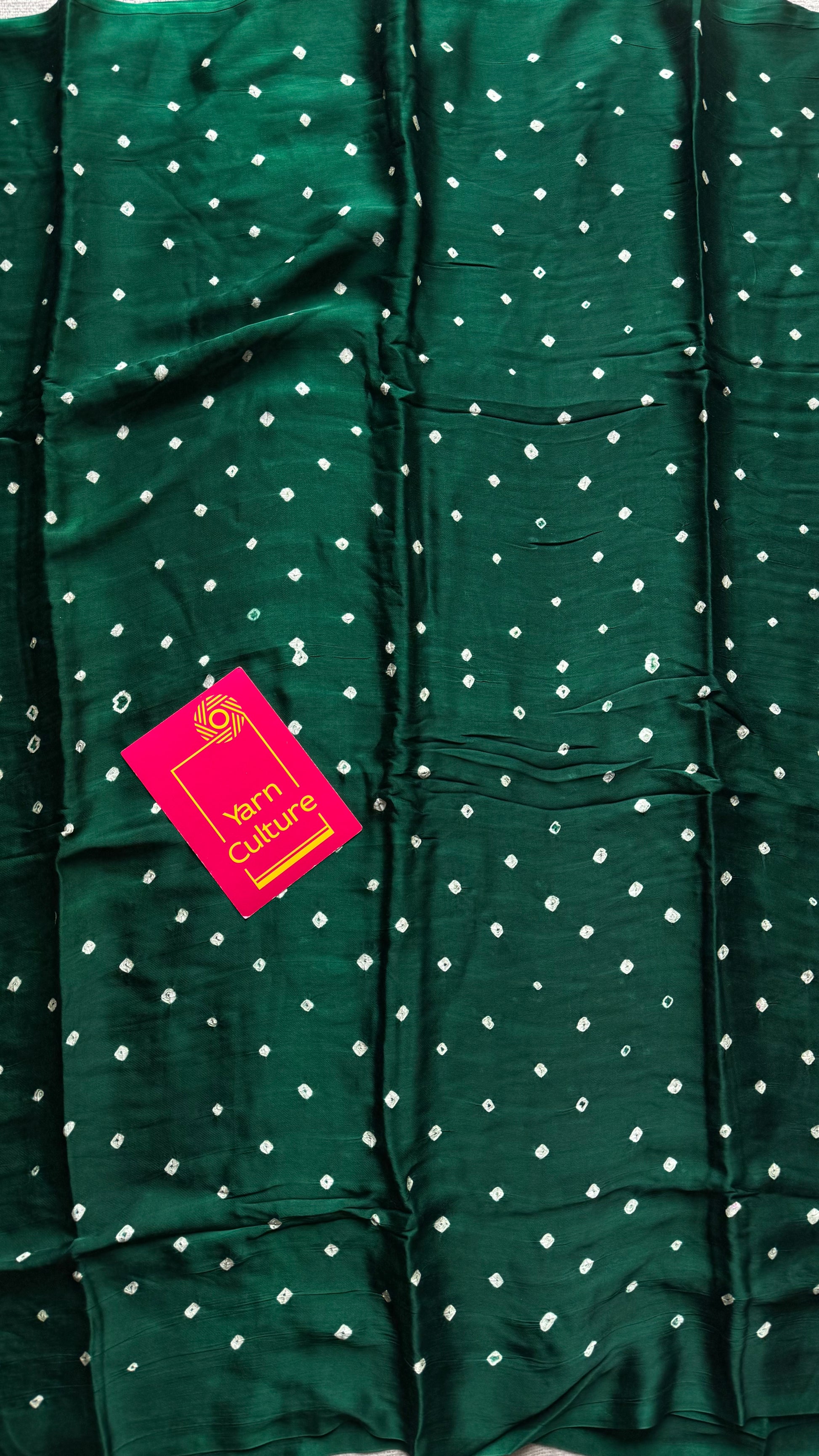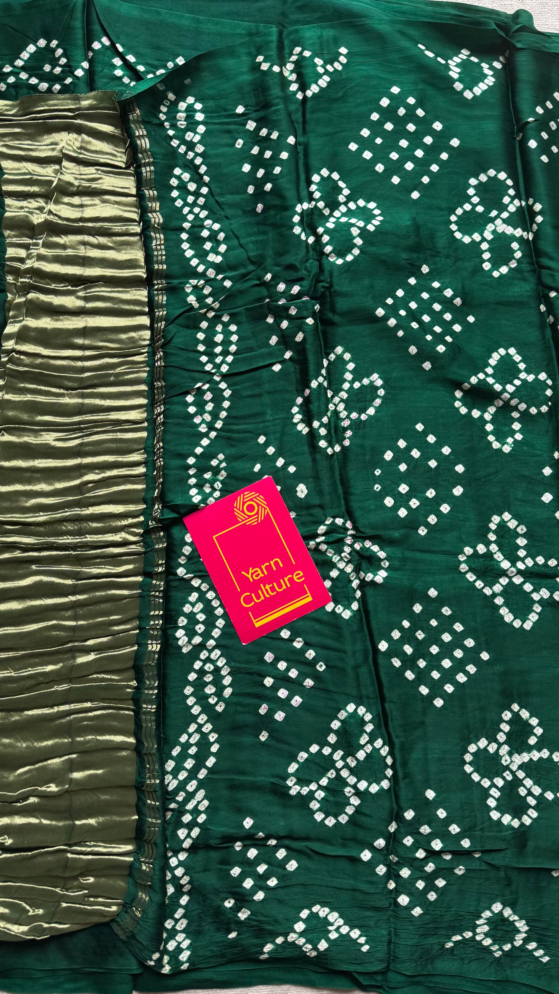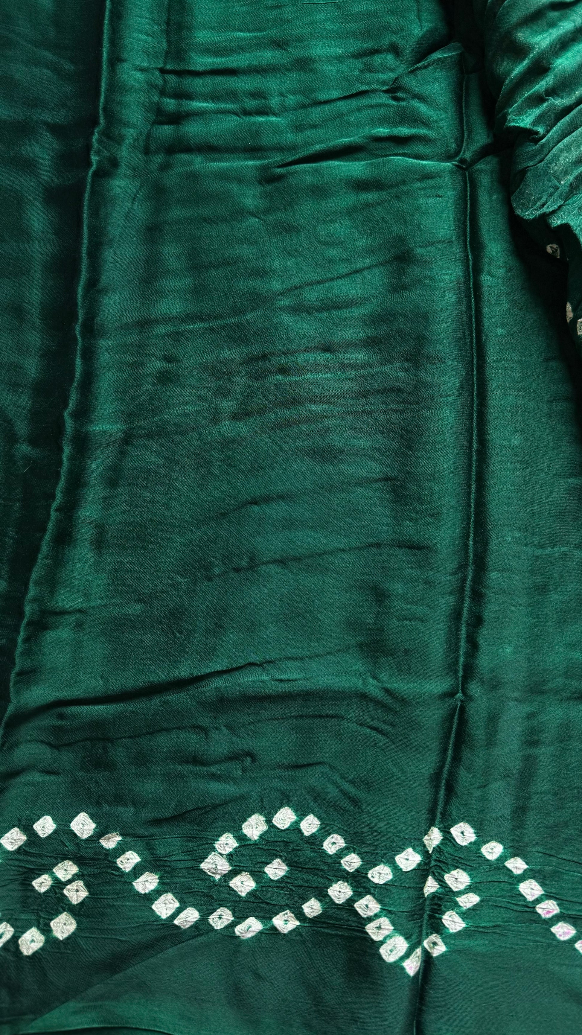 Green bandhani modal silk with lagdi patta (zari pallu). Please note bandhej sarees are dyed, there will be colour smudges. And only dry wash since colour may bleed in the first wash and threads are delicate. Effortless to drape, light to carry, and rich in look, this is a saree made to shine with you this season.