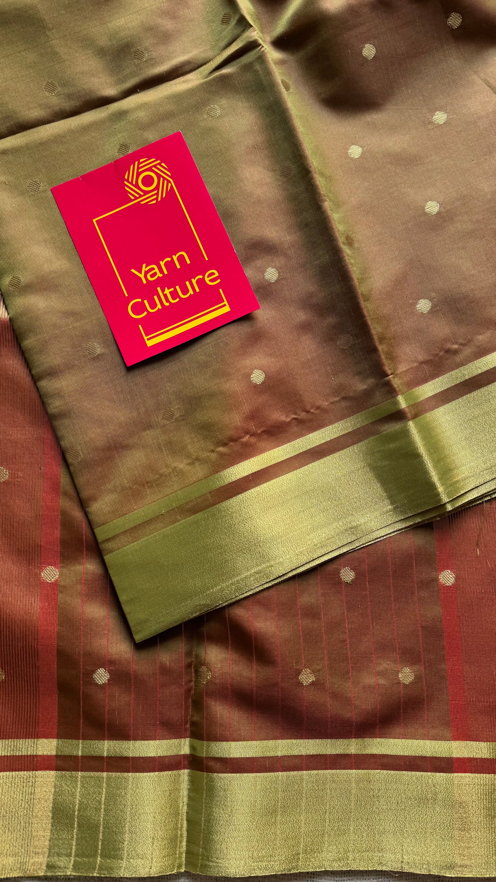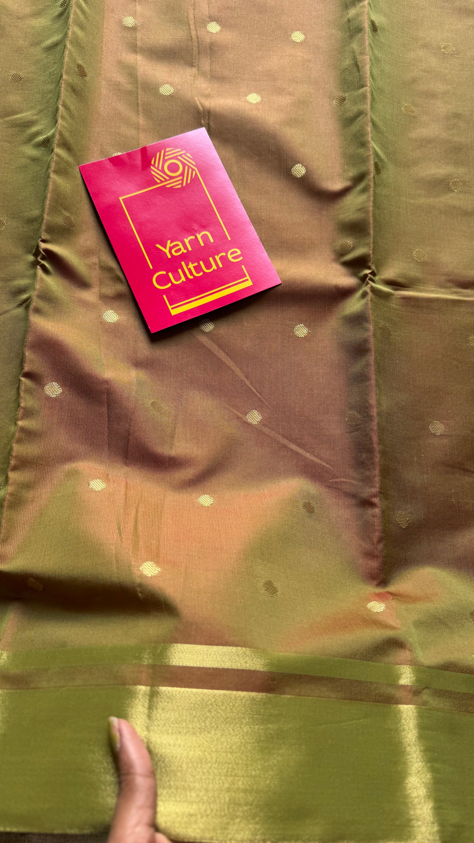 Green brown dual tone with antique gold border & buttas, semi katan silk - YCBLSSJA18