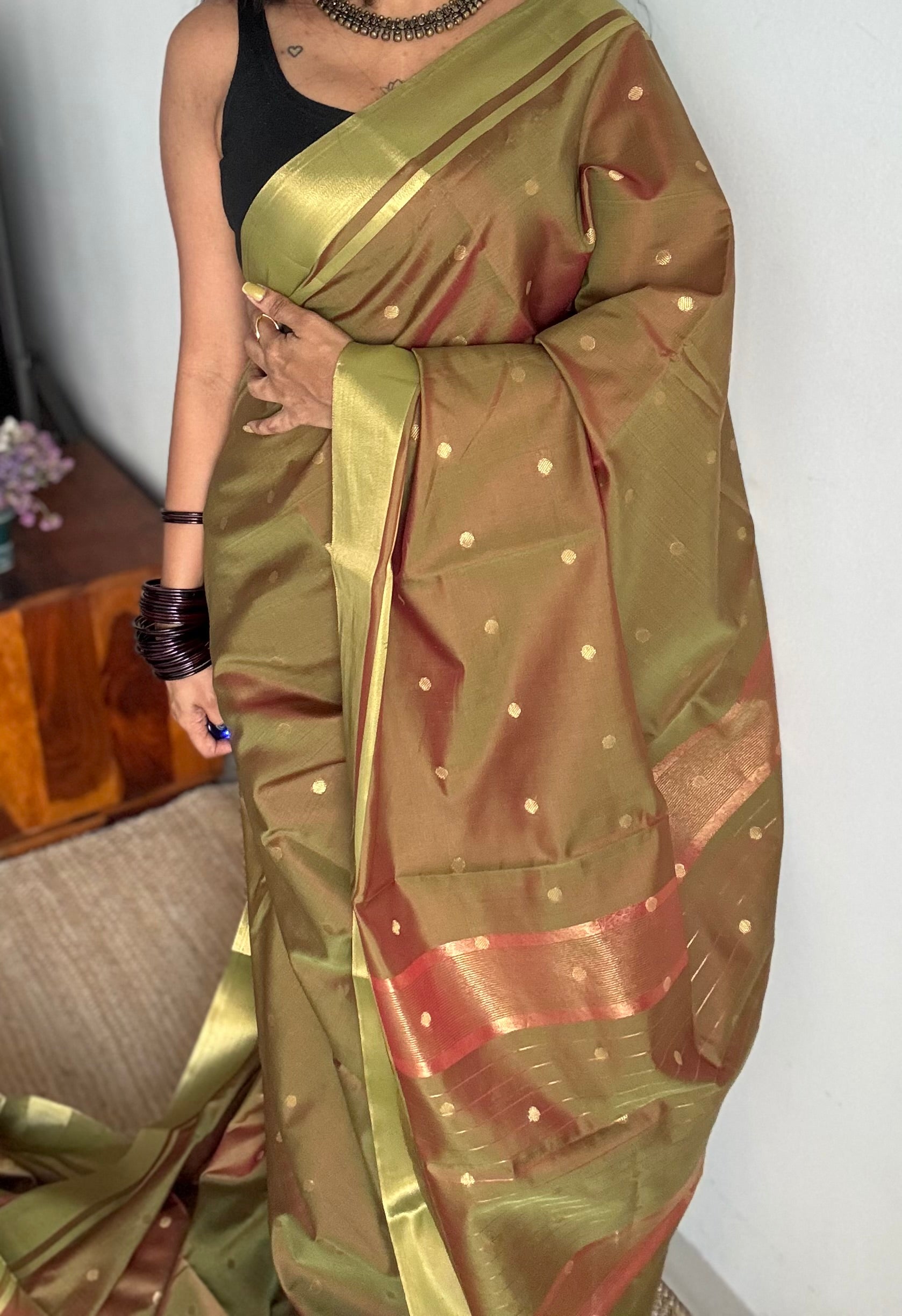 Green brown dual tone with antique gold border & buttas, semi katan silk. Effortless to drape, light to carry, and rich in look, this is a saree made to shine with you this season.