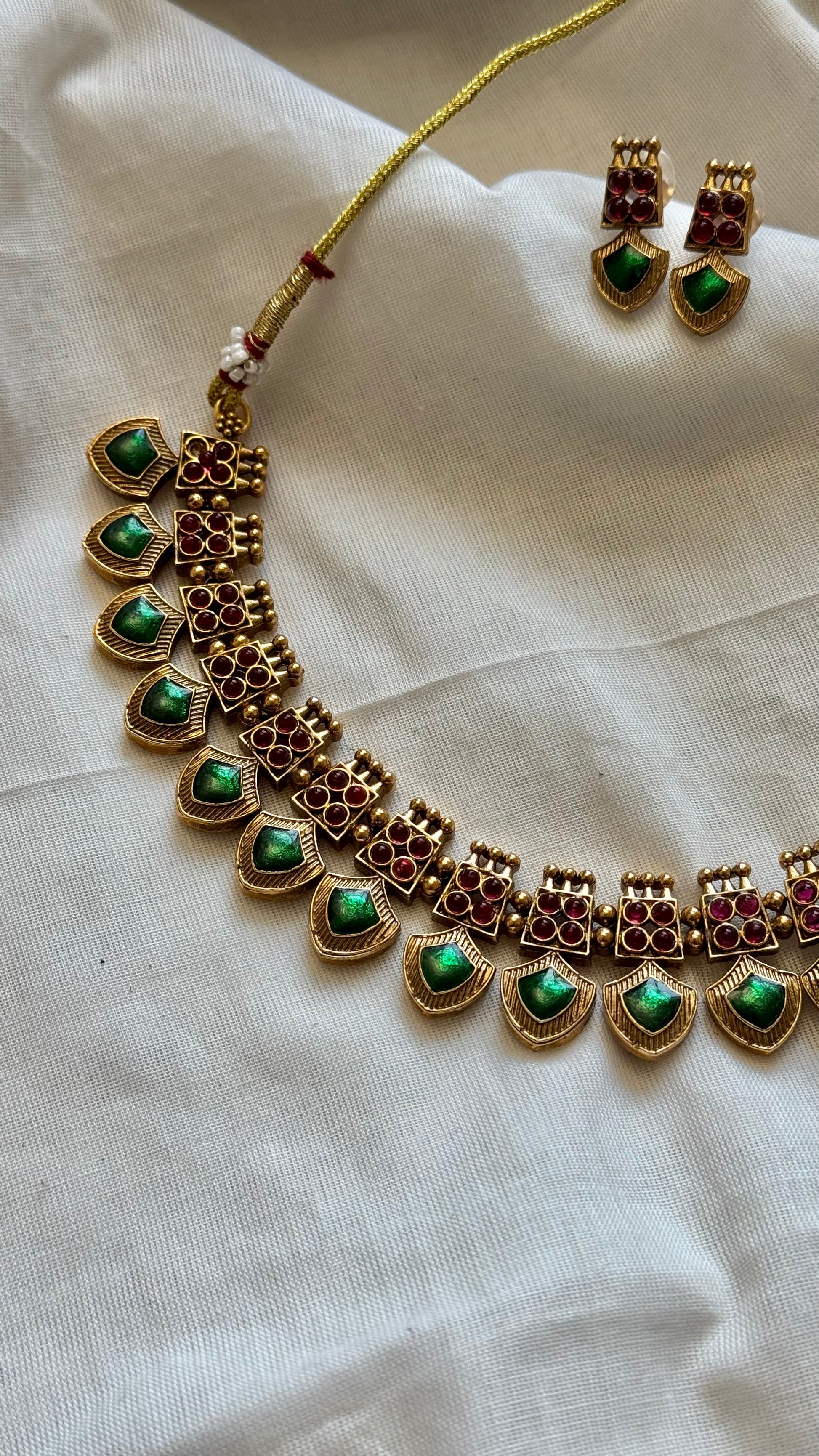 Green palakka enamel pendant neckpiece, with earrings.