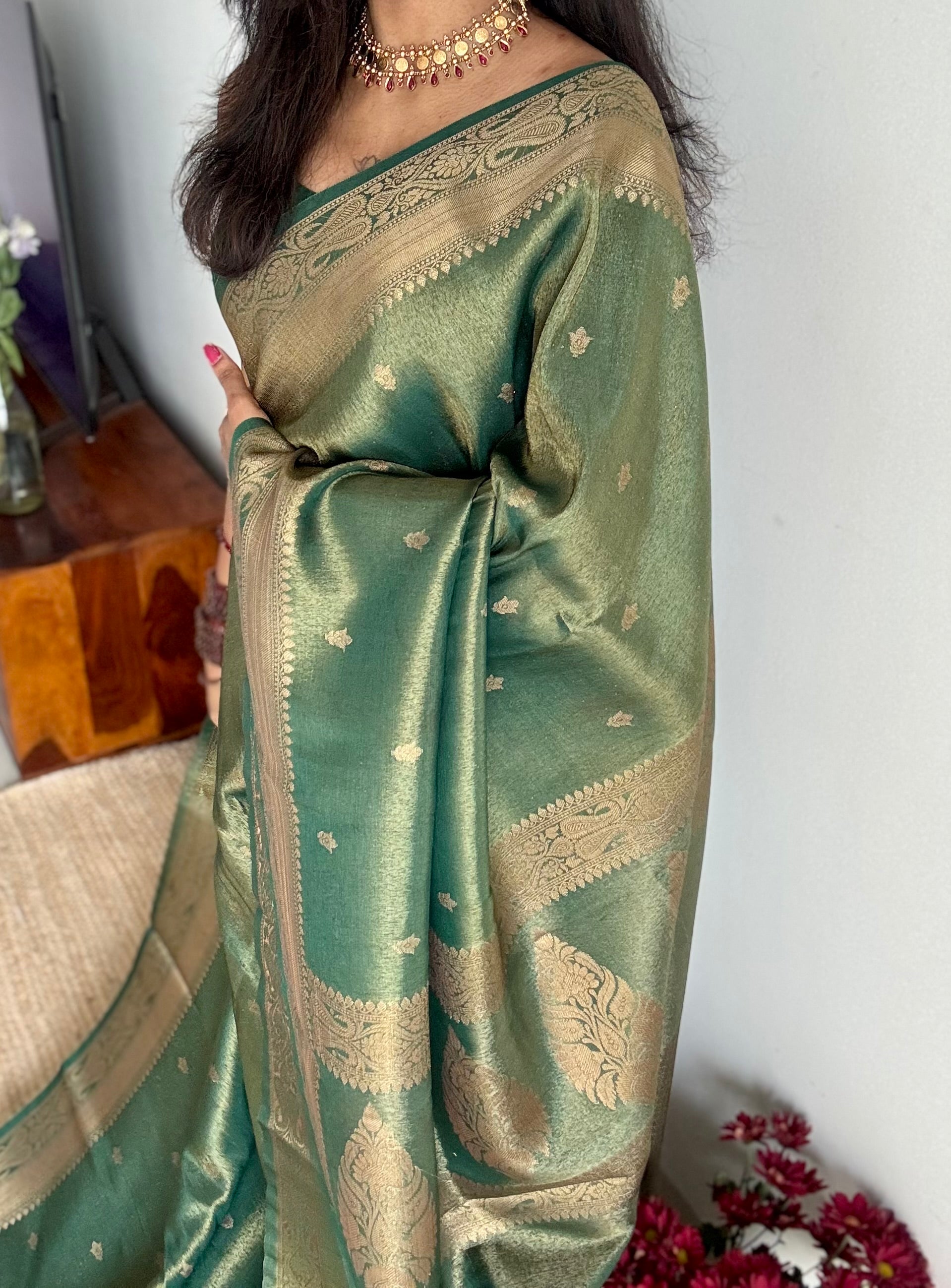 Green dual tone with gold in soft tissue silk - festive, timeless, and perfect for Diwali. Intricate pallu and blouse fabric. Effortless to drape, light to carry, and rich in look, this is a saree made to shine with you this season.