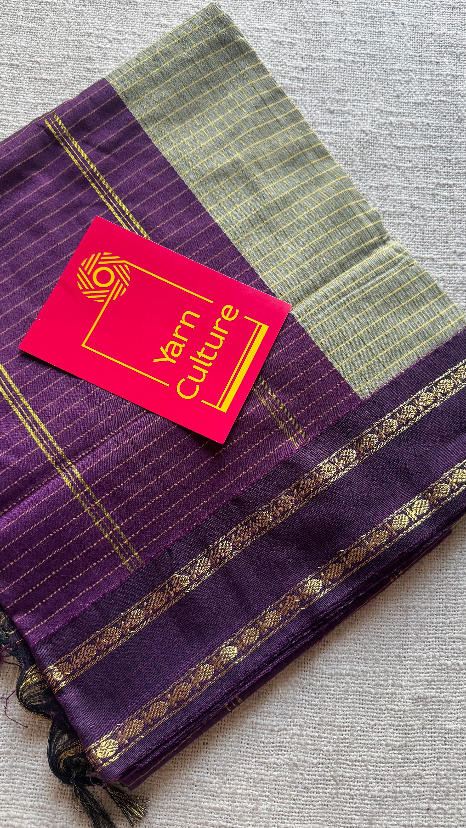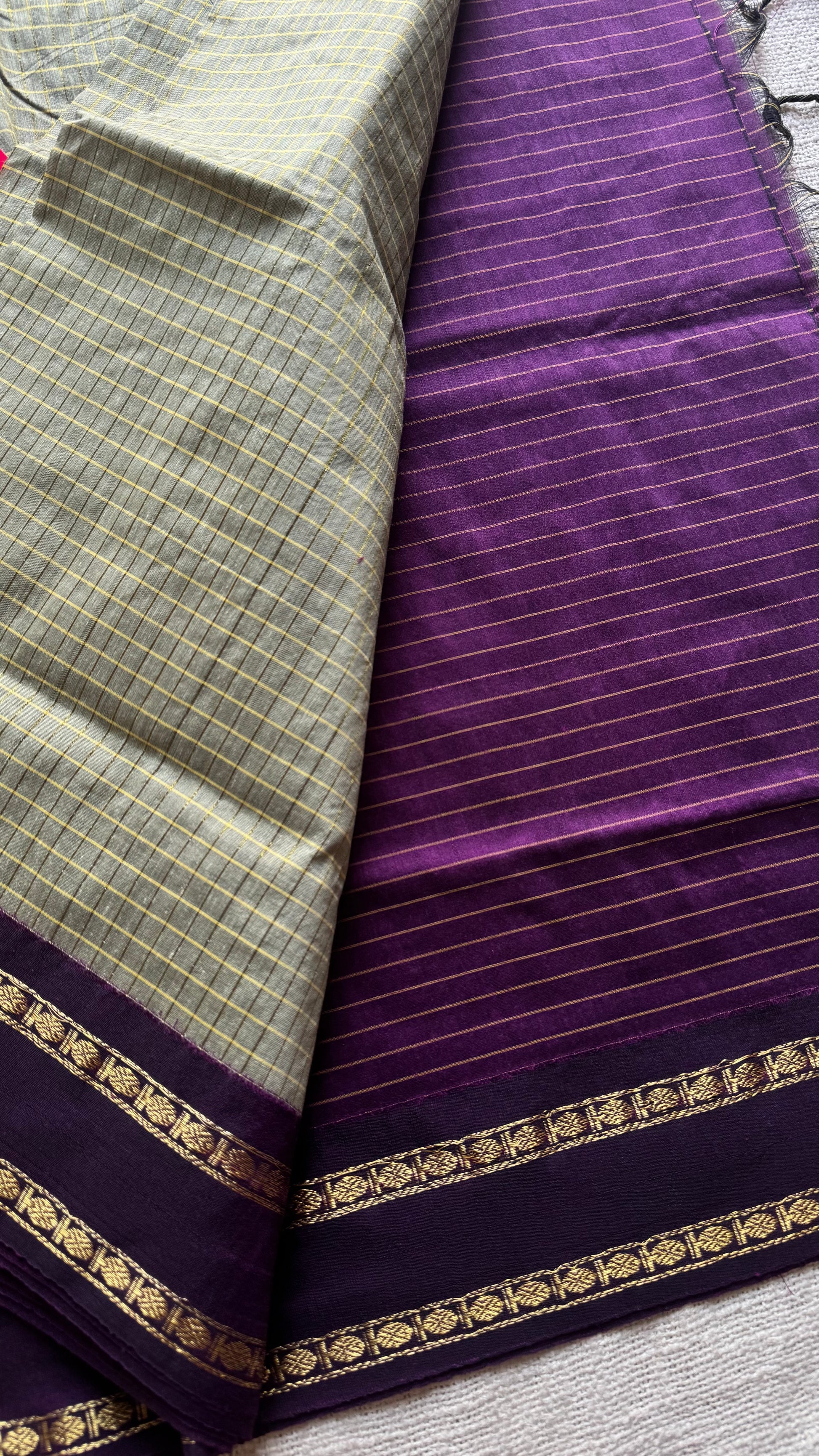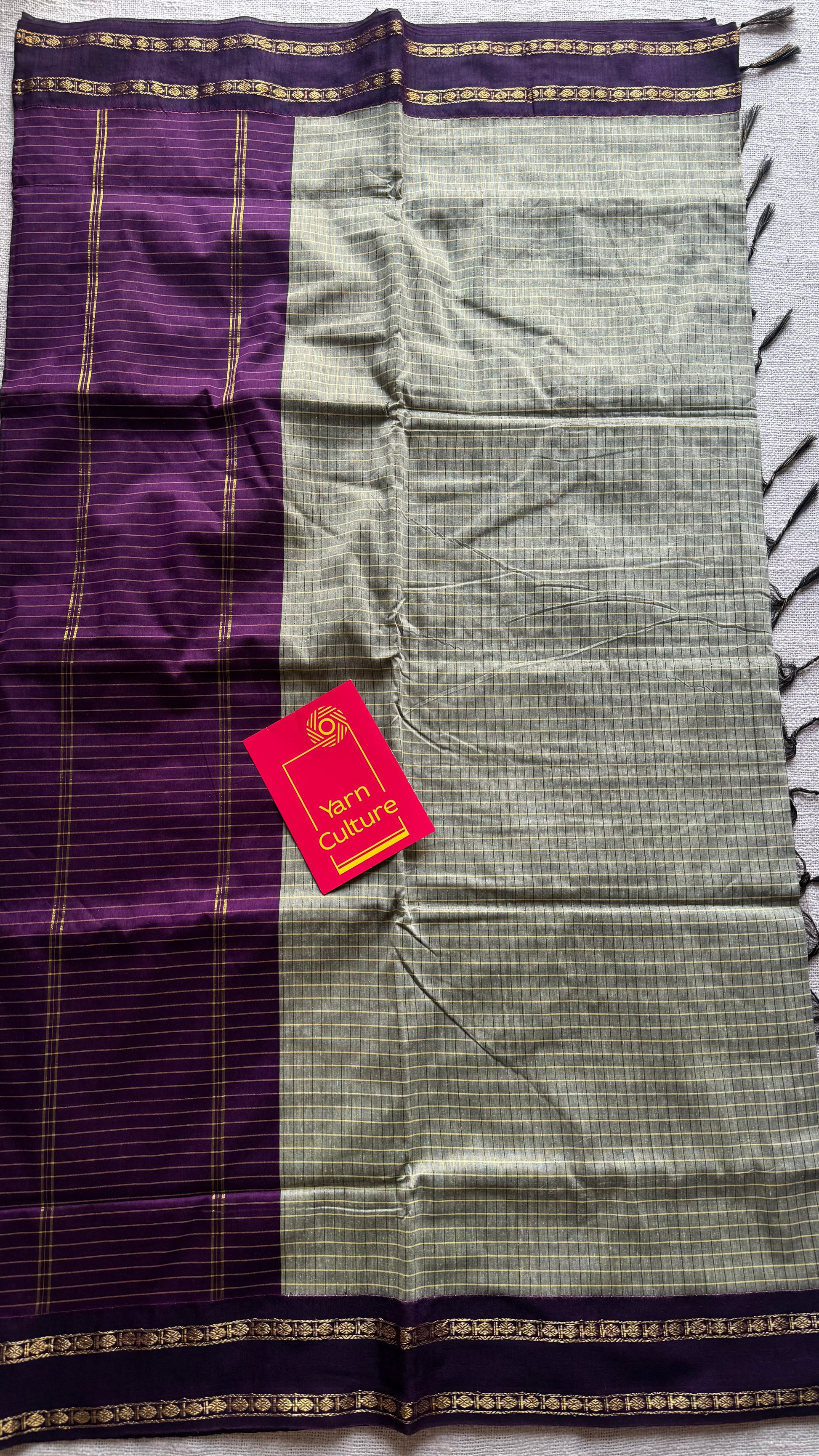 Grey with wine contrast arani checkered saree, cotton silk - YCCOTNKCFE69