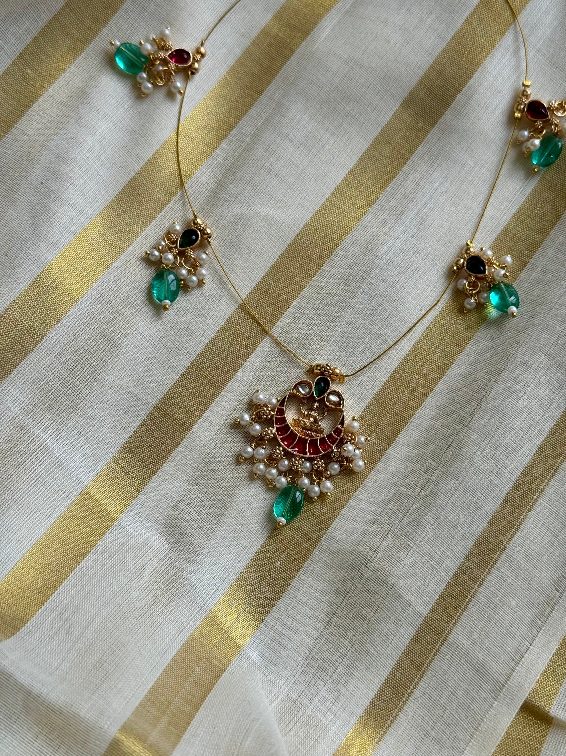 Half moon shaped jadau kundan pendant, invisible chain neckpiece with pearl and bead drops.