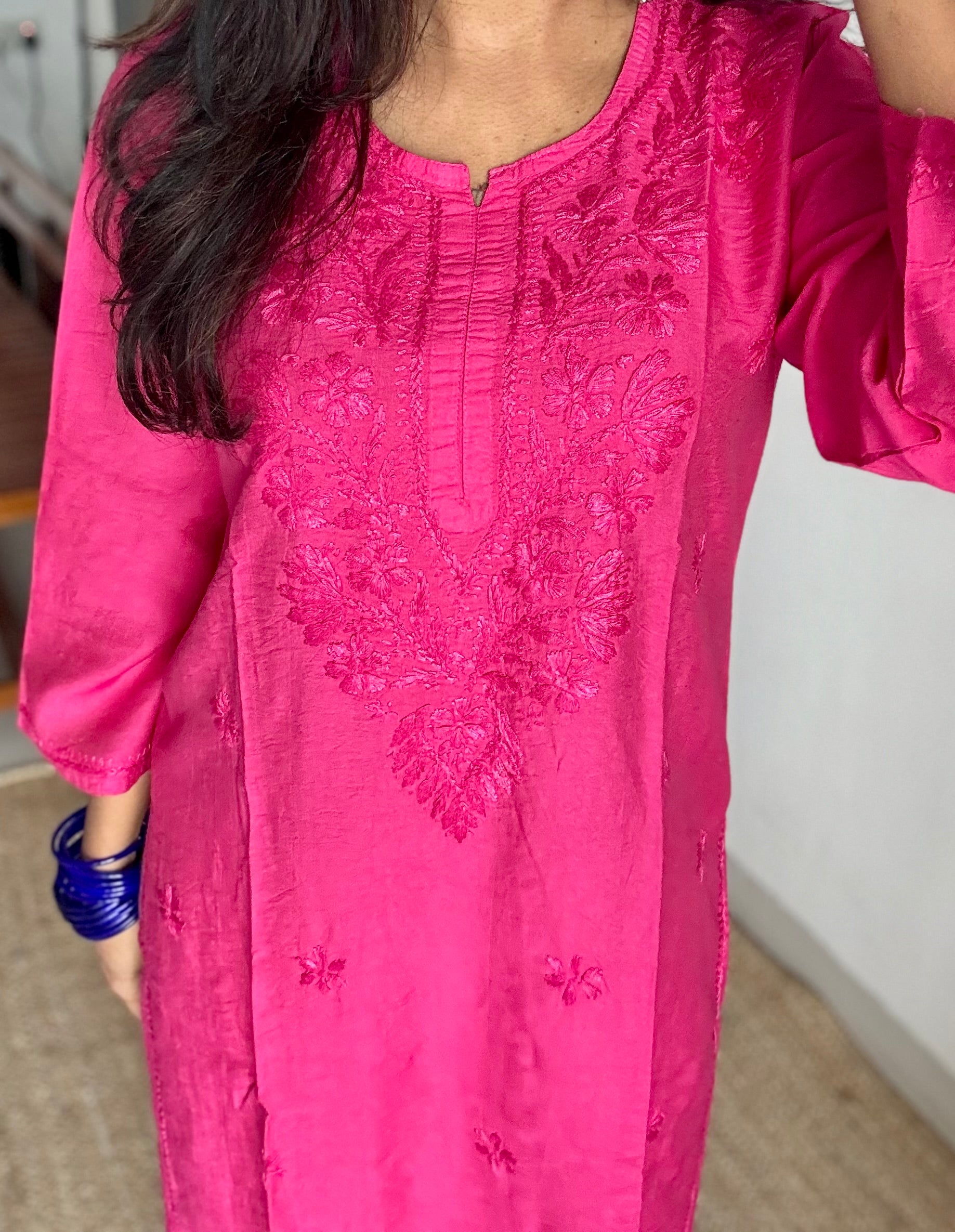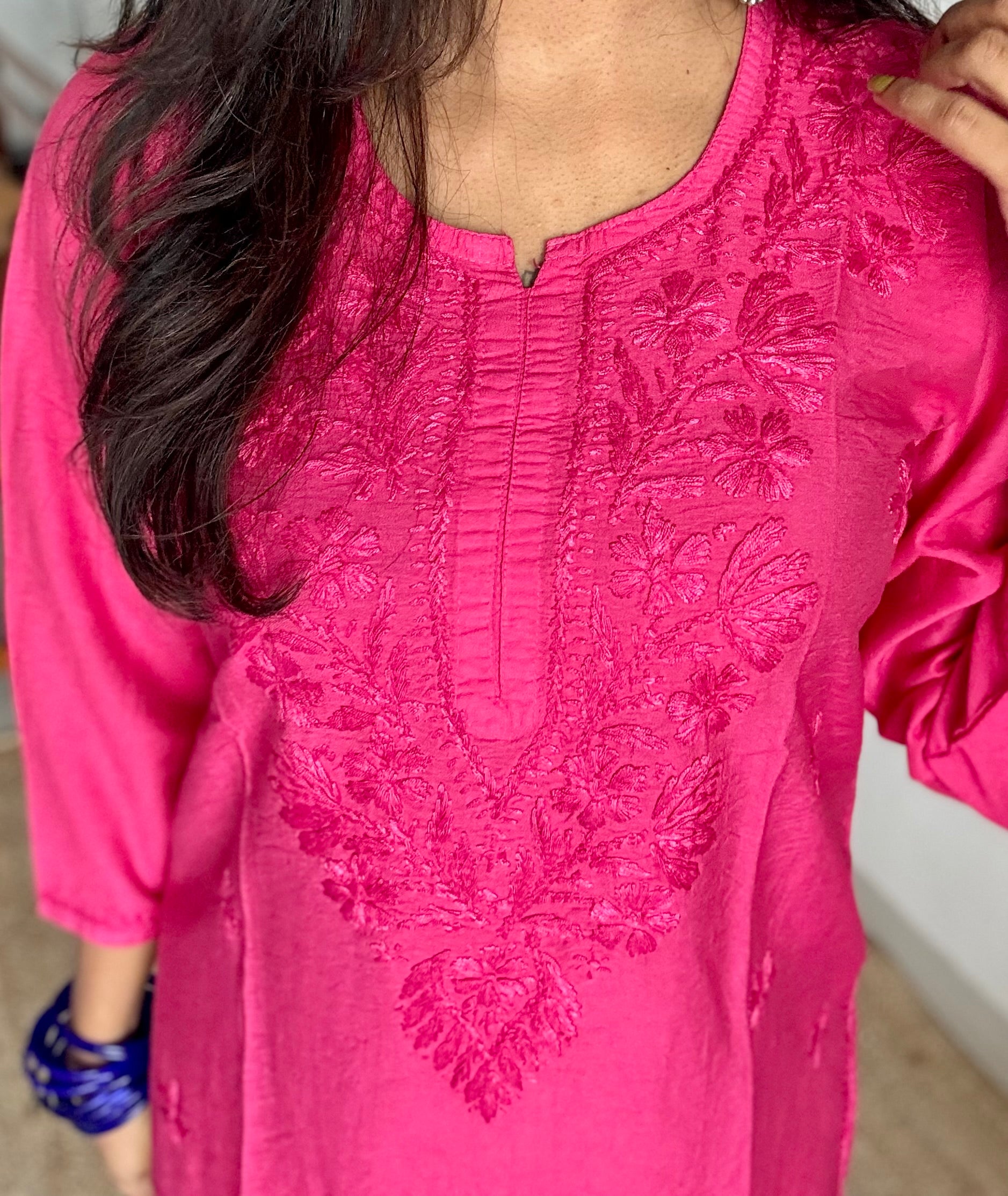 Fabric: Chanderi Work: Hand-embroidered Chikankari ghas patti Neckline: Round neck Sleeves: Three-fourth Fit: Straight fit Length: Knee-length (approx.; may vary slightly with size) Lining: Not included Occasion: Everyday elegance / Workwear / Festive minimal