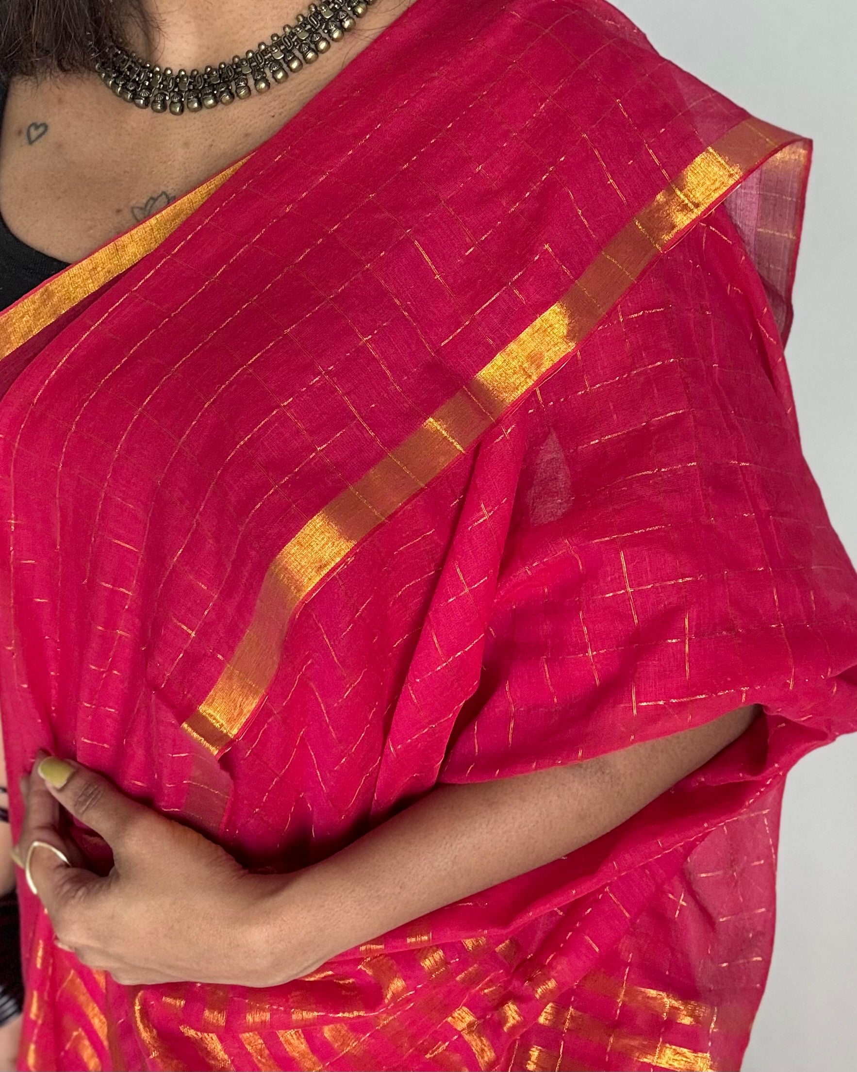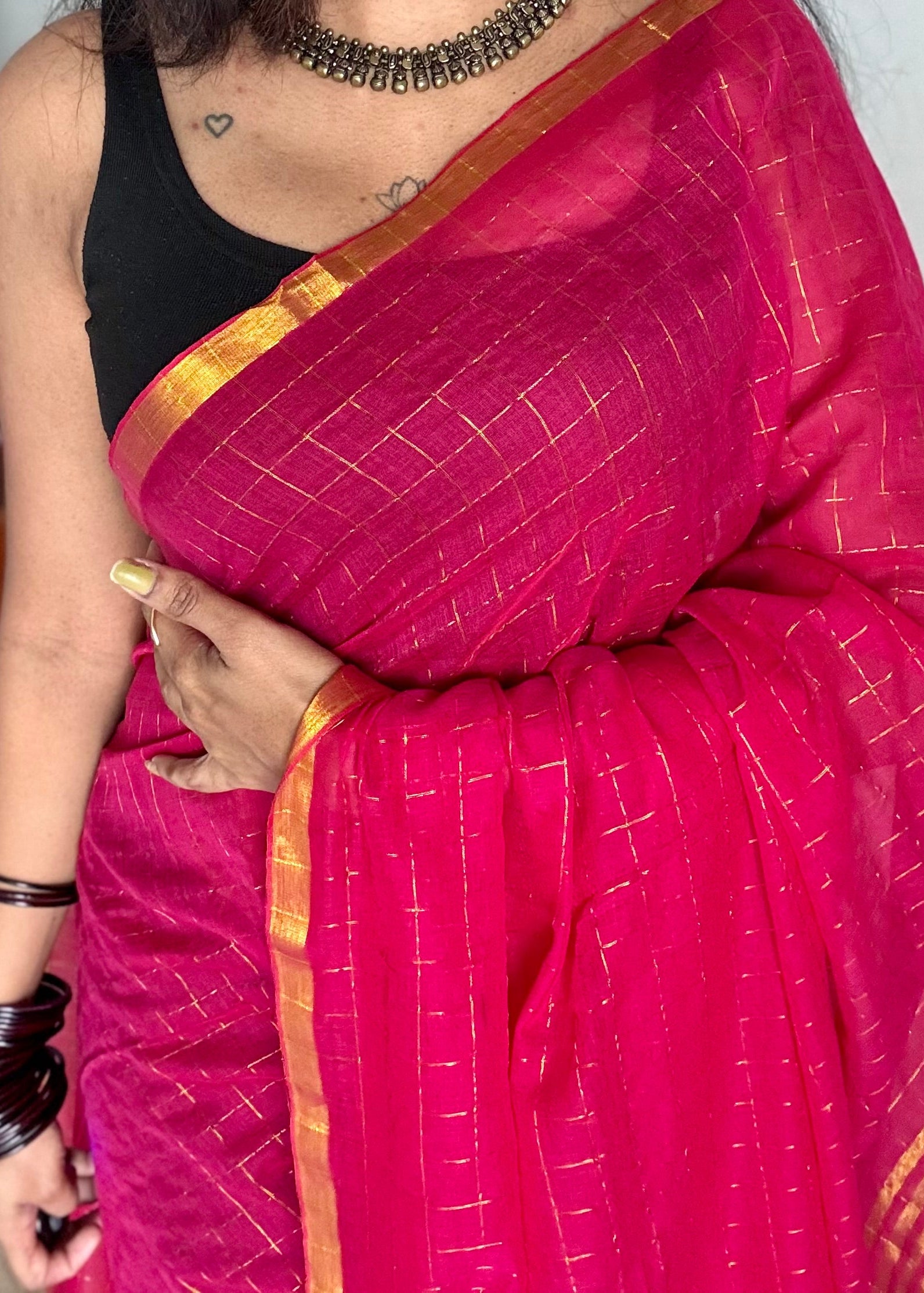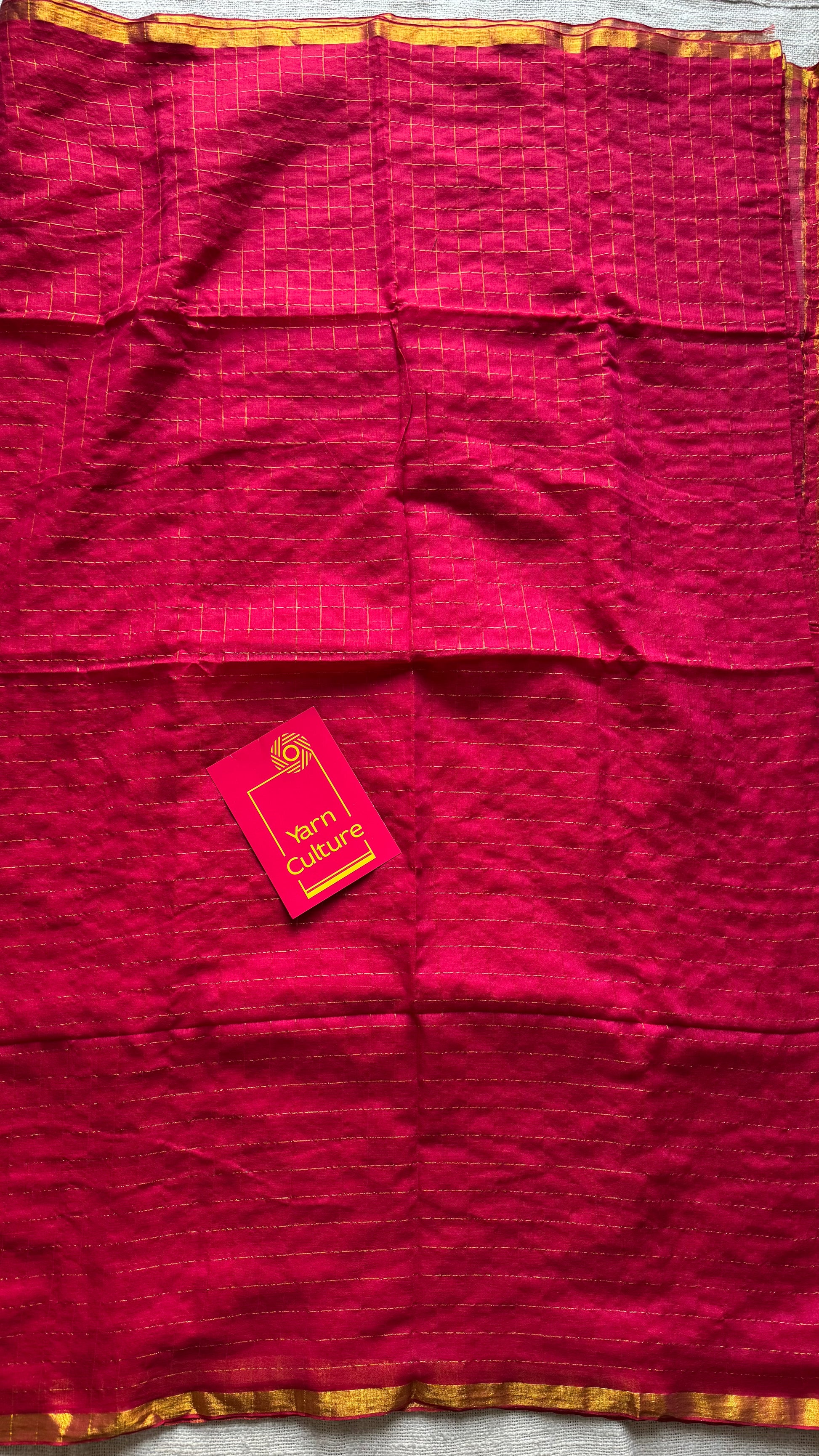 Hot pink mul with gold checks and zari border - YCBCMCJA05