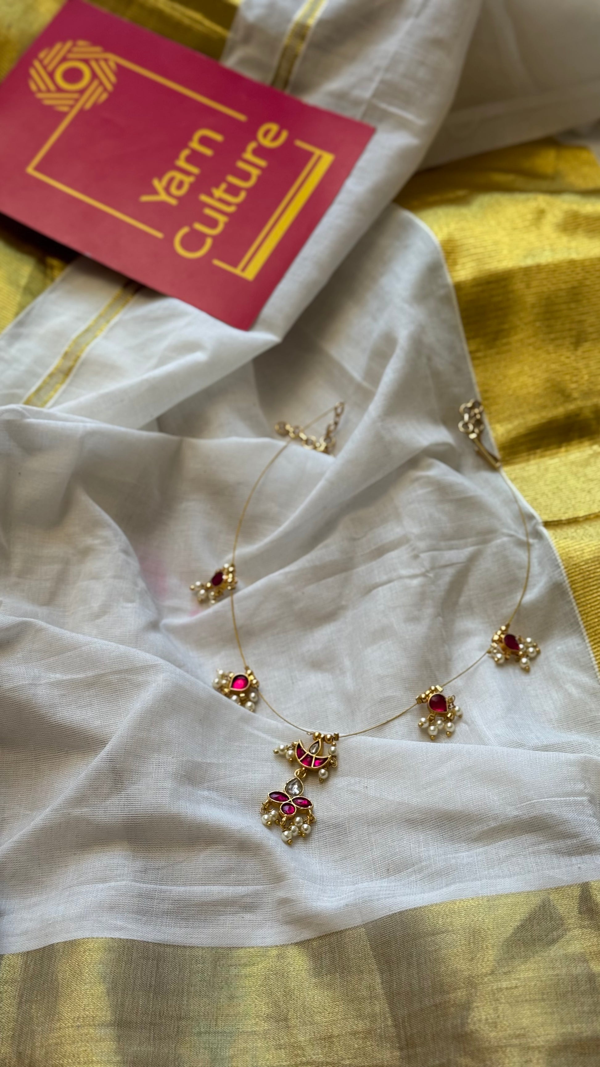Invisible neckchain with jadau kundan stones & pearl hangings - ruby, white, double pendant.