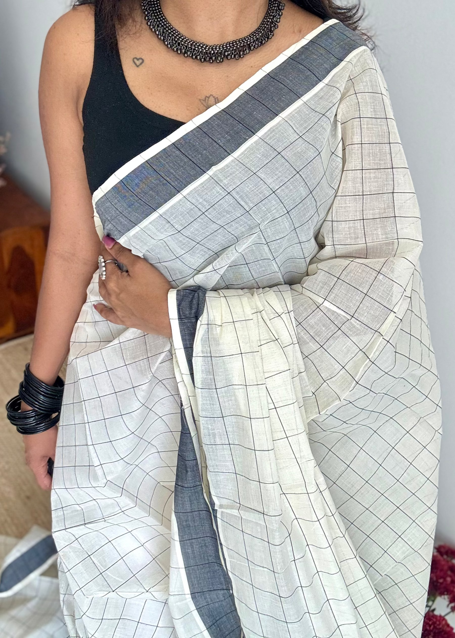 The classic Kerala cotton with the softness and classiness of simple checks, soft, easy to drape.