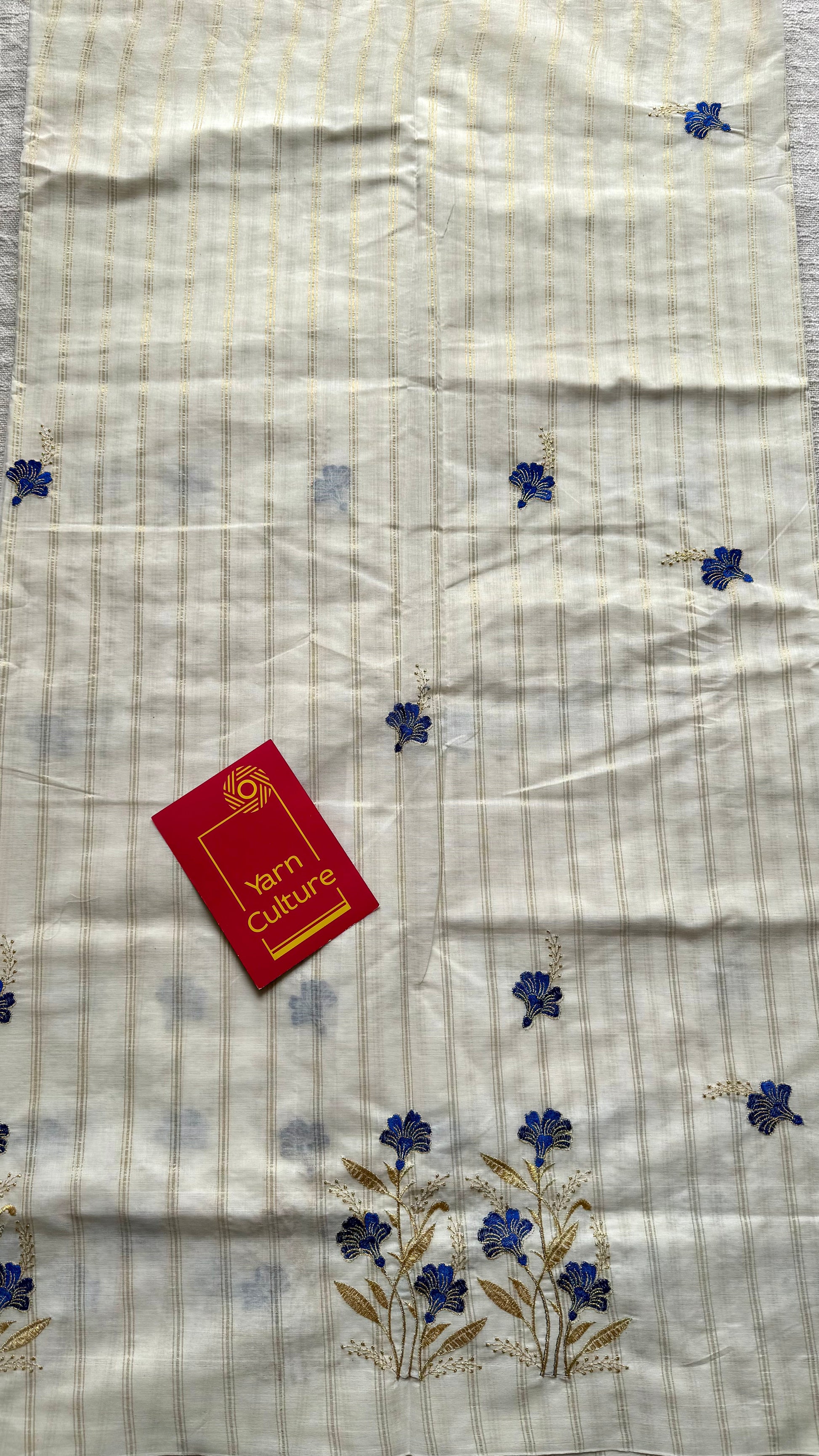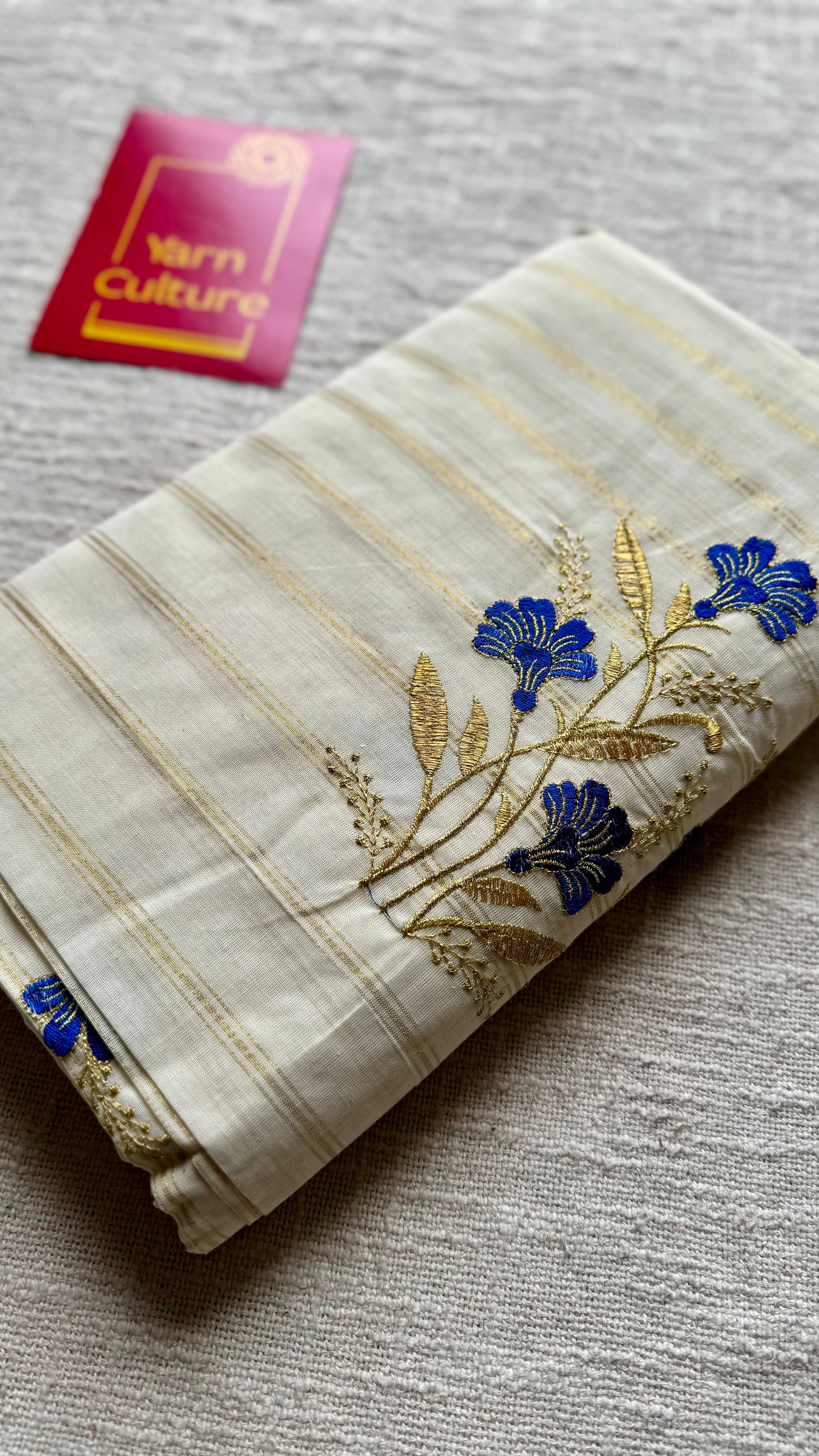 Ivory and gold with blue flower embroidery, striped zari, kerala cotton - YCON25KCSFE73