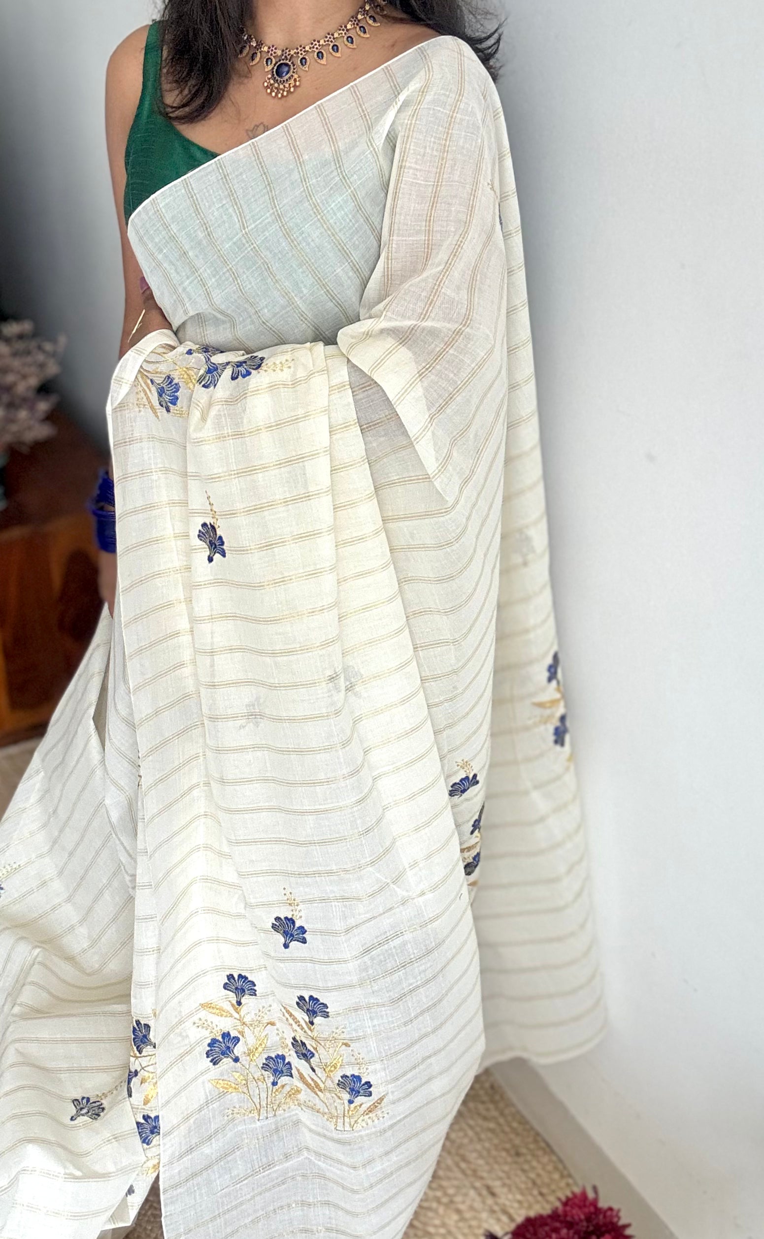 Kerala cotton with a twist of simple yet beautiful floral embroidery, in the backdrop of zari lines, minimally beautiful, soft, easy to drape.