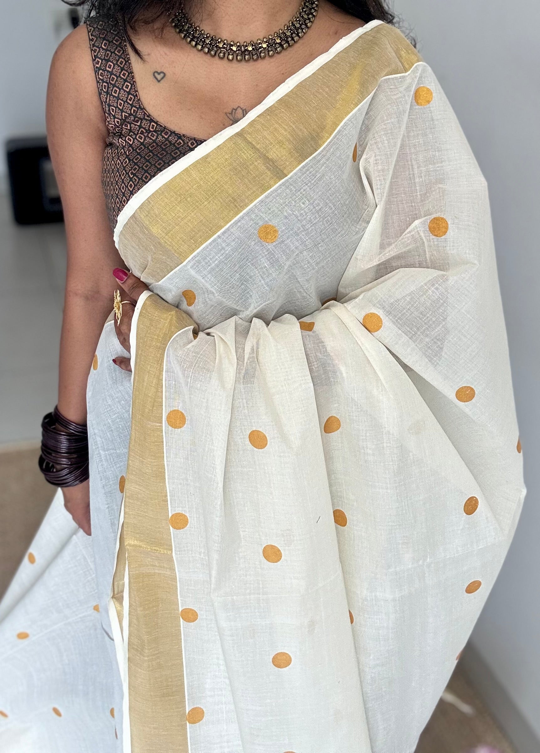 Kerala cotton, in ivory and gold with gold buttas, minimally beautiful, soft, easy to drape.