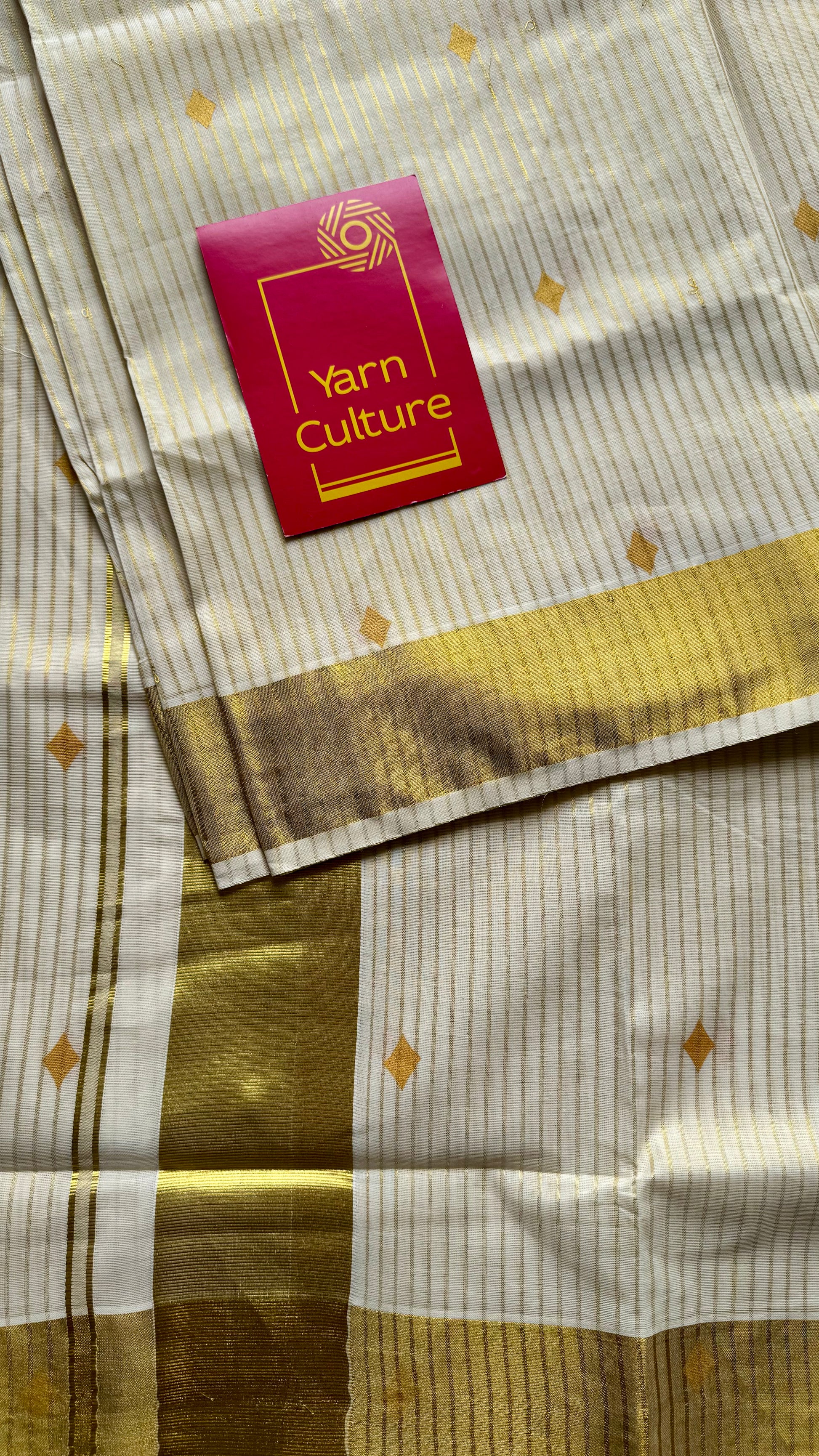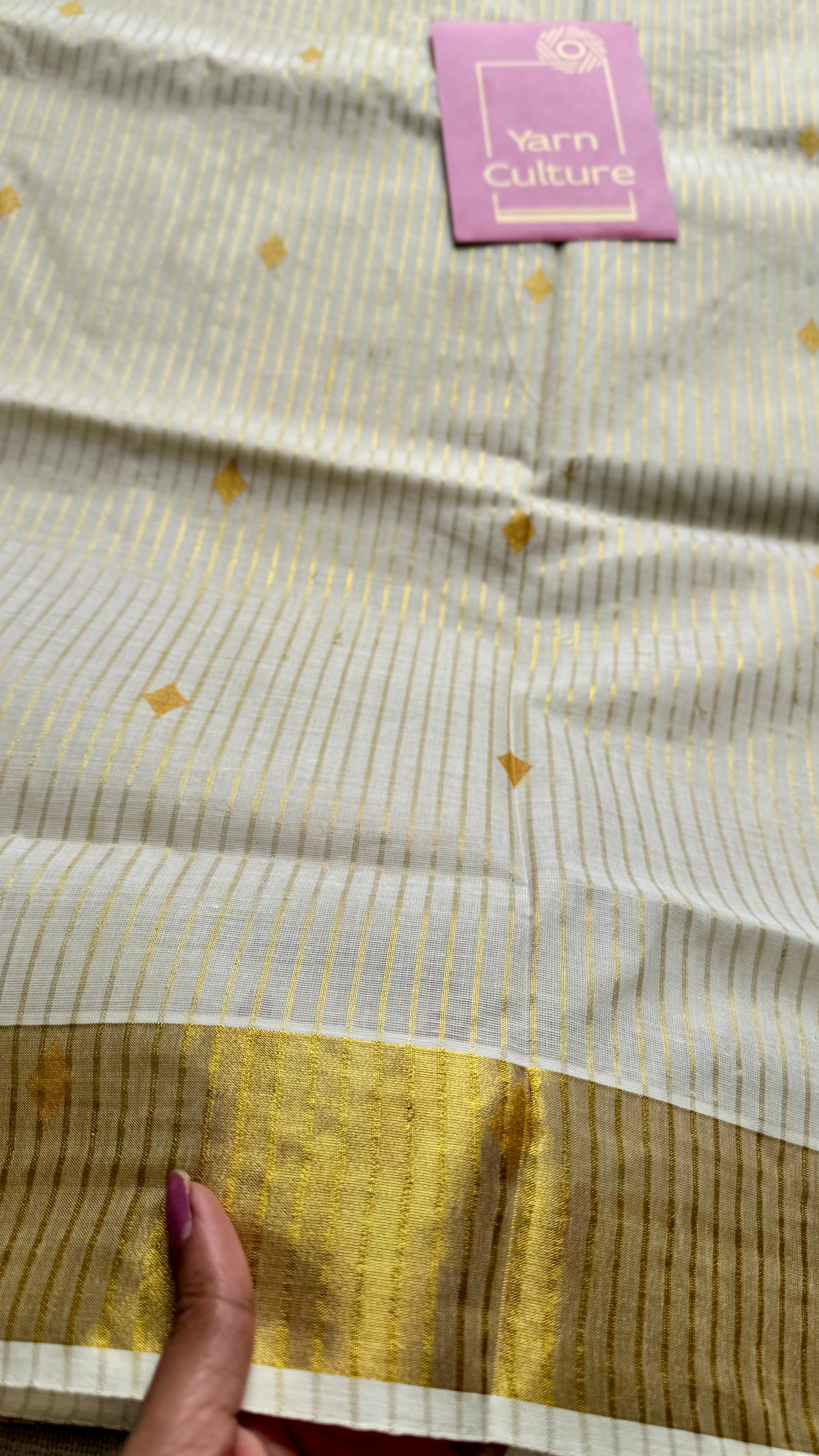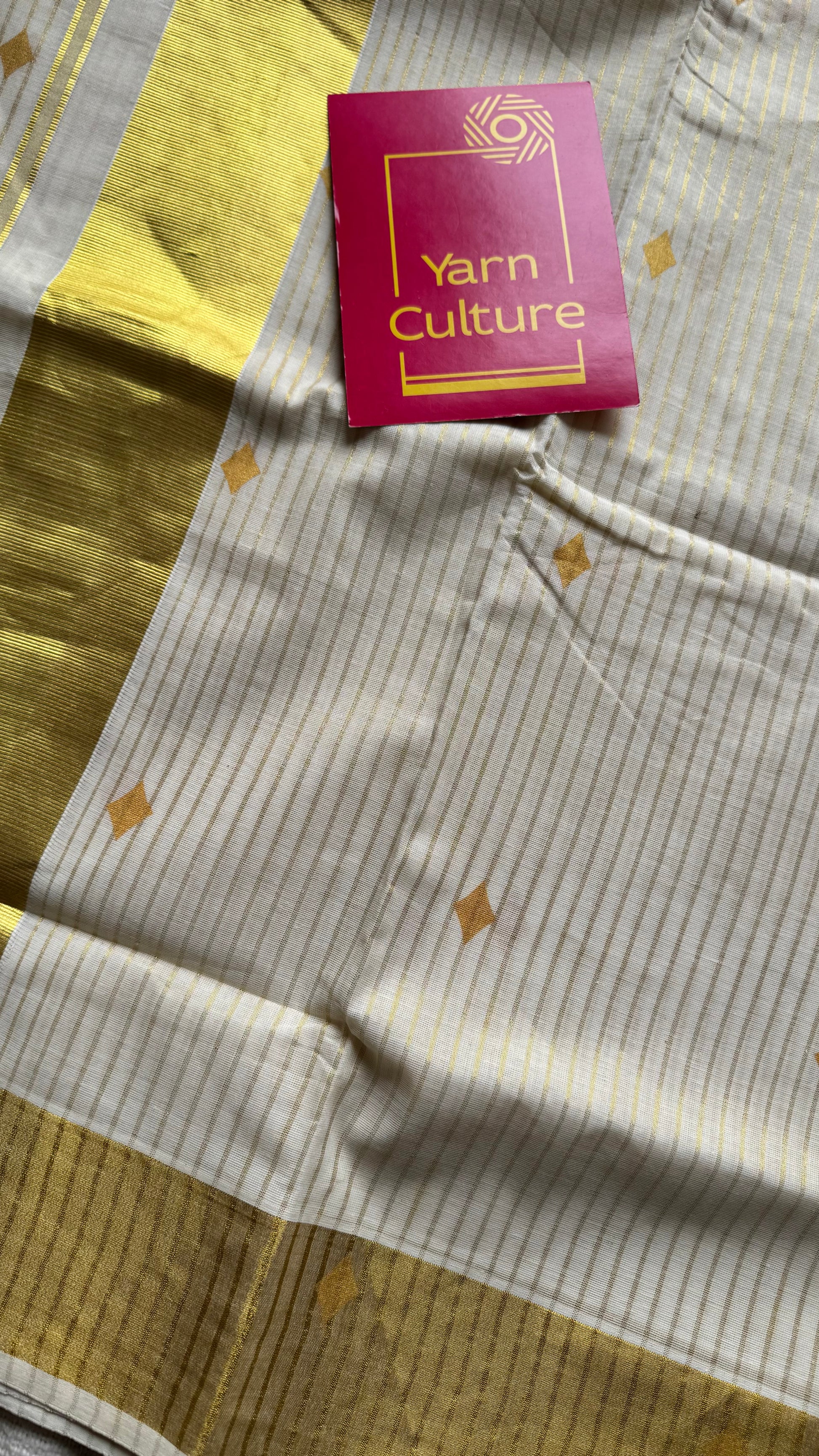 Ivory and gold with buttas, striped zari, kerala tissue cotton - YCON25KCS76