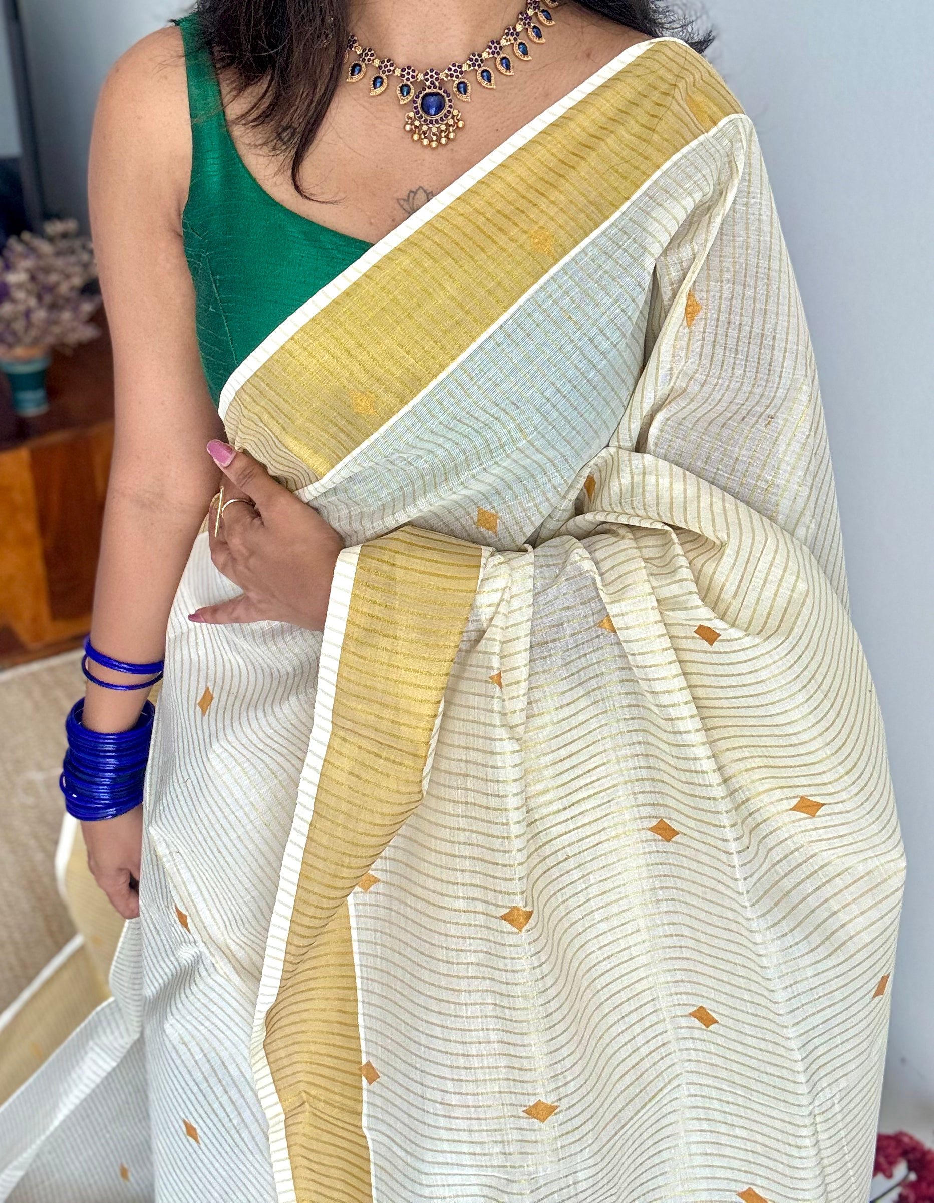 Kerala cotton tissue blend, in ivory and gold with yellow buttas, in the backdrop of zari lines, minimally beautiful, soft, easy to drape.