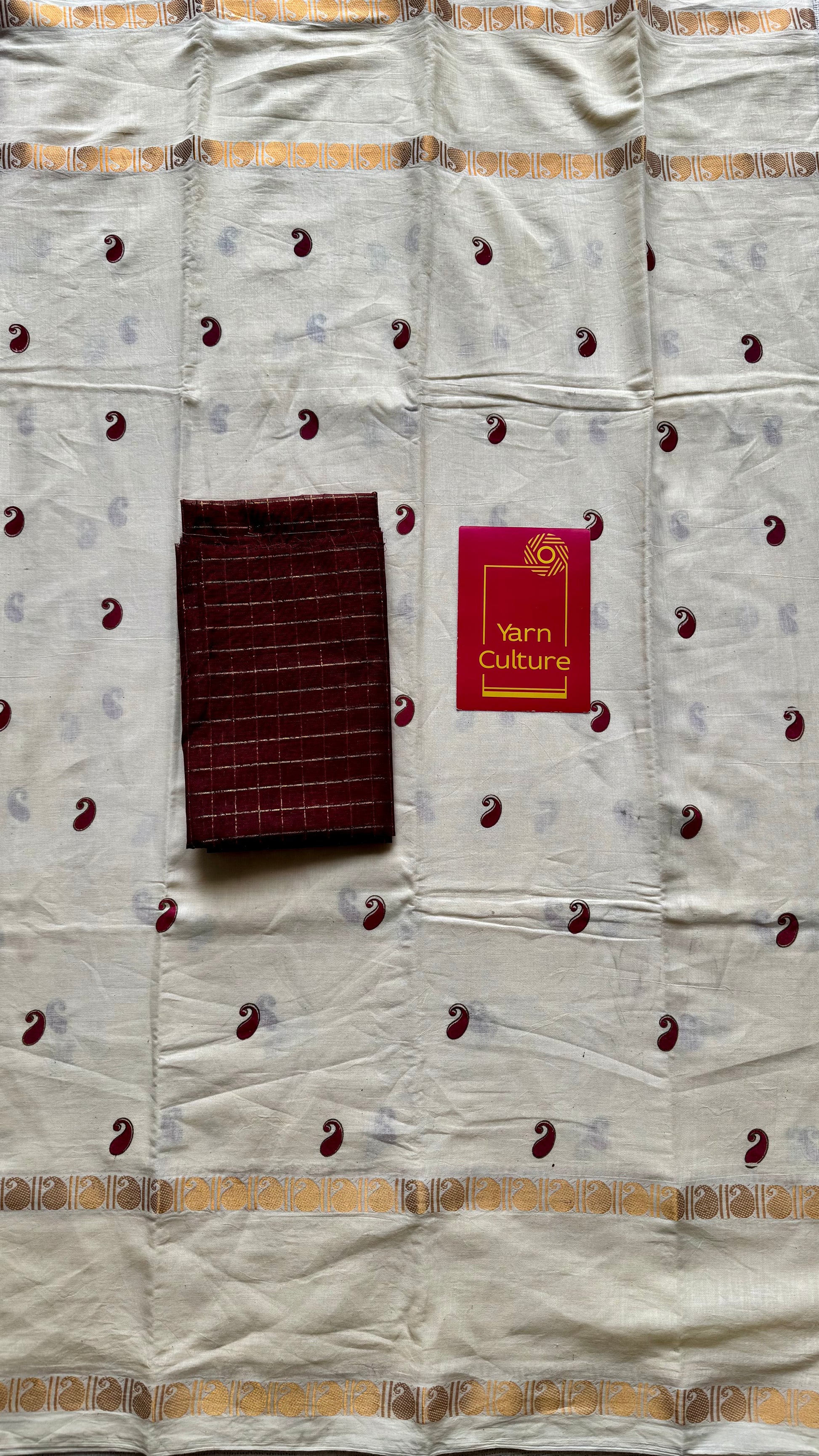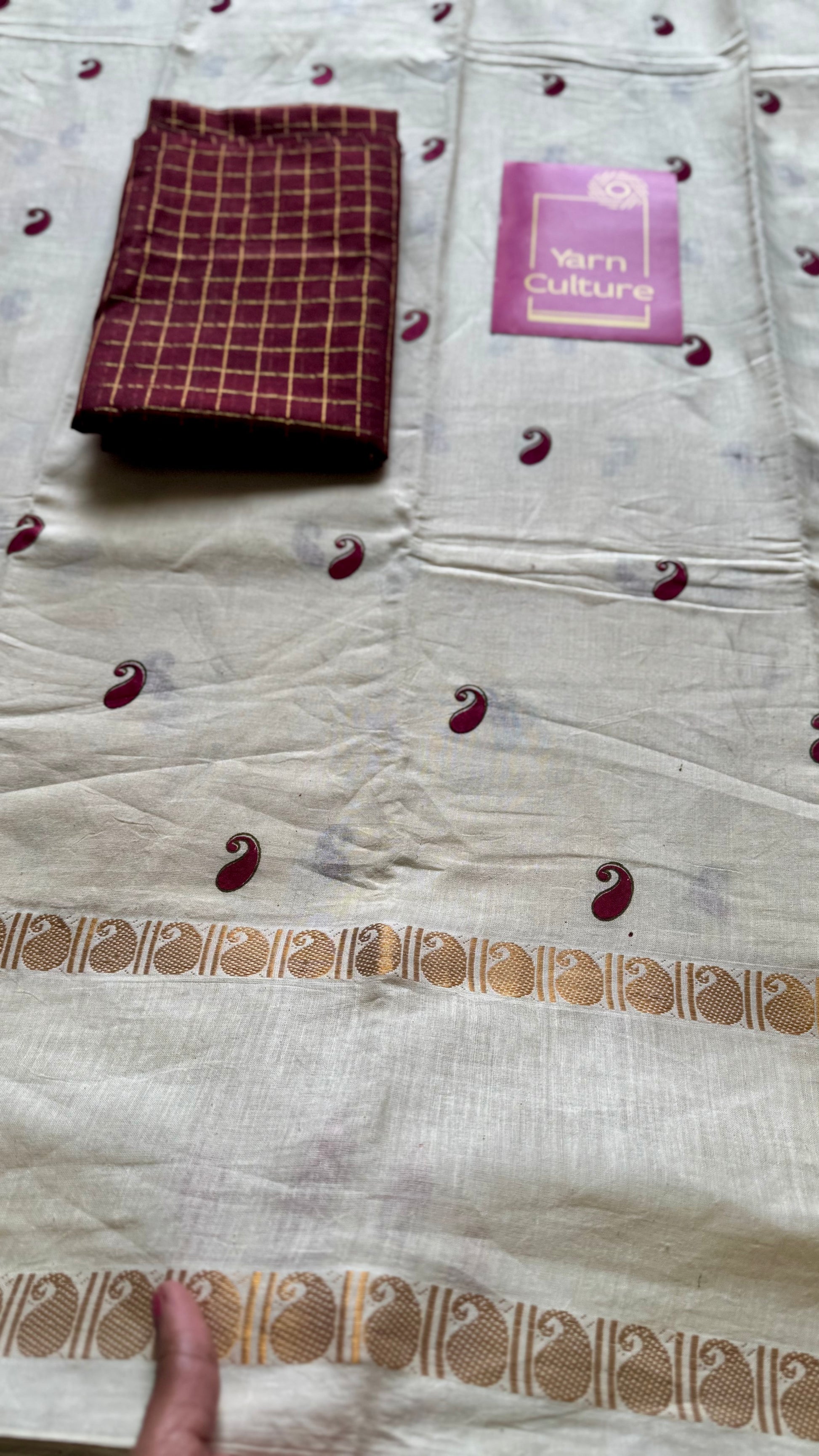Ivory and Gold with paisley motif block printed buttas, zari border, soft Madurai cotton - YCON25MC268