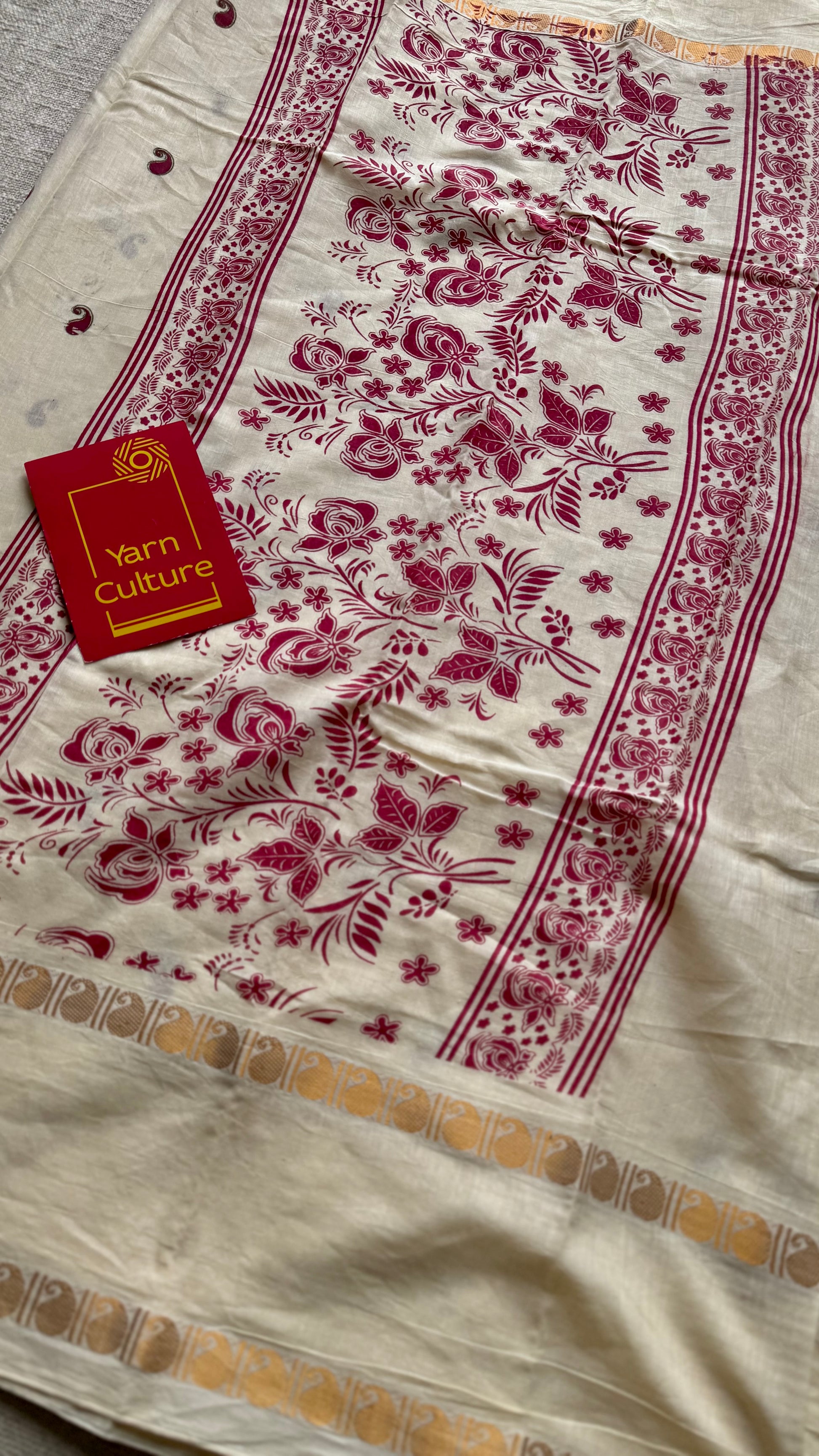 A beautiful and rare motif in Madurai cotton without being starched, making it as soft as possible. Paisley mango motifs are block printed throughout in maroon, and block print floral pattern adorns the pallu. Border comes with the same motif woven in gold. Perfect for Onam if you love minimal patterns.