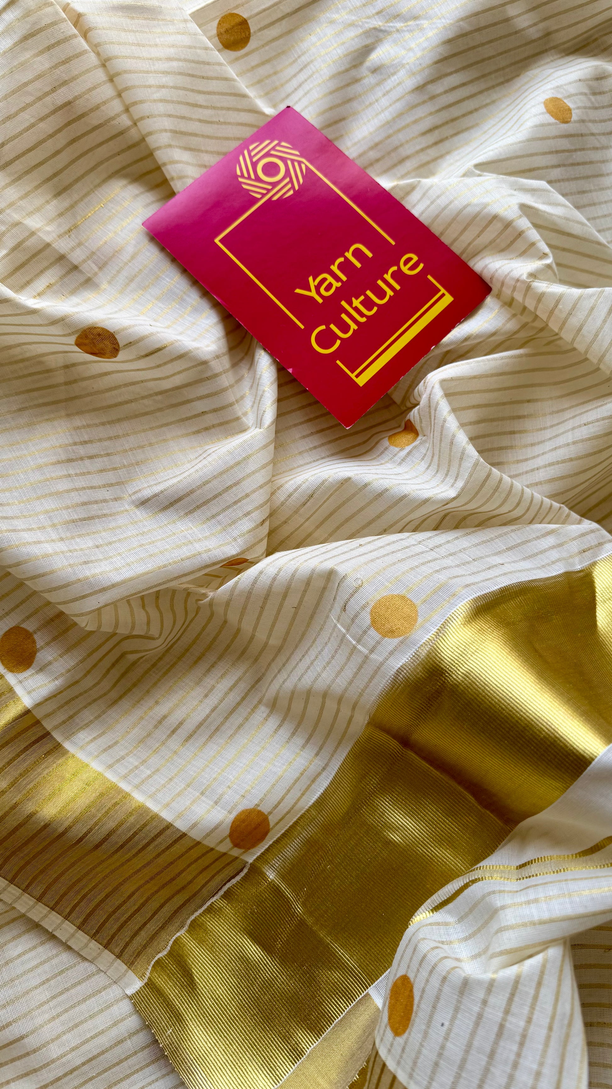 Ivory and gold with polka buttas, striped zari, kerala cotton - YCON25KCSPD77