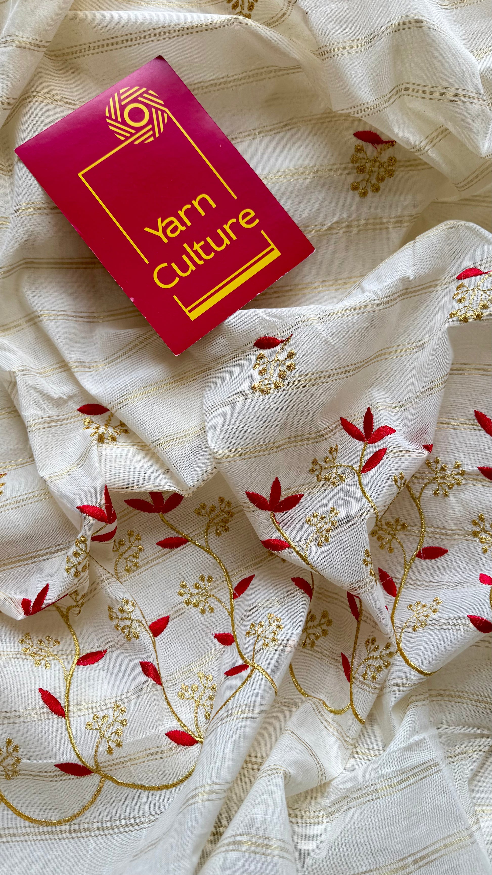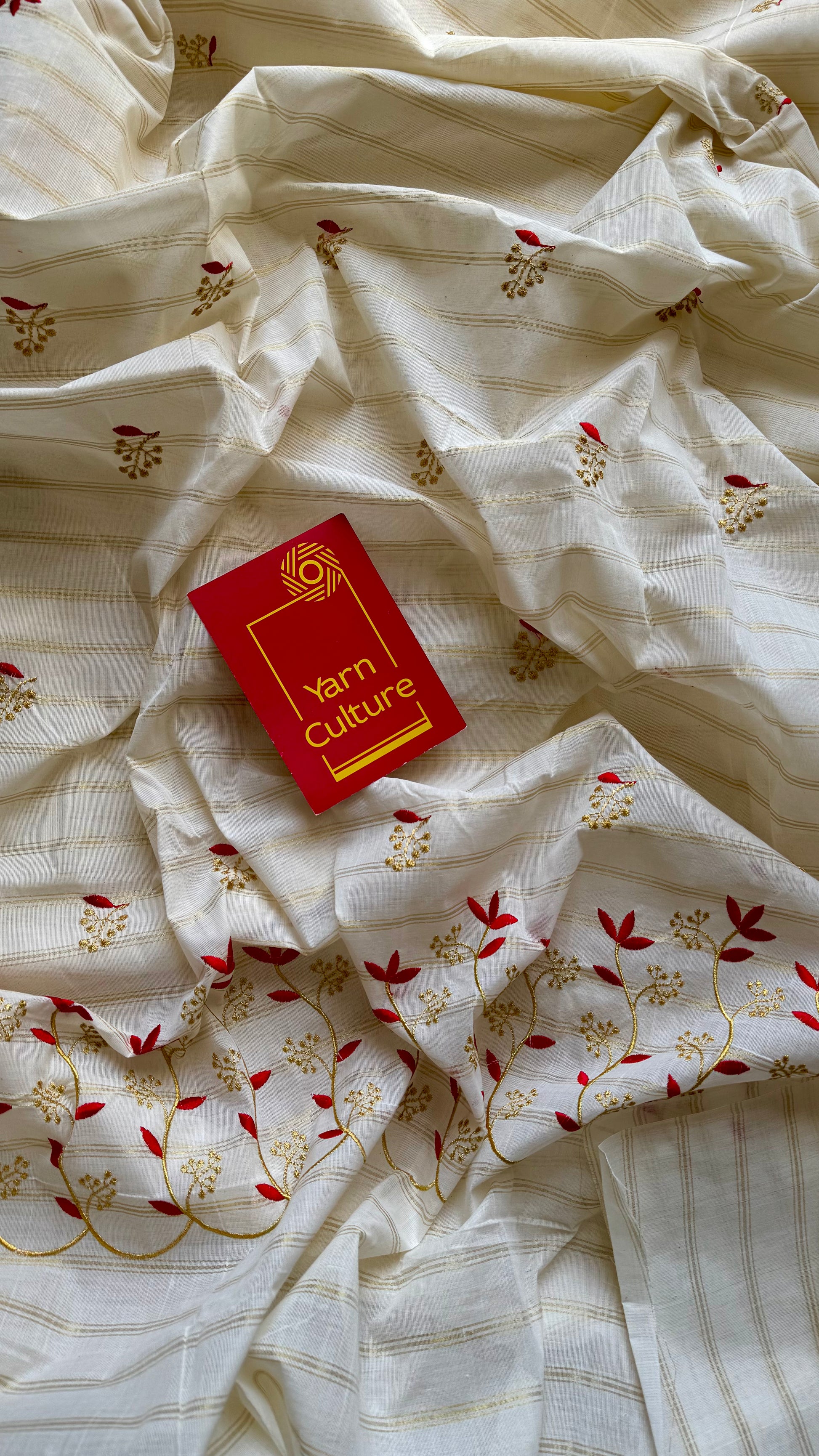 Ivory and gold with red small flower embroidery, striped zari, kerala cotton - YCON25KCSFE74