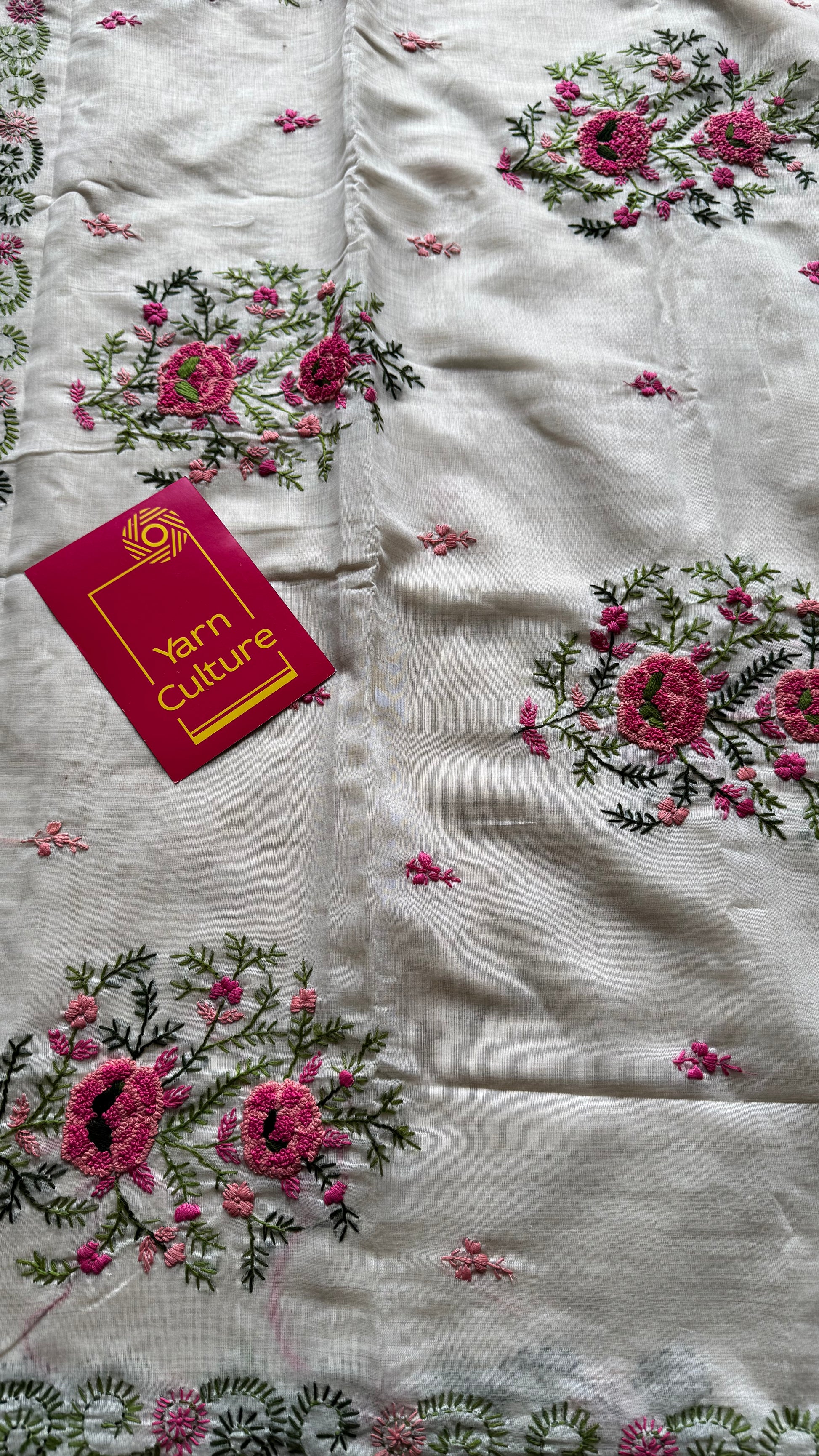 Ivory cotton silk with floral kantha threadwork - YCON25BCKW32