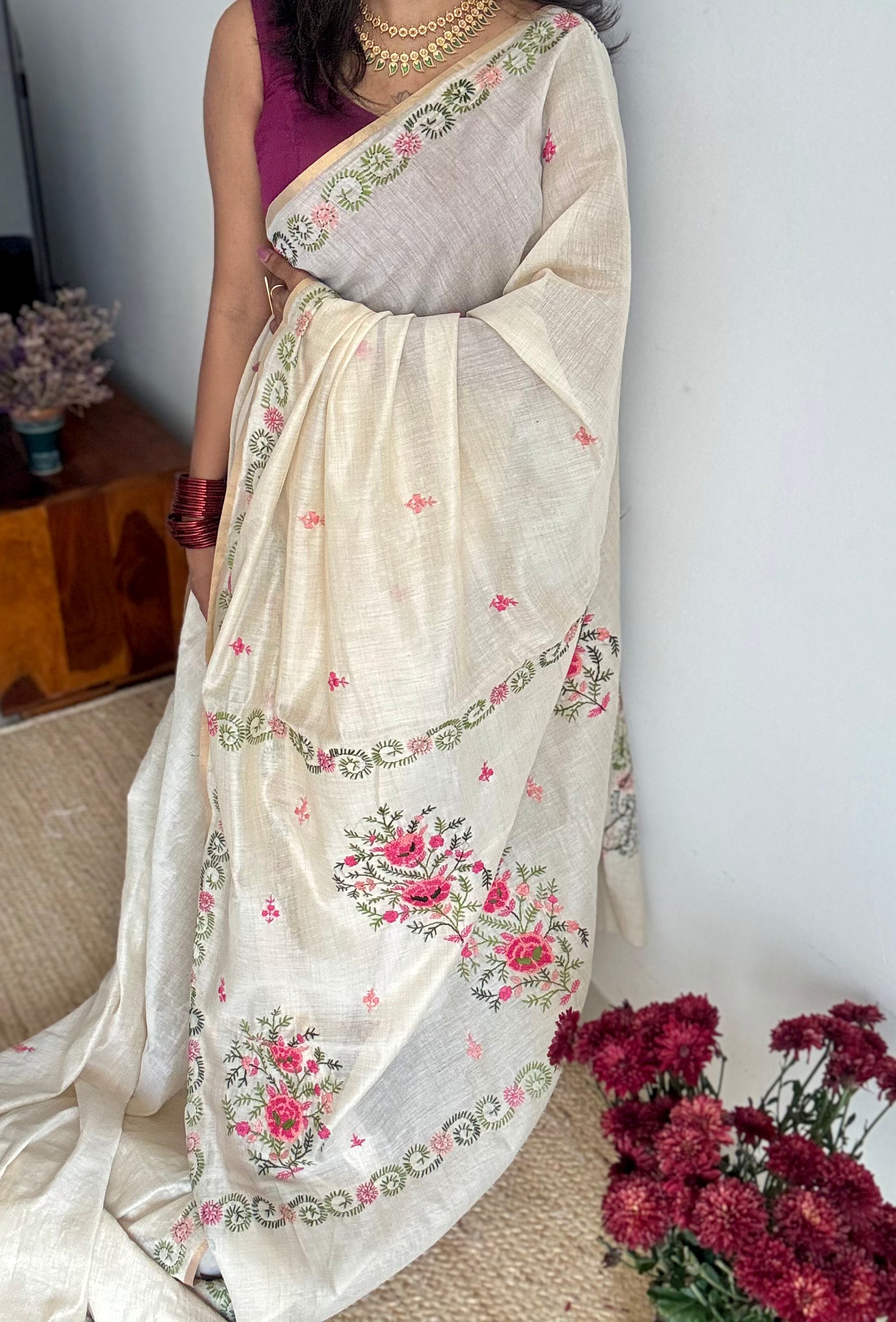 Ivory cotton silk with floral kantha threadwork and thin gold border, soft and easy to drape. Heavy work is on the pallu, followed by minimal thread motifs throughout the body.