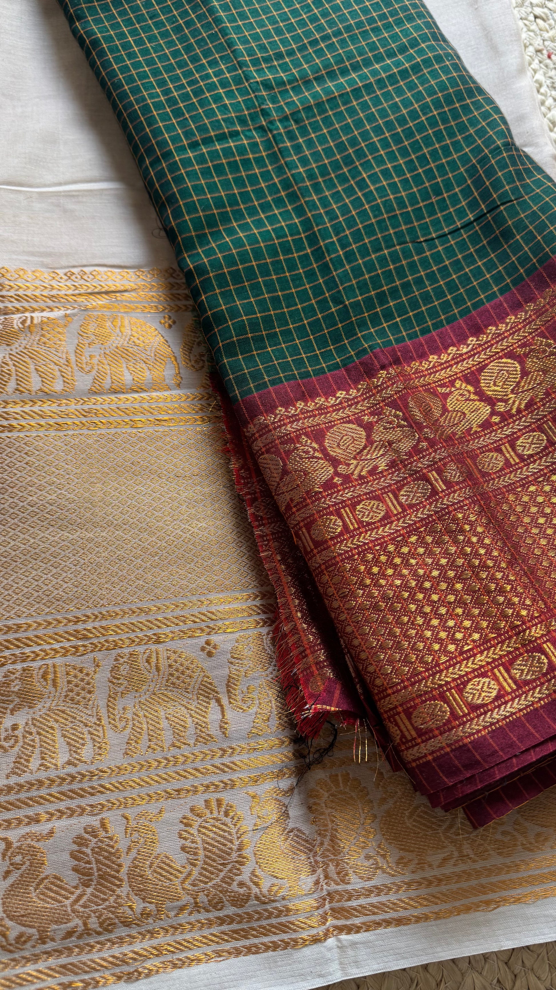 Skirt and blouse fabric - 6m (tgreen checks) , dupatta fabric - 3m (ivory gold)