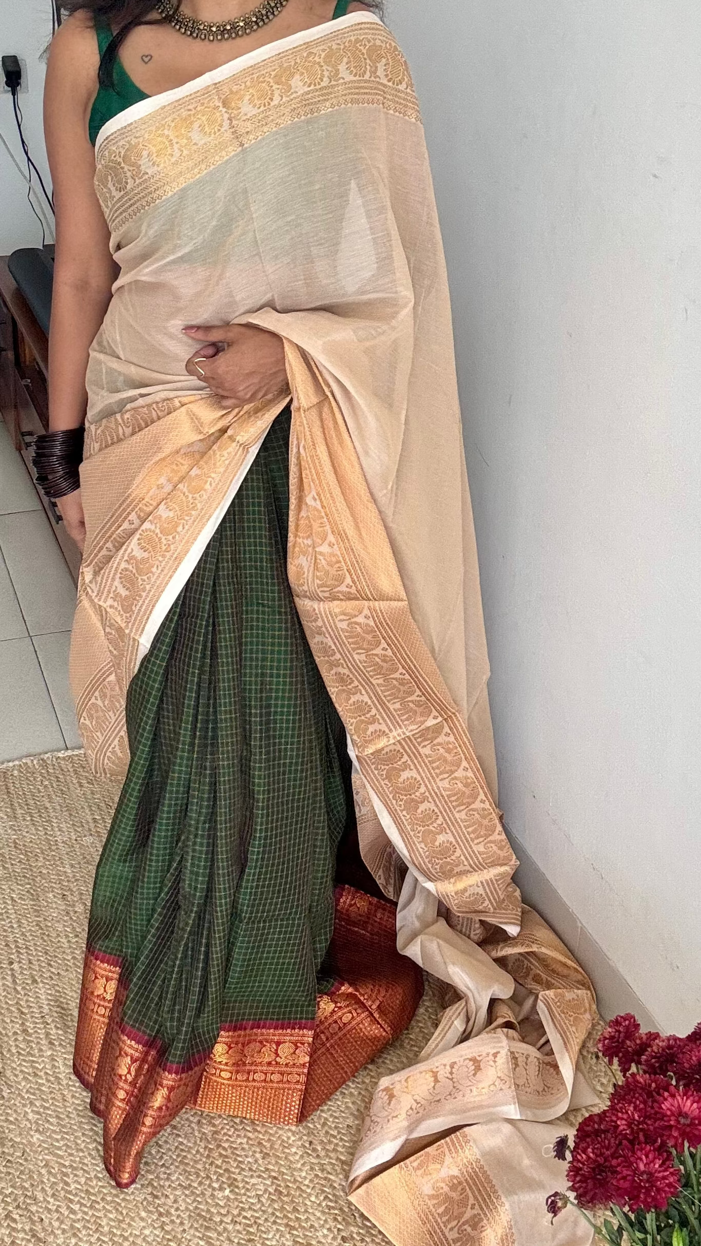 Ivory gold - Green half saree (dhavani), unstitched material, soft cotton - YCAHSN20